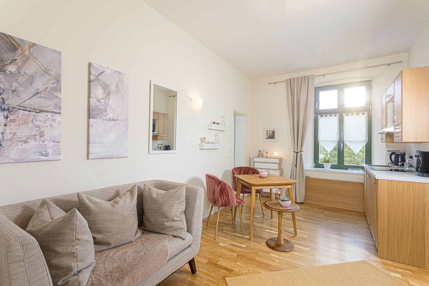 Romantisch und garantiert ungestört ist unser "Romantik" - Apartment 1 für Verliebte. Bestens ausgestattet verleben Sie Ihren Urlaub zu Zweit in einem hübschem Wohnraum mit moderner Küche und WLAN im Erdgeschoss. Das Schlafzimmer ist mit komfortablen Betten und blickdichten Vorhängen ausgestattet. Im Duschbad verwöhnt Sie eine schnuckelige finnische Sauna. Hier können Sie gerne gegen extra Gebühr entspannen.