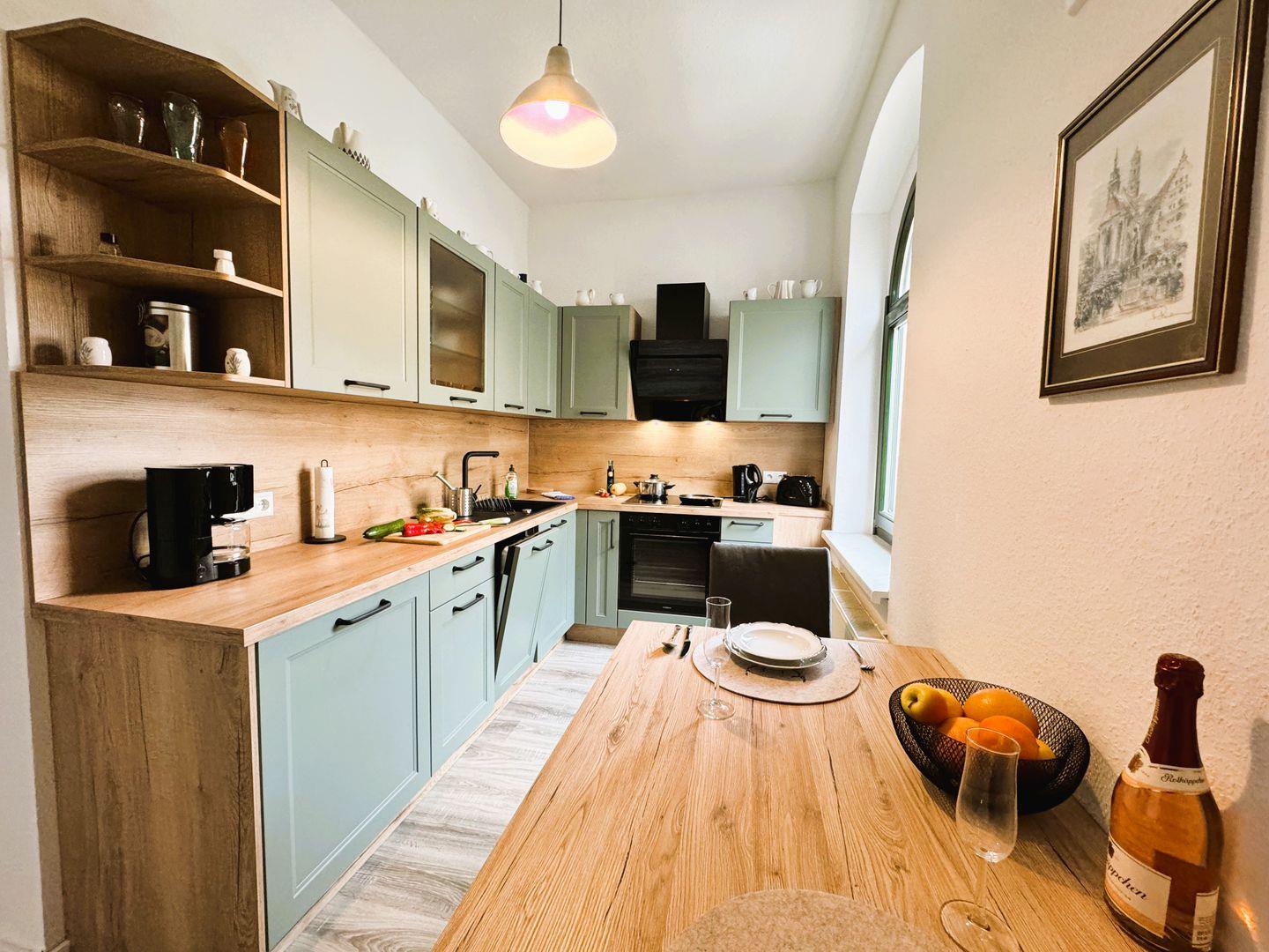 Eine moderne, voll ausgestattete Küche, das helle und gemütliche Wohnzimmer mit Schlafcouch und das Schlafzimmer mit Boxspring-Doppelbett stehen für Ihren Urlaub bereit.