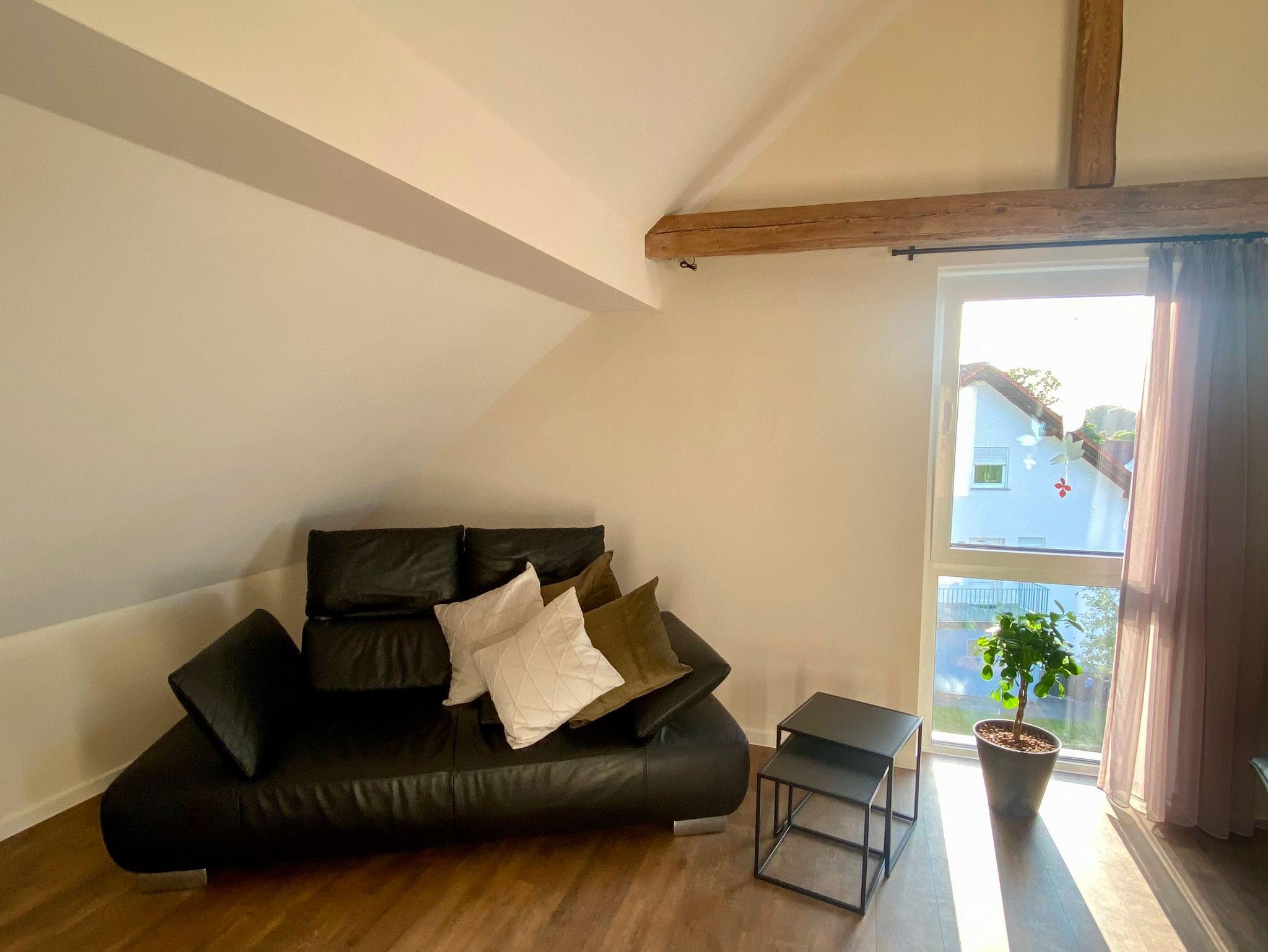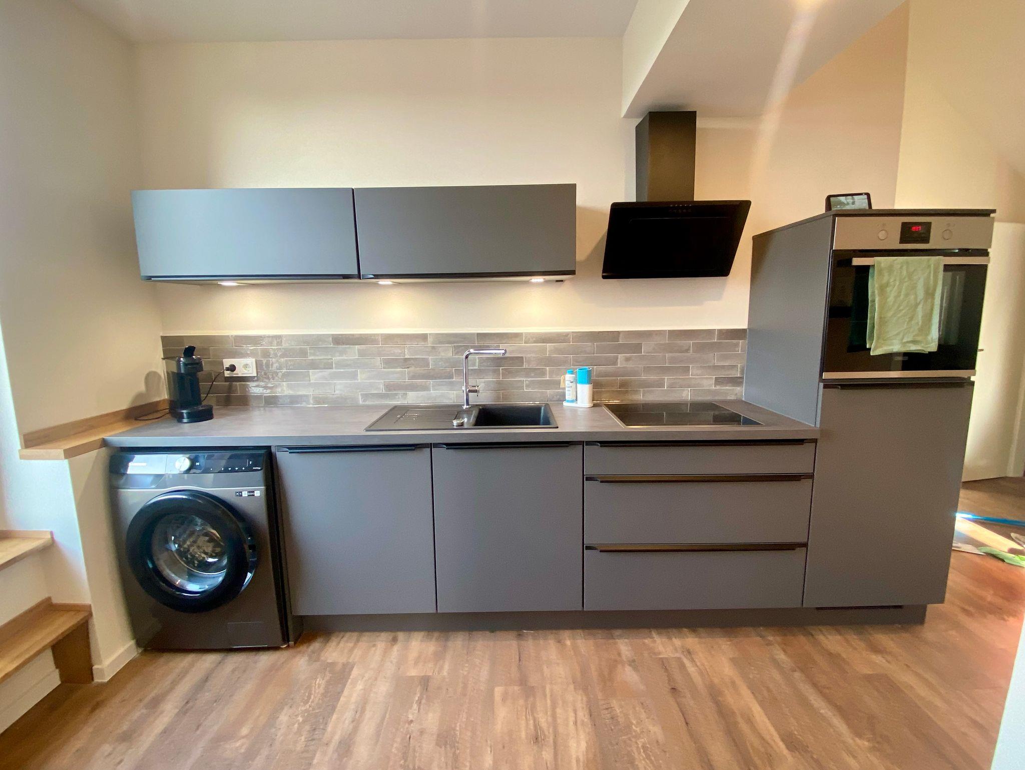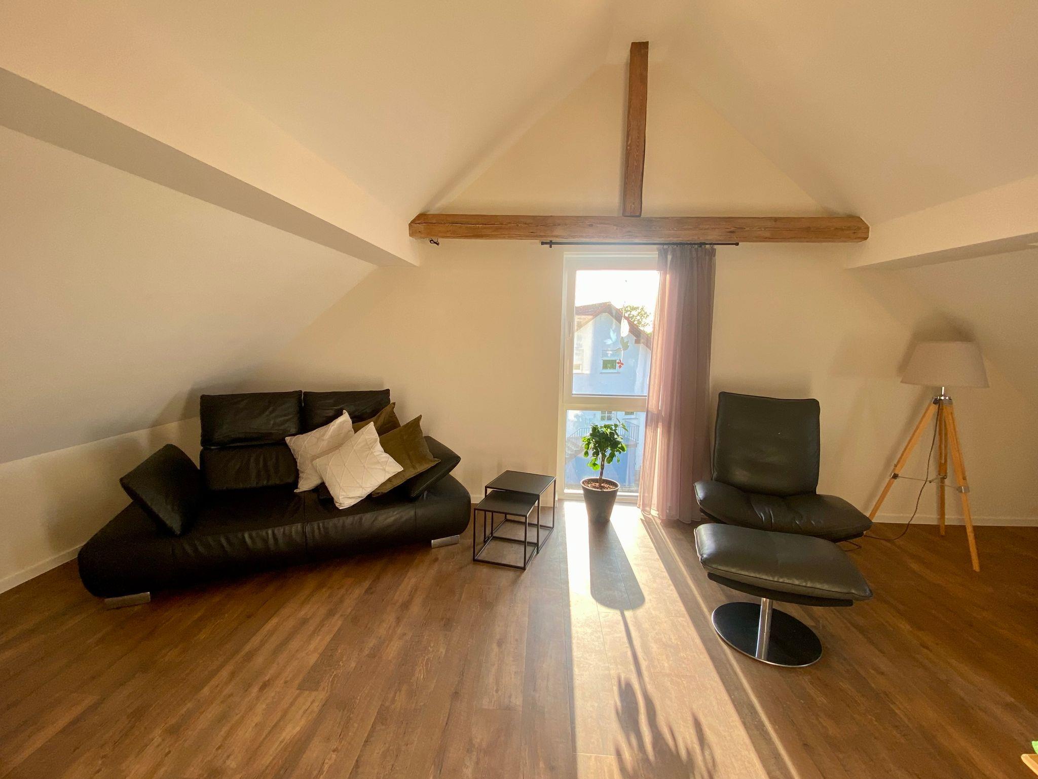 Neben der voll ausgestatteten Küche mit Waschmaschine befindet sich angrenzend ein Essbereich und Wohnzimmer mit Arbeitsbereich. Hier können Sie gemütlich und entspannt den Abend ausklingen lassen.