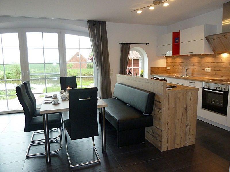 ERDGESCHOSS: Wohn- und Essbereich mit Kaminofen, Kabel-TV und HiFi-Anlage. KÜCHE mit Ceranfeld und Backofen, Mikrowelle, Geschirrspülmaschine und Kühlschrank mit Gefrierfach, Kaffeemaschine und Kaffeepadmaschine. Das moderne, hochwertige Badezimmer mit Infrarotwärmekabine (2 Personen), Dusche und WC. Vom Wohnzimmer aus Austritt durch das große Rundbogenfenster auf die Terrasse mit traumhaften Blick über die Felder und das Eilsumer Sieltief. Zweite Terrasse vorhanden, ebenso eine große Gartenhütte, wo Sie auch Ihre mitgebrachten Fahrräder abstellen können. Ein Schlafzimmer mit Doppelbett befindet sich neben dem Bad im Erdgeschoss. Verdunklungsmöglichkeiten in den Schlafräumen sind vorhanden.