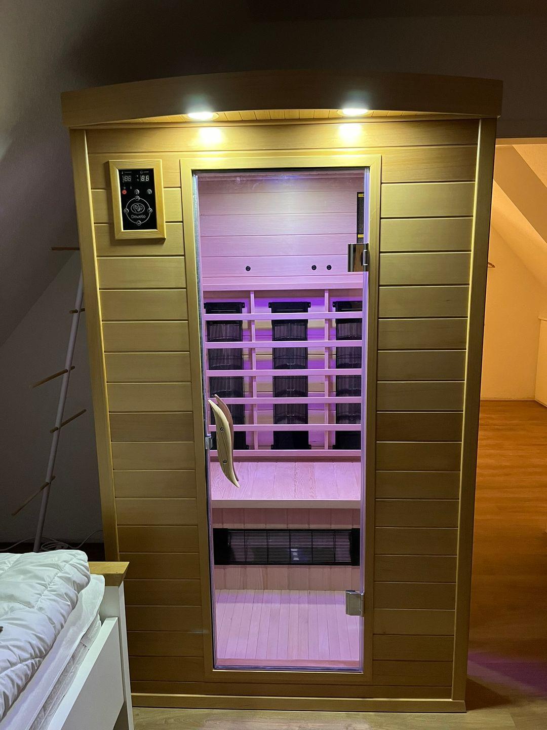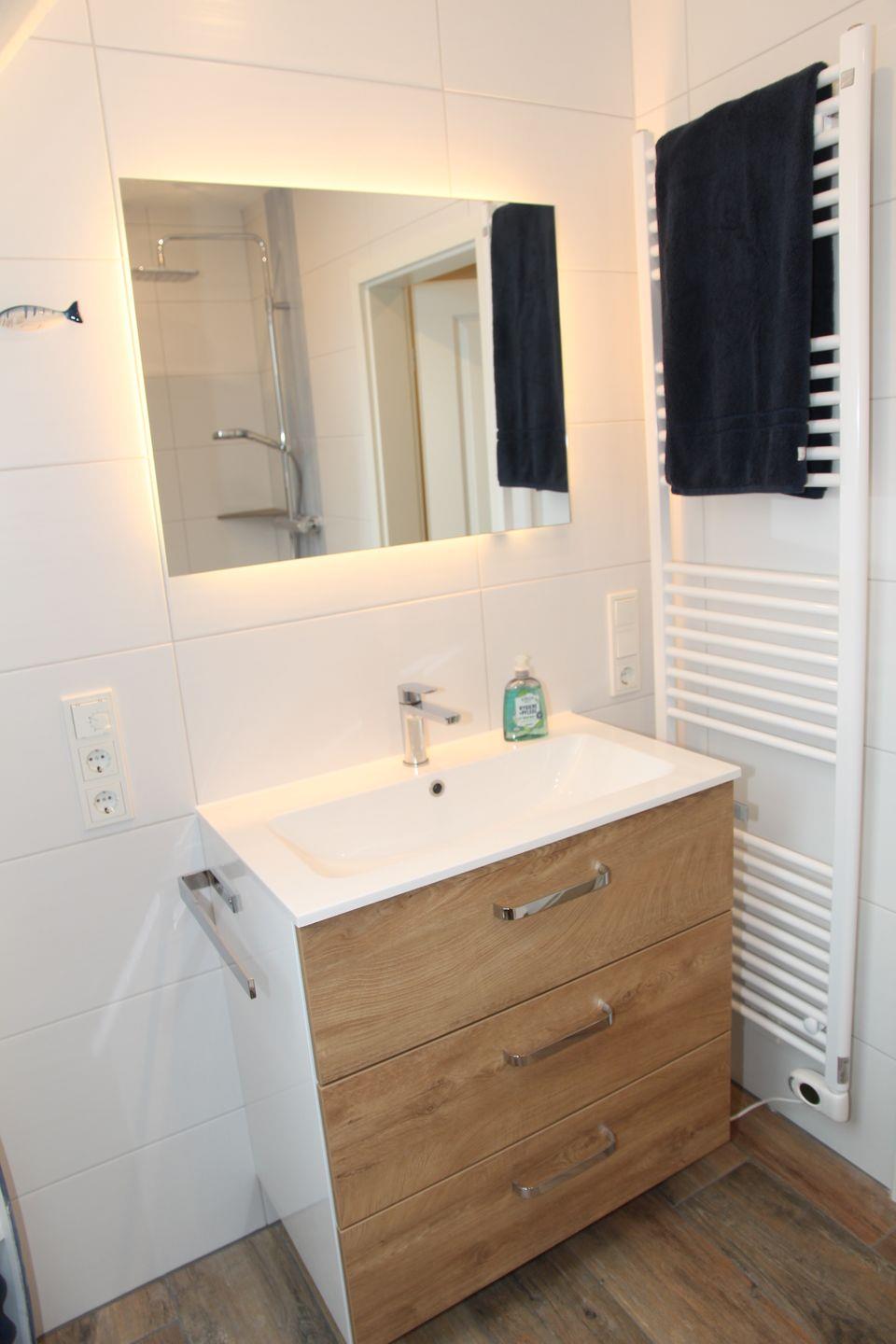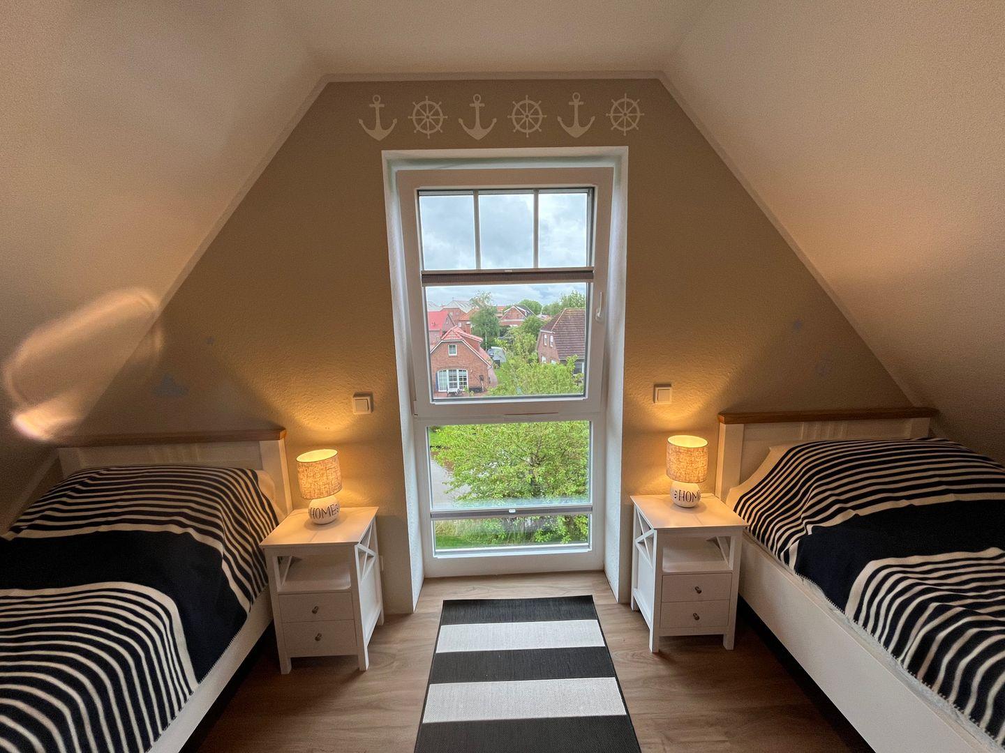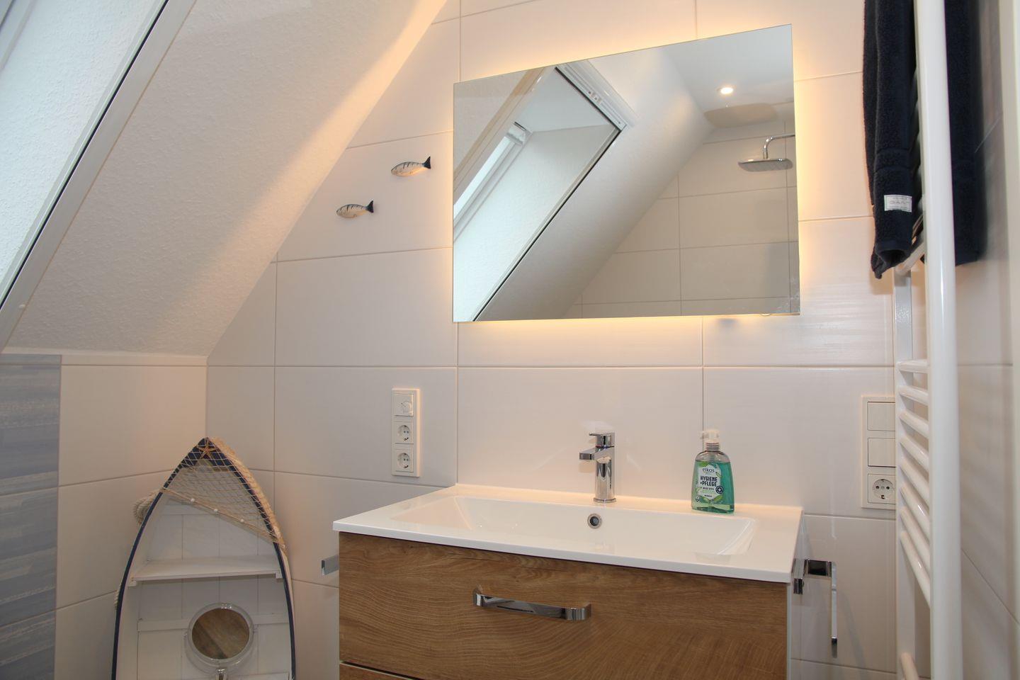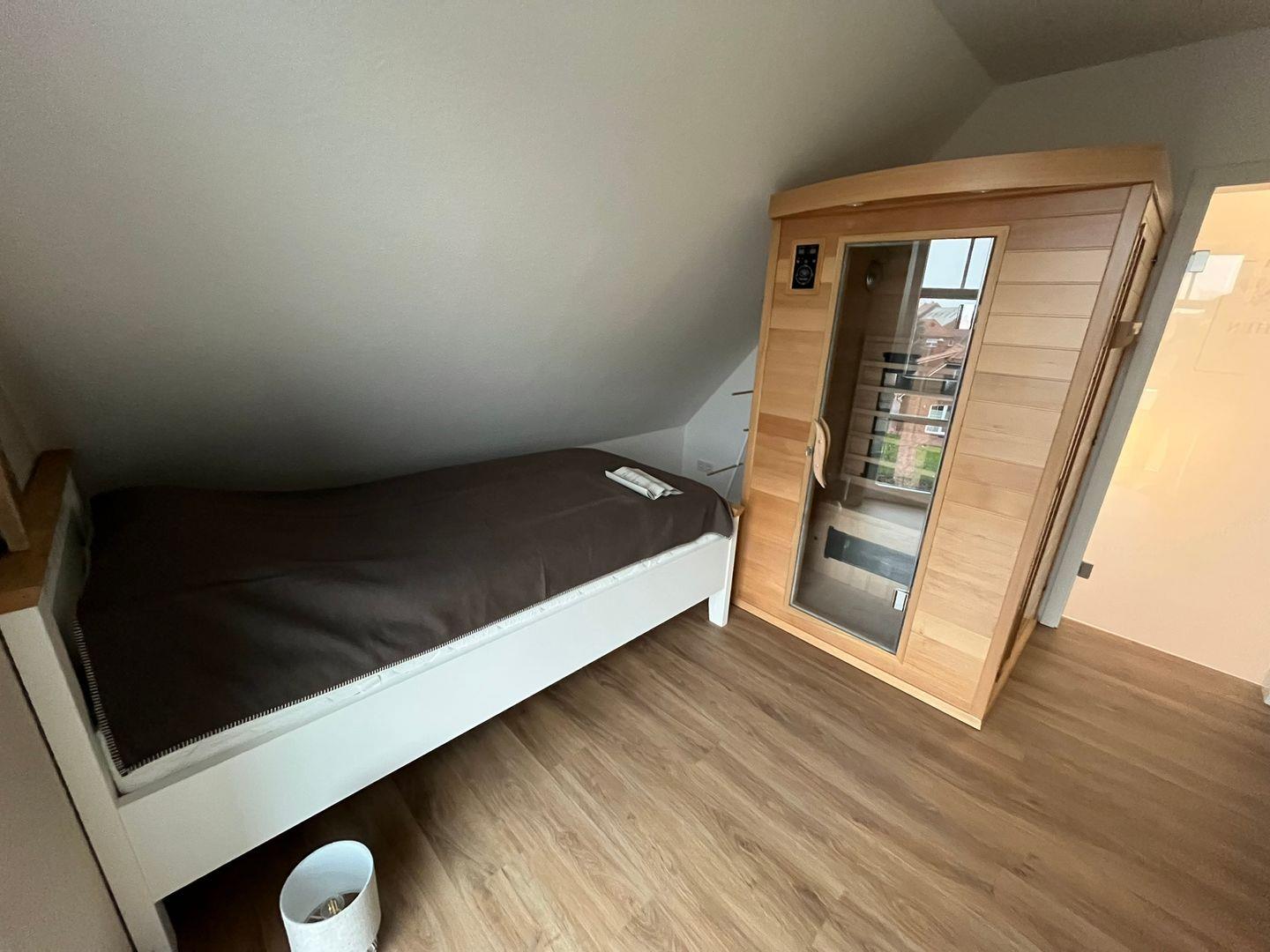 Im durch eine wunderschöne Holztreppe zu erreichenden Dachgeschoss befindet sich ein weiteres Badezimmer mit Dachflächenfenster, Dusche mit flachem Einstieg, Waschbecken, Fön, Handtuchheizkörper und WC. Hier finden Sie weiterhin das zweite Schlafzimmer mit zwei Einzelbetten, Smart-TV, Aufbewahrungsmöglichkeiten und der Infrarotkabine. Die fünfte Person kann auf einem Schlafsessel nächtigen.