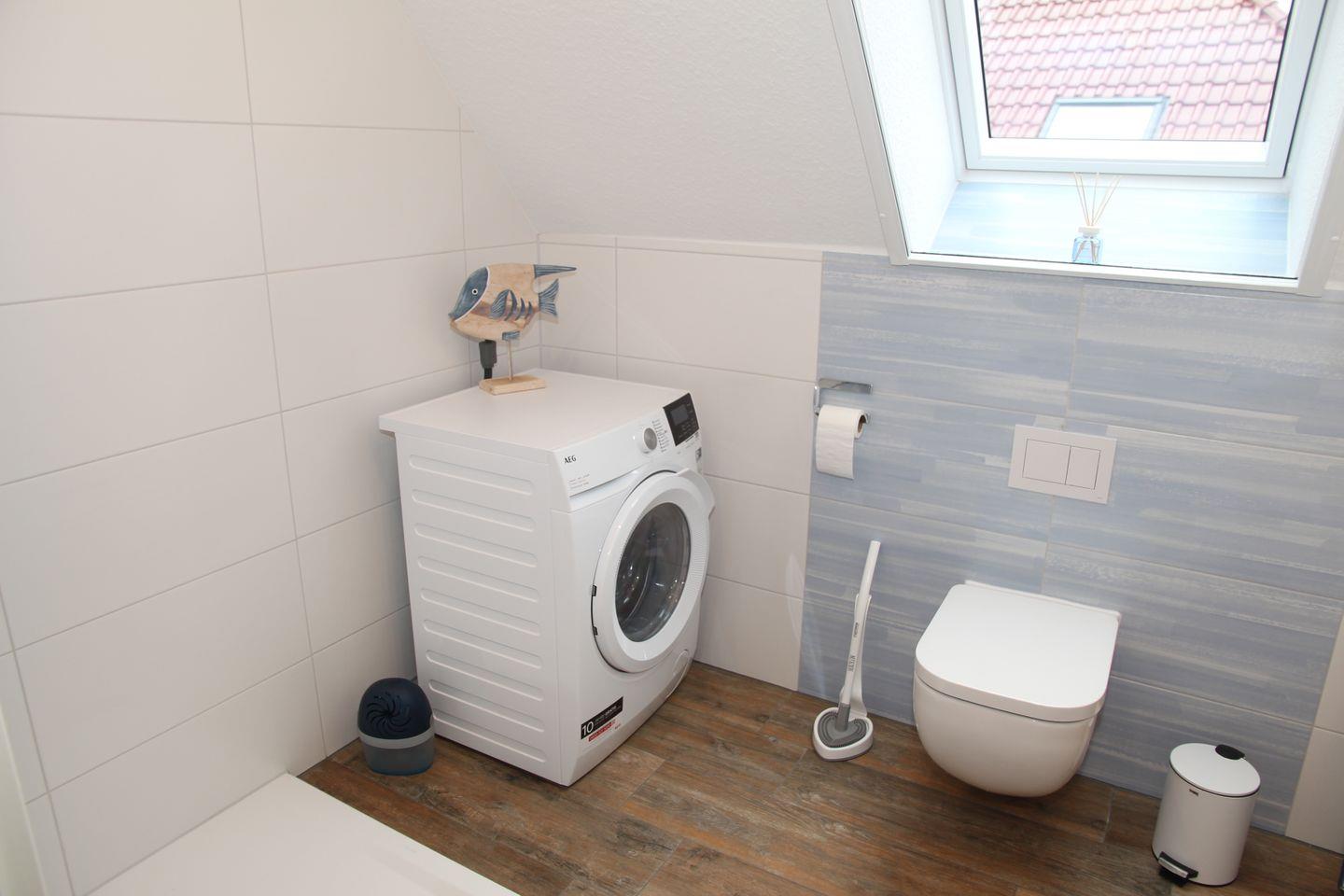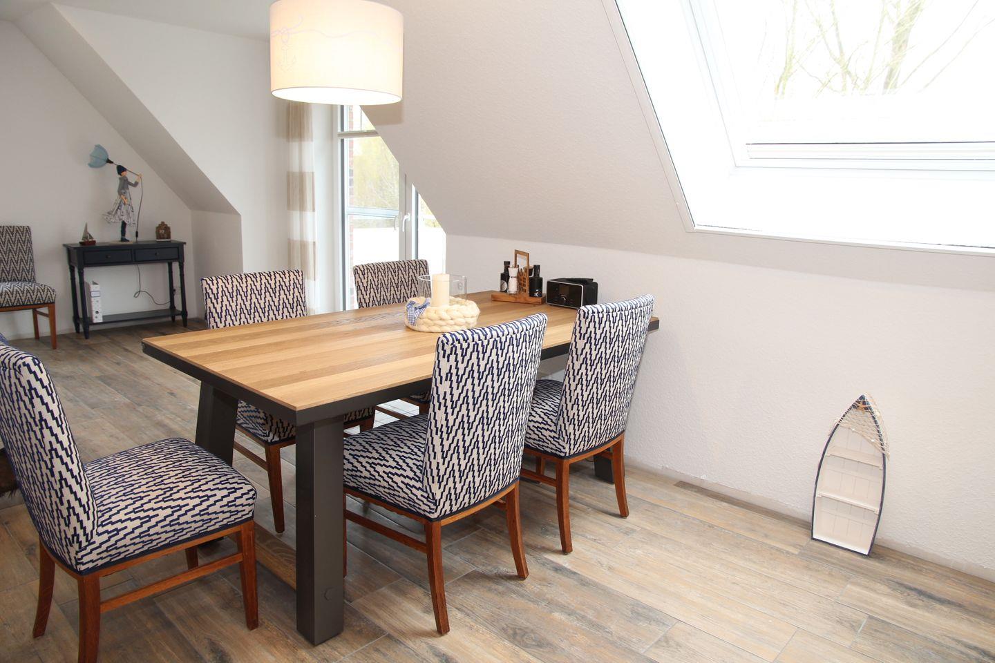 Der großzügige Wohnbereich bietet zwei gemütliche Sessel mit zugehörigem Sofa und einem großen Smart-TV. Ebenfalls finden Sie hier einige Spiele, Bücher, ein DAB-Radio und den Austritt auf den Balkon (2 Stühle und ein Sonnenschirm sind vorhanden). Direkt angrenzend befindet sich der große Esstisch und die vollausgestattete Küche, die u.a. Backofen, Induktionskochfeld, Kühlschrank mit Gefrierfach, Toaster, Wasserkocher, Kaffeemaschine, Senseo-Padmaschine, Mikrowelle, Eierkocher, Waffeleisen, Mixer, Sandwich-Toaster, Fonduegerät und einen Opti-Grill zu bieten hat. Ebenfalls auf dieser Etage befindet sich ein Schlafzimmer mit Doppelbett, Smart TV und Kleiderschrank, sowie ein Duschbad mit großem Dachflächenfenster, Handtuchheizkörper, Fön, Waschtrockner, Waschbecken, Dusche mit flachem Einstieg und WC.