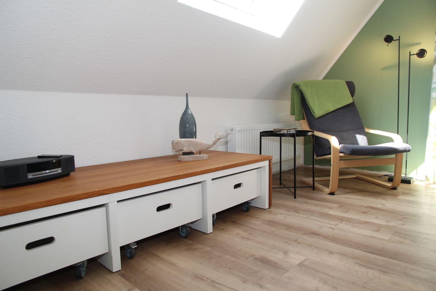 Im ausgebauten Dachgeschoss befindet sich das zweite Schlafzimmer mit einem weiteren Boxspringbett 160 x 200cm (einzelne Matratzen mit durchgehendem Topp) sowie einem Lesesessel. Auch gibt es hier ein separates WC mit Waschbecken.
