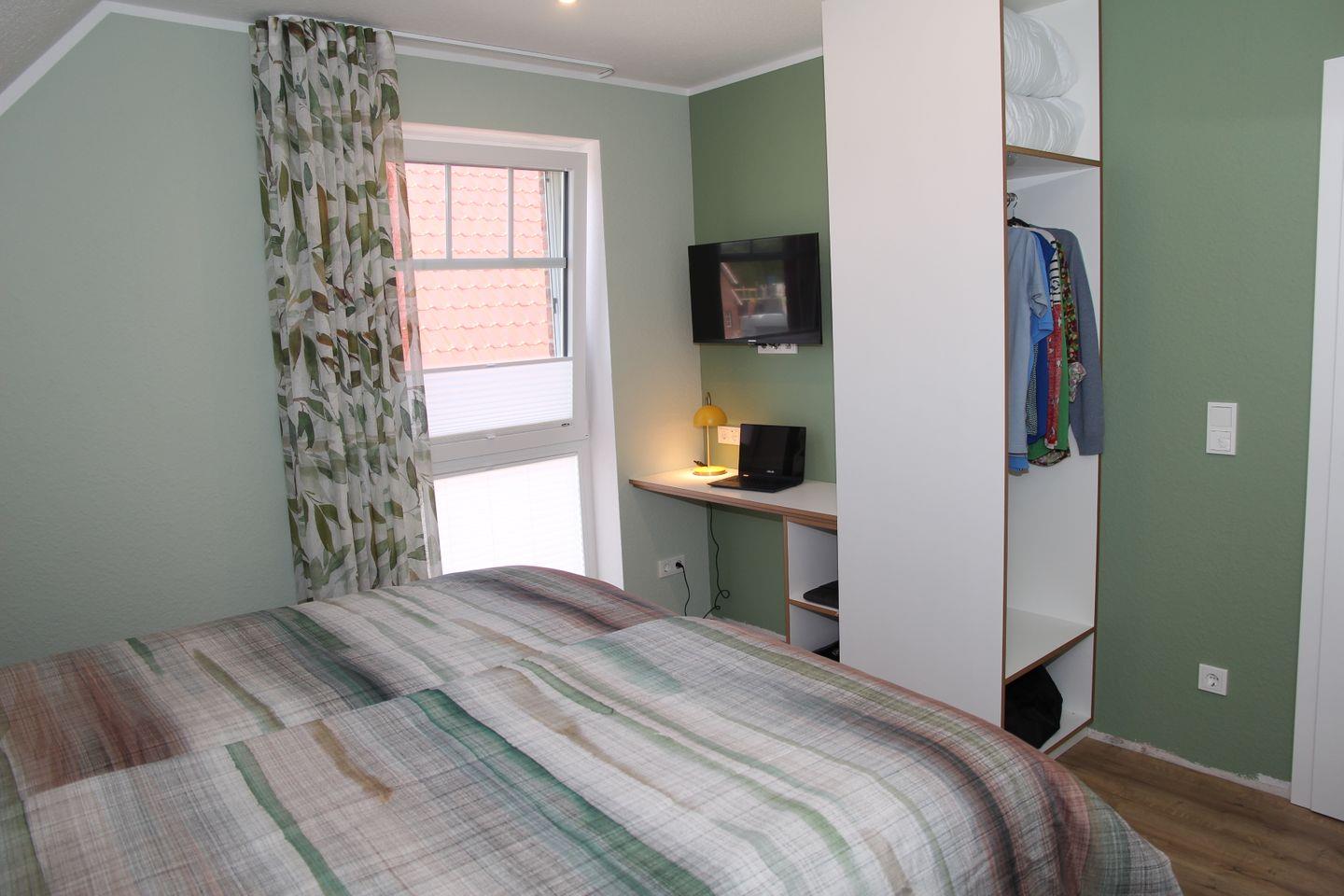 Das Schlafzimmer im OG verfügt über ein Boxspringbett 180 x 200cm (einzelne Matratzen mit durchgehendem Topper) und ein weiteres TV-Gerät. Ein kleiner Arbeitsplatz ermöglicht bei Bedarf das Arbeiten im „Homeoffice“.