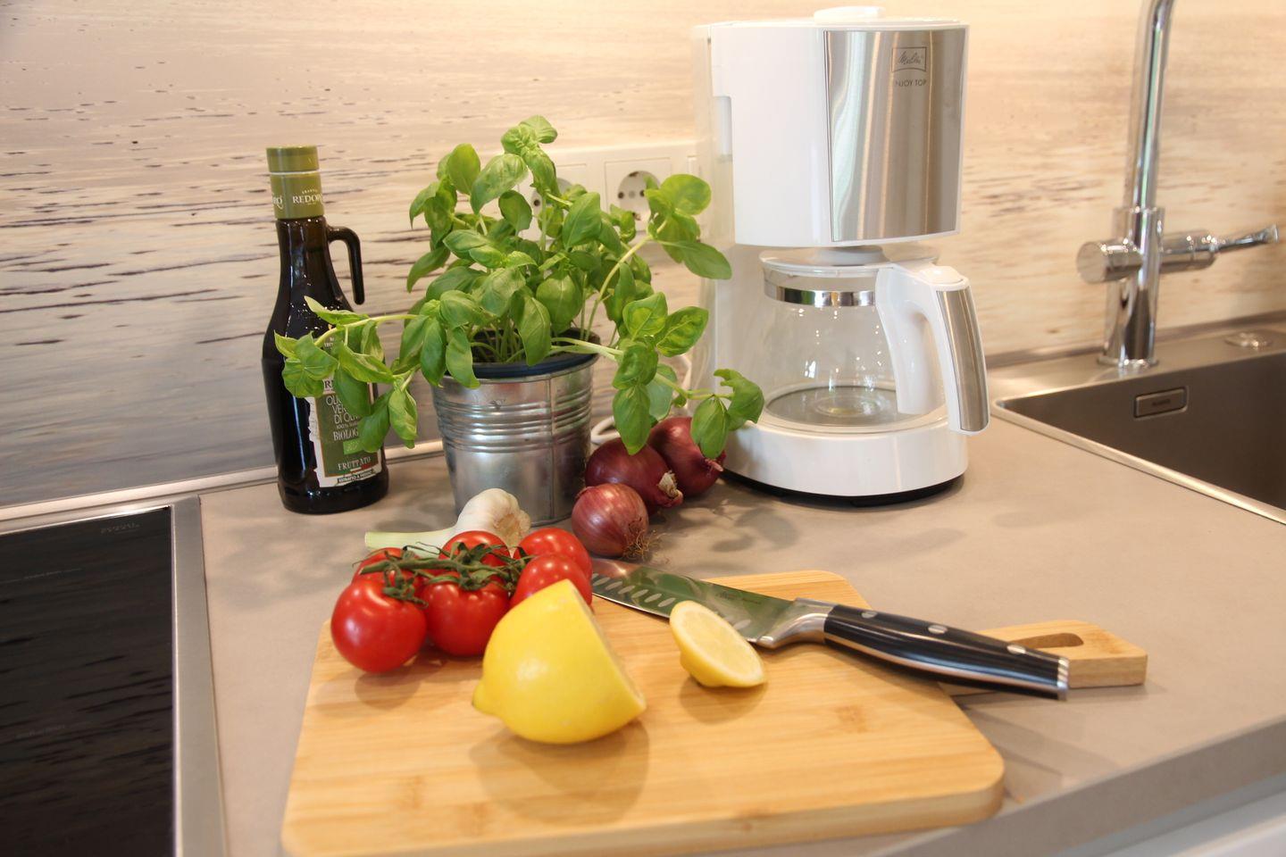 Den Mittelpunkt der Wohnung bildet der offen und hell gestaltete Wohn- und Essbereich mit den bodentiefen Fenstern. Die voll ausgestattete Küchenzeile verfügt über Spülmaschine, Induktionskochfeld mit Dunstabzugshaube, Kühlschrank mit Gefrierfach sowie eine Backofen-Mikrowellen-Kombination. Darüber hinaus stehen viele weitere Küchengerätschaften zur Verfügung wie Wasserkocher, Toaster, Melitta-Filterkaffeemaschine, Senseo-Kaffepad-Maschine, Nespresso-Kapselmaschine, Kaffee-Handfilter, Thermoskanne, Waffeleisen, Sandwichmaker, Raclette, Multitool von Braun zum Mixen, Pürieren, Stampfen, Rühren, Zerkleinern, Eis-Crushen sowie ein Fondue-Gerät neben verschiedenen Back- und Auflaufformen und Mikrowellengeschirr. Wir möchten Ihnen Ihren Aufenthalt so komfortabel wie möglich gestalten. Sie brauchen bei uns keine schweren Wasserkästen oder Plastik-Wasserflaschen kaufen und schleppen. Genießen Sie gefiltertes und gekühltes Trinkwasser still, medium oder sprudelnd mit der Küchenarmatur Grohe Blue. Wir freuen uns Ihnen diese Annehmlichkeit anbieten zu können.