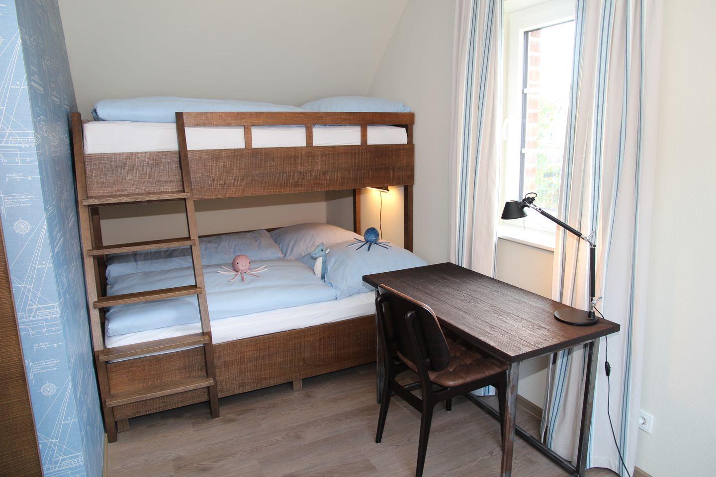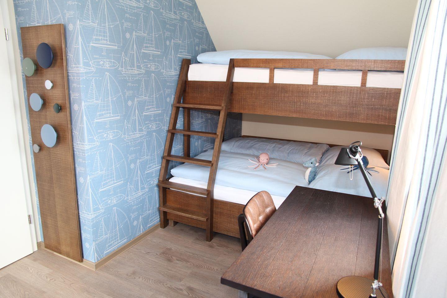 Das Haus verfügt insgesamt über drei Schlafzimmer (jeweils mit 90 x 200cm Betten), wobei zwei davon jeweils mit Doppelbett, Kleiderschrank und Fernseher ausgestattet sind. Eines befindet sich im Erdgeschoss, das andere im Obergeschoss. Das dritte Schlafzimmer befindet sich ebenfalls im Obergeschoss und verfügt neben einem großen Dachfenster über ein Hochbett, bei dem sich unten ein Doppelbett und oben ein Einzelbett befinden, sodass insgesamt sieben Personen im Framheim wohnen können. Zusätzlich sind hier auch ein Kleiderschrank und ein Schreibtisch mit tollem Wasserblick untergebracht.