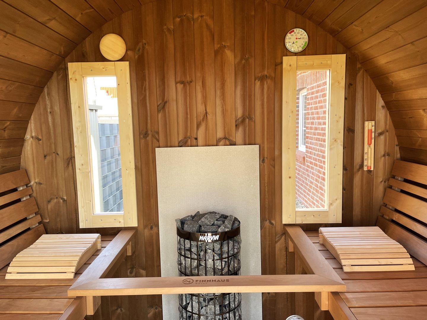 Im Außenbereich steht für die Gäste eine großzügige Fass-Sauna aus hochwertigem Thermoholz kostenfrei zur Verfügung, aus der Sonnenuntergänge mit Blick auf das Siel und den Kirchturm von Eilsum genossen werden können.