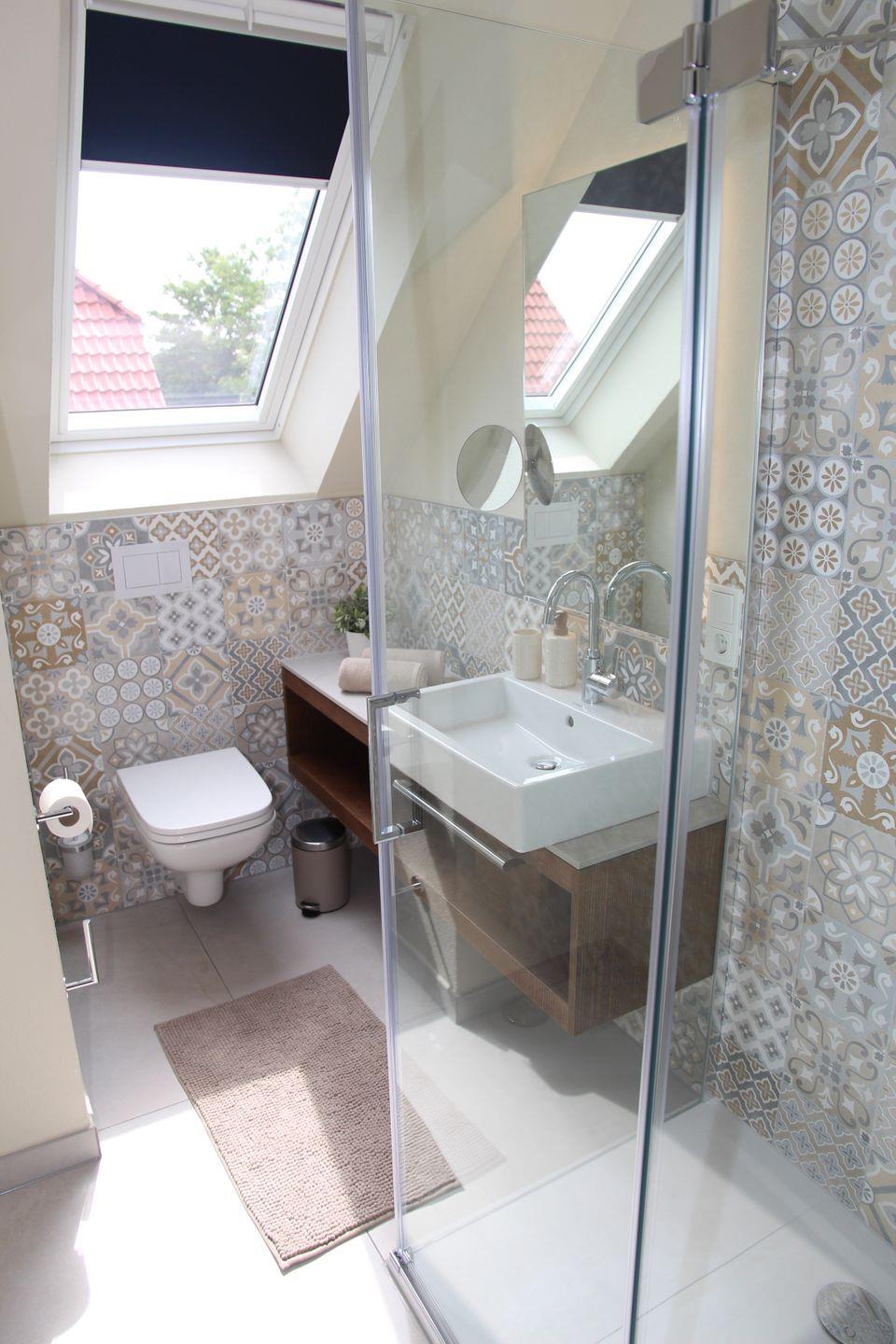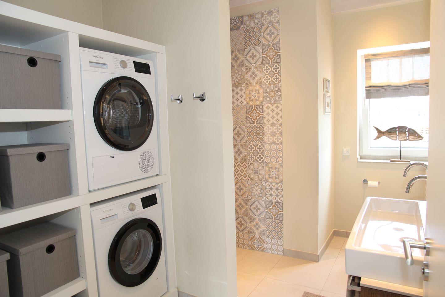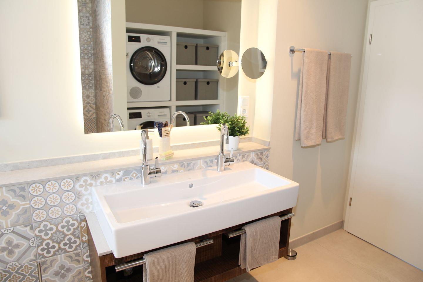 Die beiden Duschbäder (im EG mit Fön, Waschmaschine und Trockner) sind jeweils mit ebenerdiger Dusche inklusive Rainshower, Waschbecken (im EG Doppelwaschbecken) und Toilette ausgestattet.