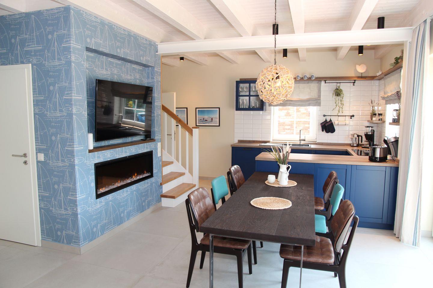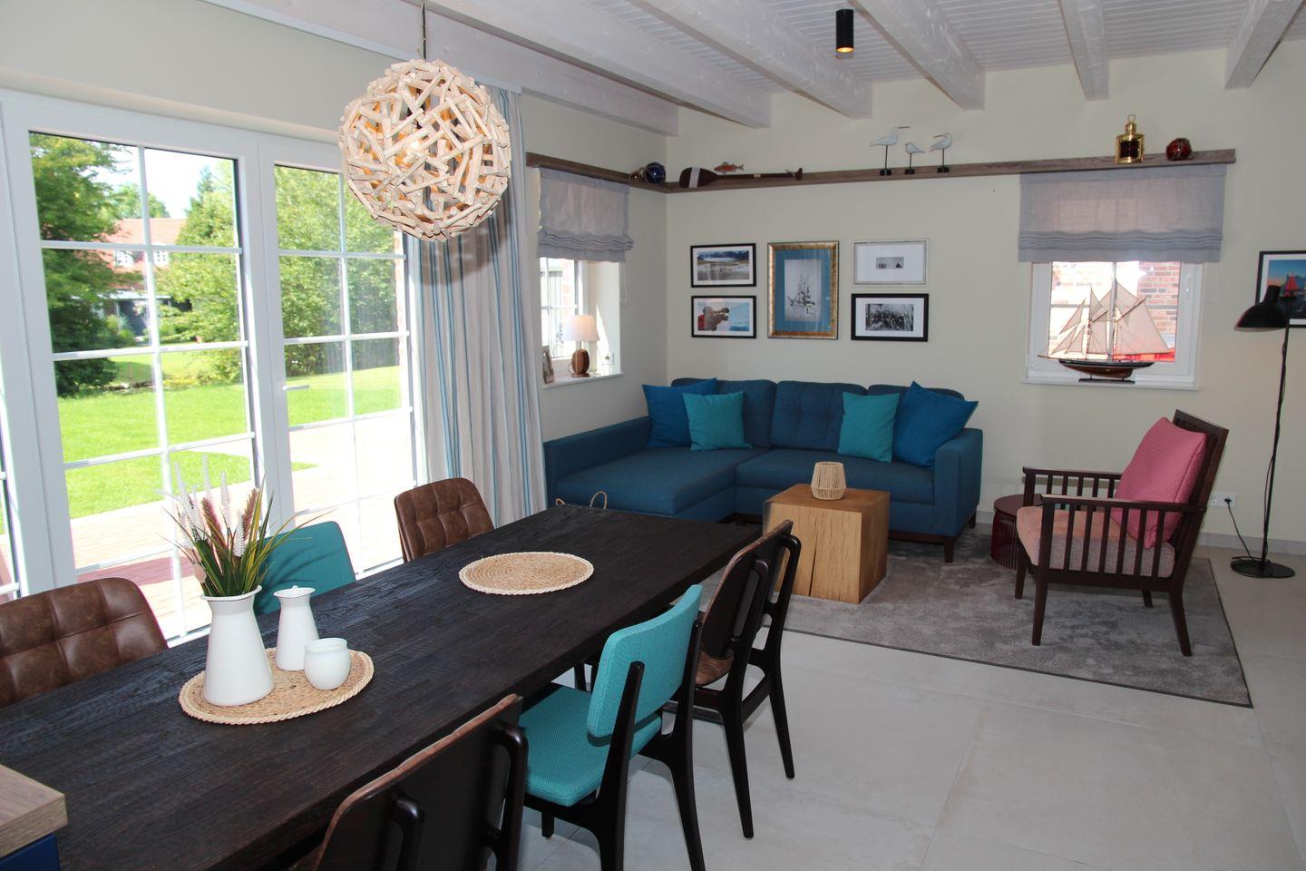 Gleich beim Betreten des Hauses werden Sie den maritimen und hochwertigen Einrichtungsstil des Hauses bemerken. Nach dem Eingangsbereich mit Garderobe kommen Sie in die voll ausgestattete Küche mit schönem Blick vom Induktionskochfeld in den Garten und auf den Kanal. Hier finden Sie Spülmaschine, Kühlschrank mit Gefrierfach, Backofen, Wasserkocher, Toaster, Filterkaffeemaschine, Senseo-Padmaschine und vieles Weiteres. Direkt angrenzend befindet sich der großzügige und helle Wohn- und Essbereich mit großem Esstisch, streaming- und internetfähigen-Fernseher, sowie einem Sofa mit Sessel. Das Highlight ist hier der elektrische Kamin inkl. visuellem und auditivem Ambiente, wie auch einer Heiz- und Kühlfunktion. Entdecken Sie von hier auch den großen, nach Südwest ausgerichteten Garten direkt am Uttumer Sieltief mit eigenem Steg inklusive Sitzbank am Wasser und möblierter Terrasse, von denen die Sonne genossen werden kann.