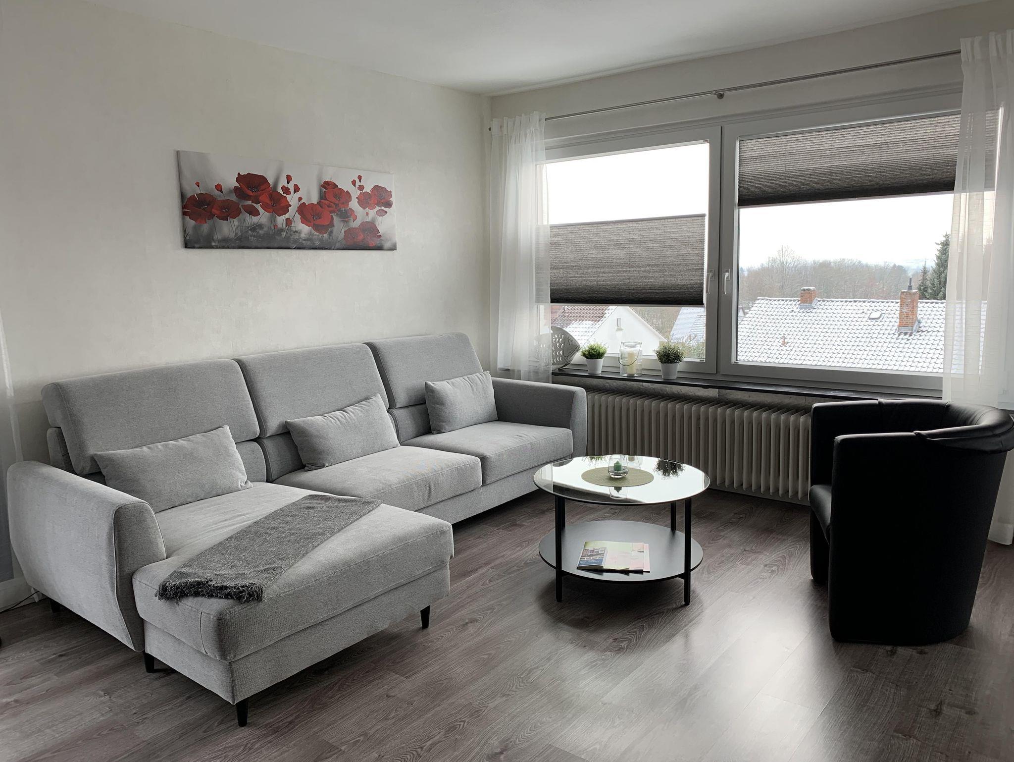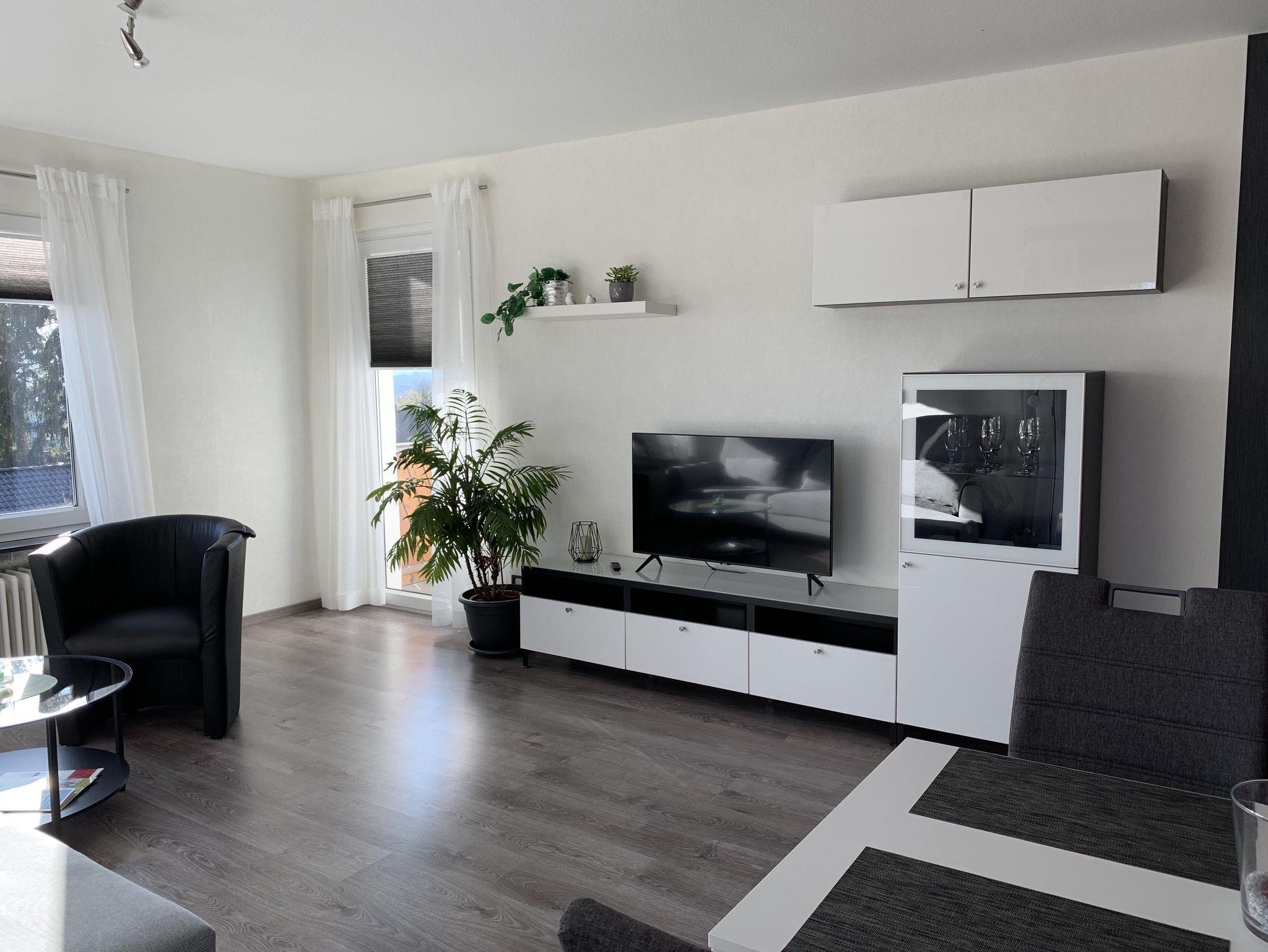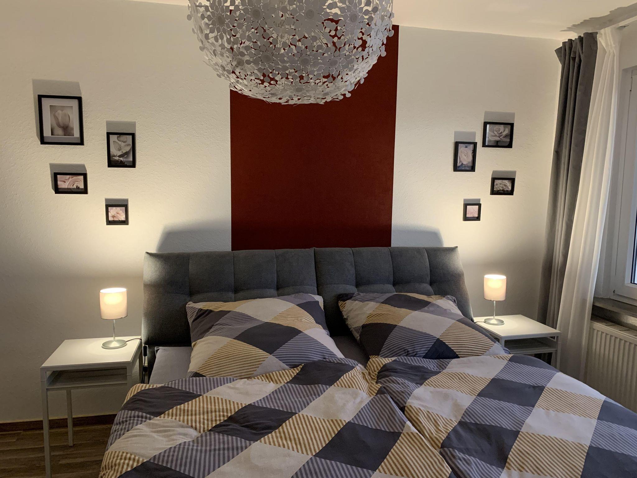 Neu und modern eingerichtete Nichtraucher-Wohnung in der ersten Etage eines Zweifamilienwohnhauses mit Garten. Die Wohnung besteht aus einem hellen Wohnzimmer und angrenzendem Balkon, welcher auch vom Schlafzimmer begehbar ist. Die Küche ist nach Norden ausgerichtet und auch dort befindet sich ein Balkon mit Blick in den Garten. Das Badezimmer ist mit Dusche und Waschplatz. Das WC ist seperat. Das Wohnzimmer ist 24qm groß und ist eingerichtet mit einem Sofa und einem Sessel mit Tisch, sowie Essbereich mit Tisch und vier Stühlen. Allergikerfreundlicher Laminatboden ist vorhanden. Plisses sorgen für gewünschte Lichtverhältnisse. Ein LED-Fernseher mit Satelliten-Empfang ist vorhanden. Die Küche ist ausgestattet mit Herd, Backofen,Toaster, Kaffeemaschine, Kühlschrank mit Gefrierfach und Mikrowelle. Das Schlafzimmer besteht aus einem Boxspringbett mit Nachtkonsolen und einem Kleiderschrank. Eine Unterstellmöglichkeit für Fahrräder ist vorhanden, ggf. können e-Bikes geladen werden.