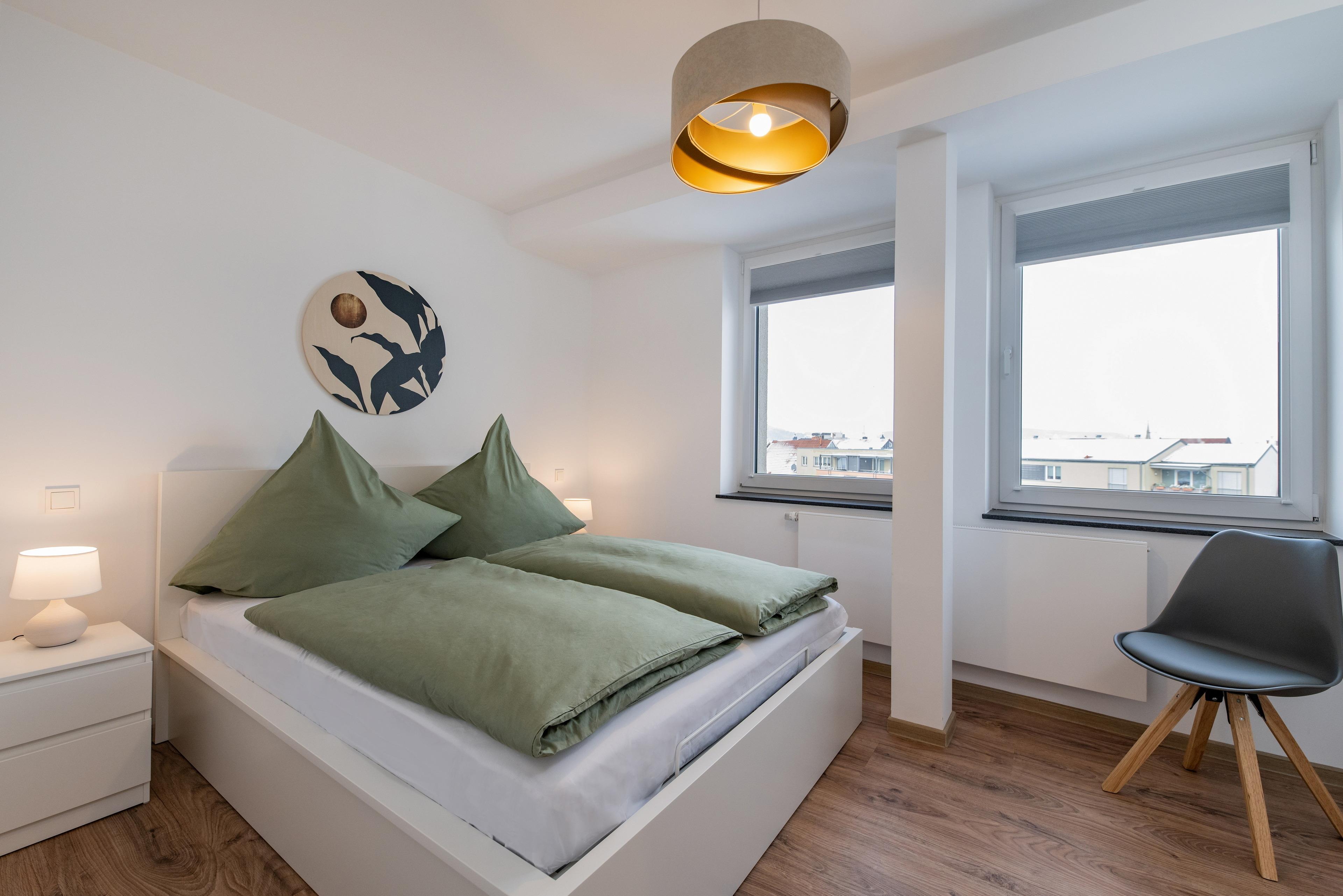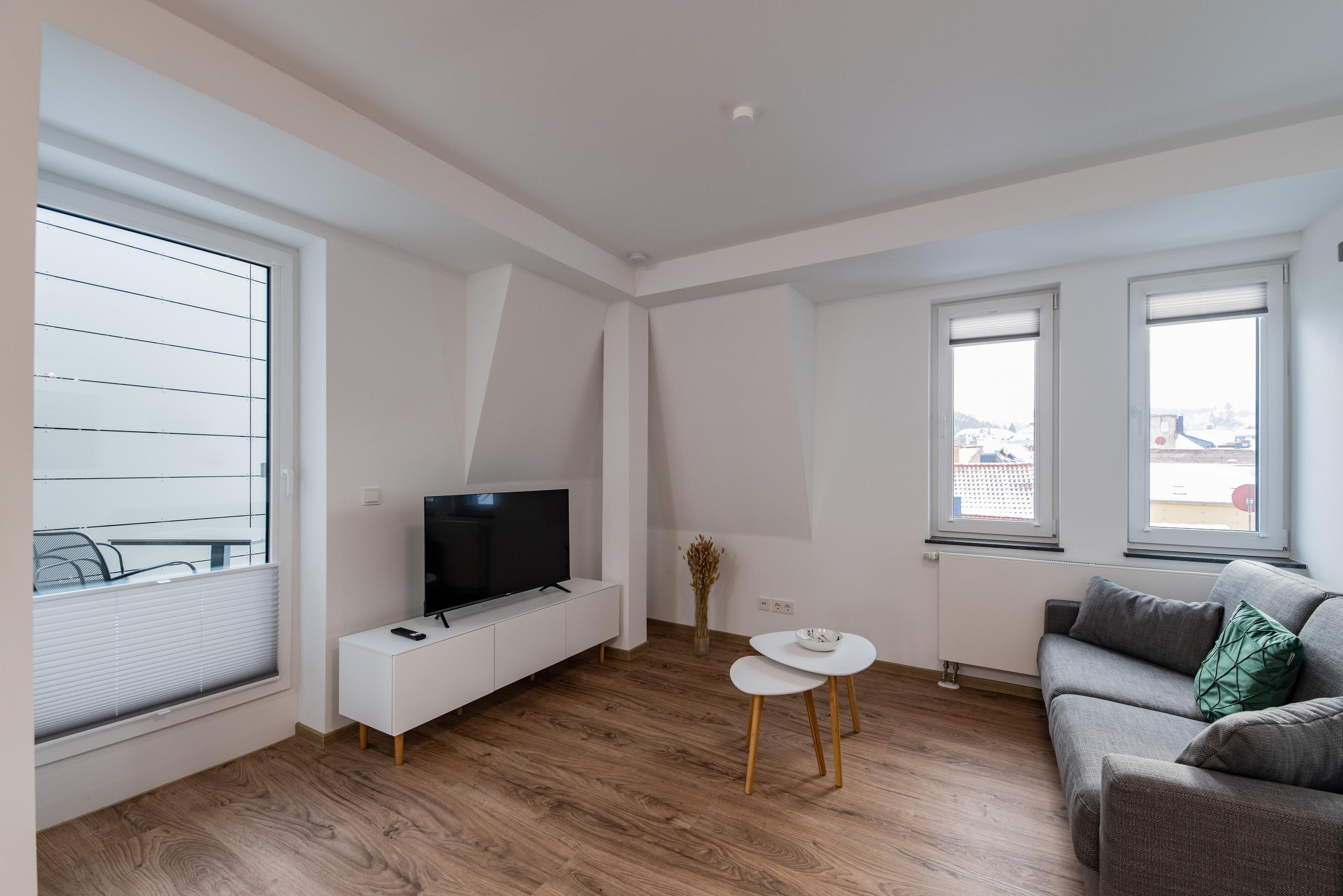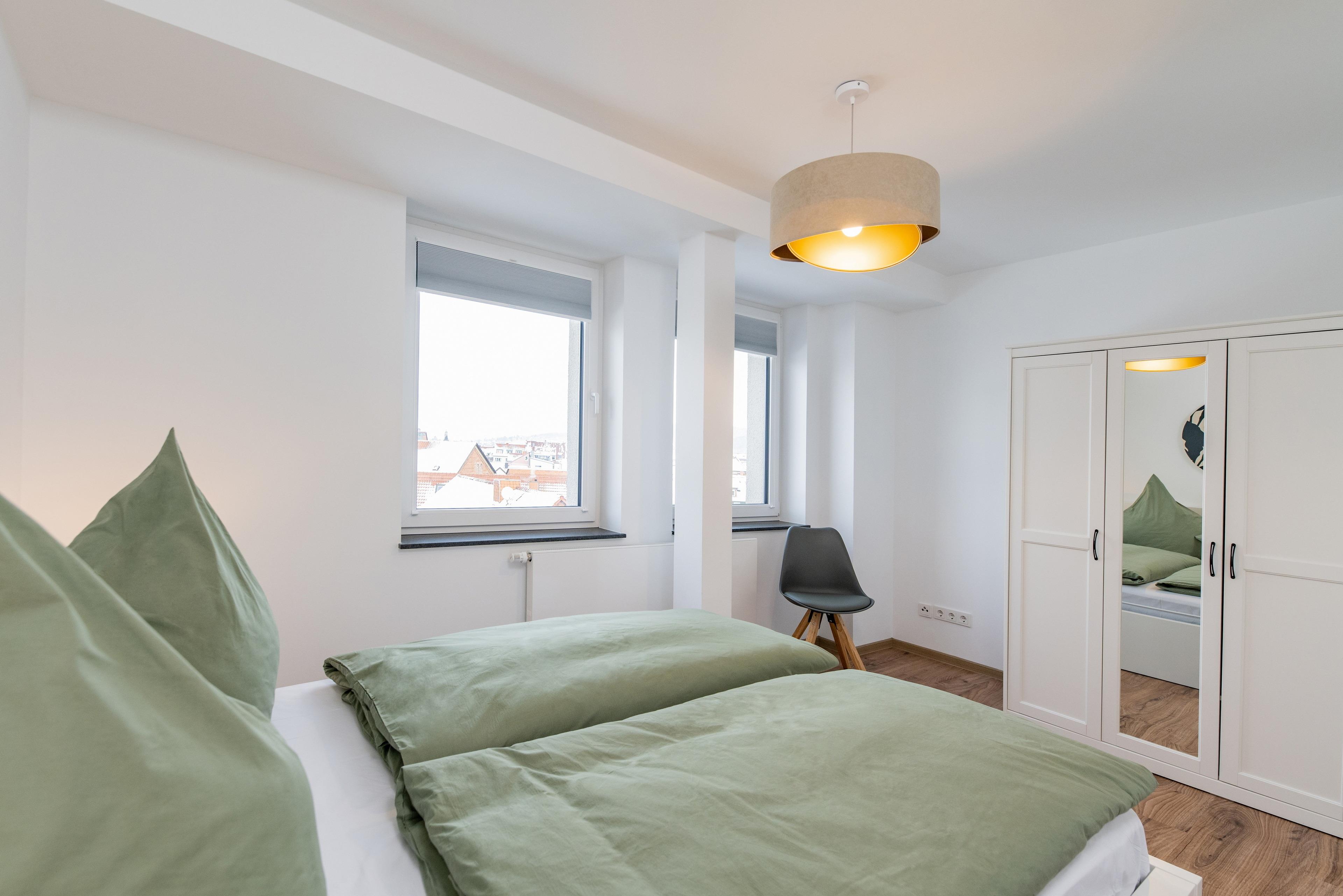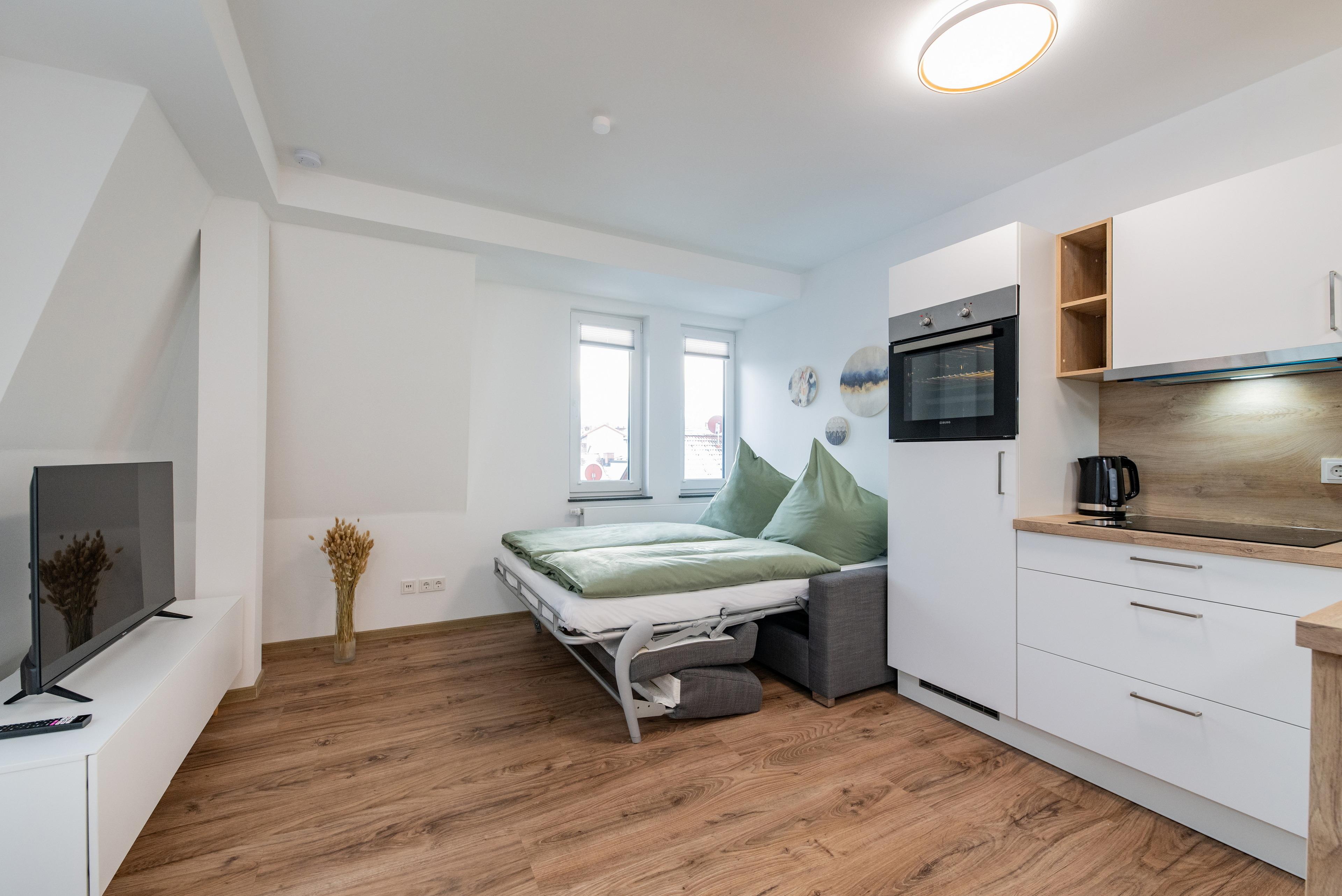 Unser Zwei-Zimmer-Apartment befindet sich im 3. Stock und bietet ein Wohnzimmer mit Küche und Essbereich, ein Schlafzimmer und ein modernes Bad. Das hochwertige Schlafsofa ermöglicht die Aufbettung für 2 Personen nach Absprache, sodass maximal vier Erwachsene das Apartment bewohnen können.