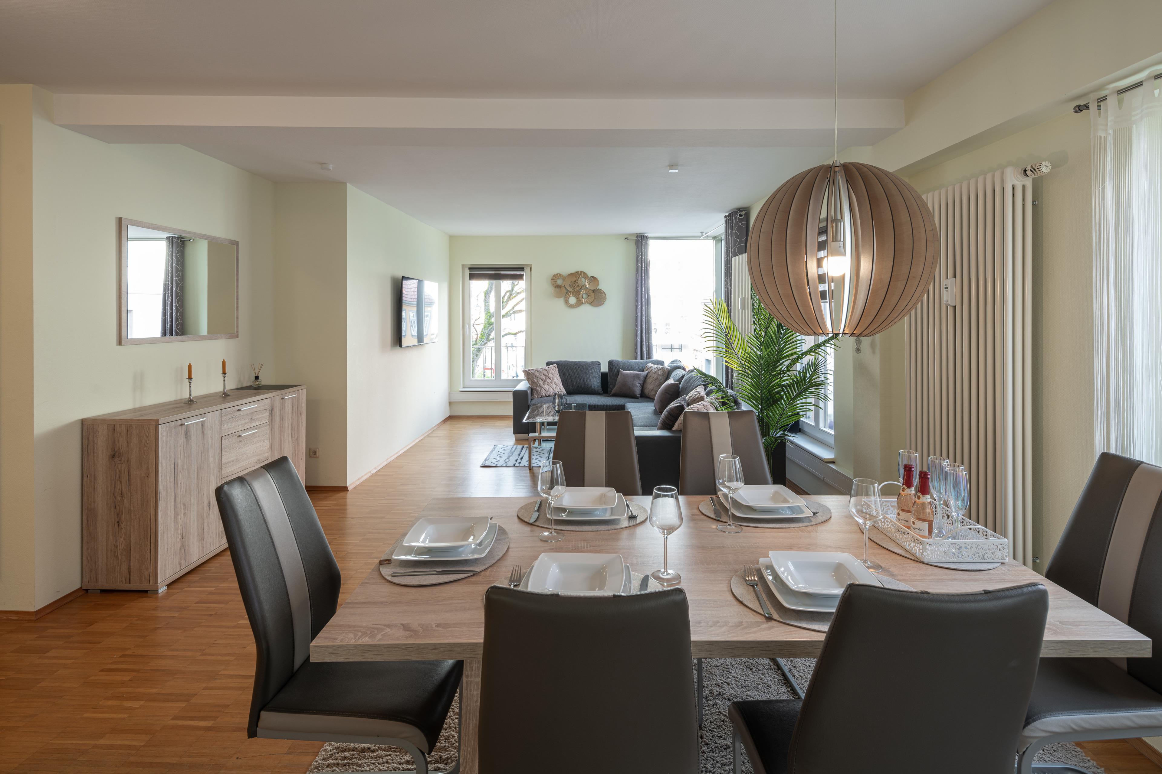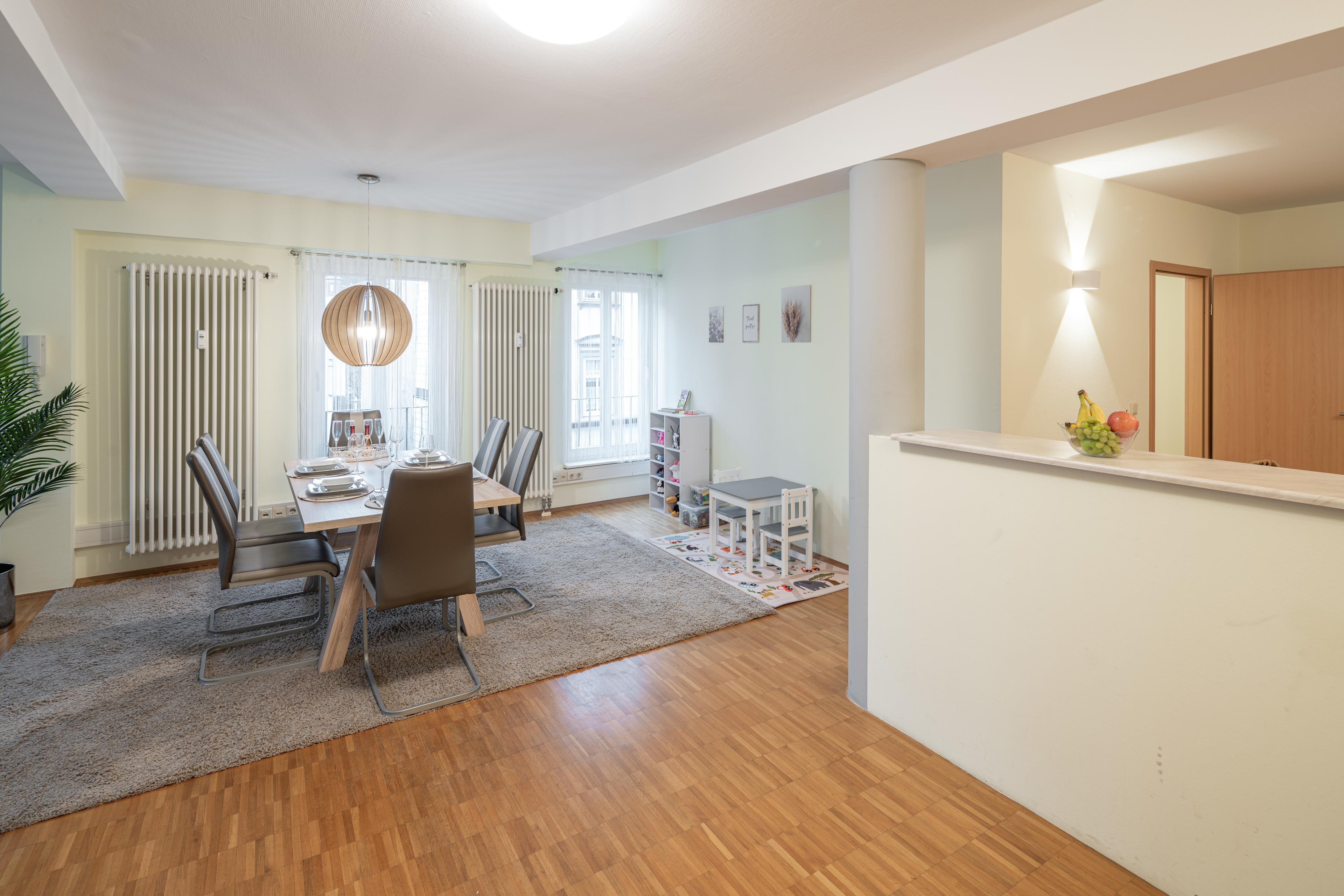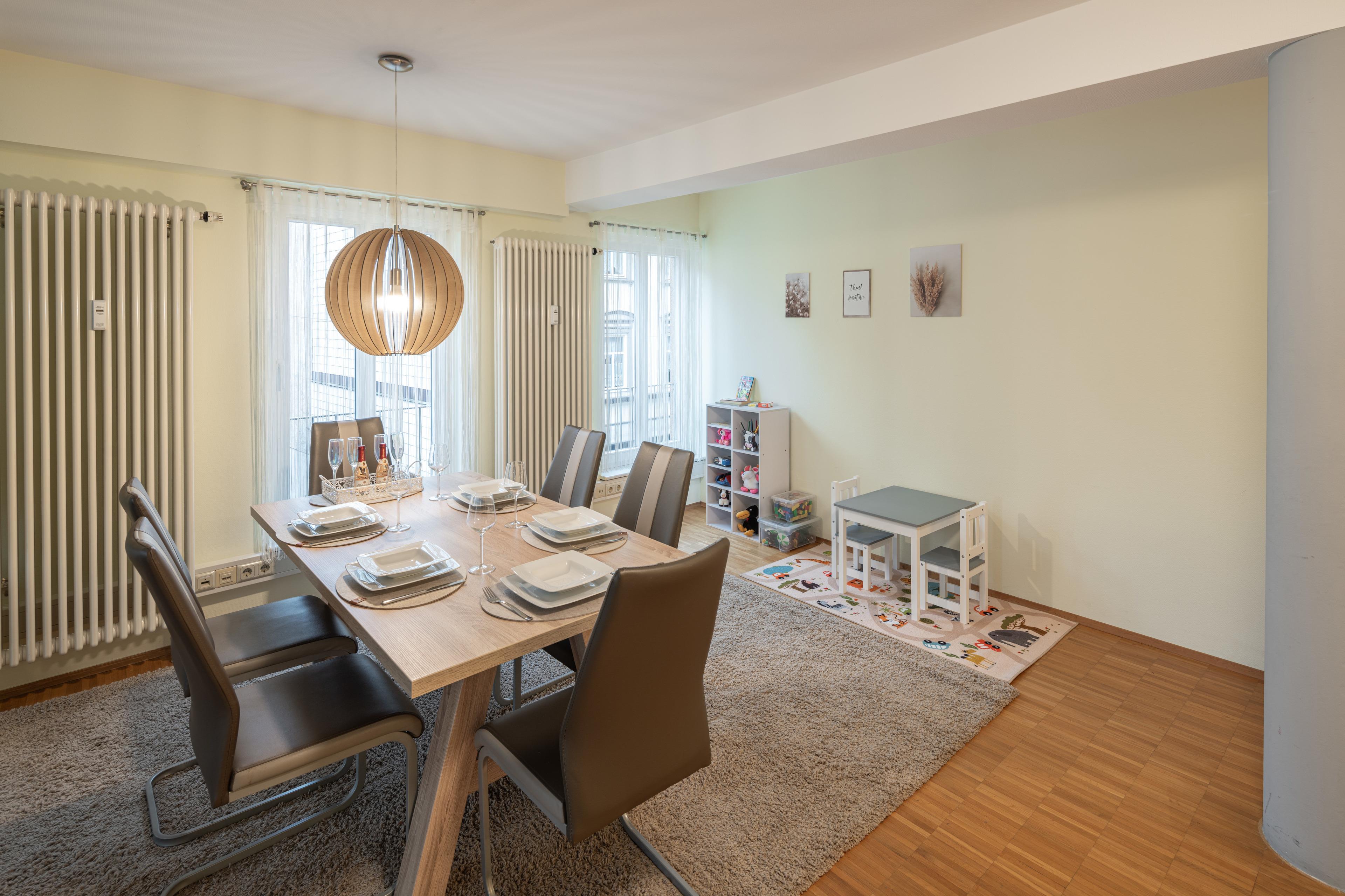 ? Esstisch mit 6 Sitzplätzen und einem Kinderstuhl bei Bedarf