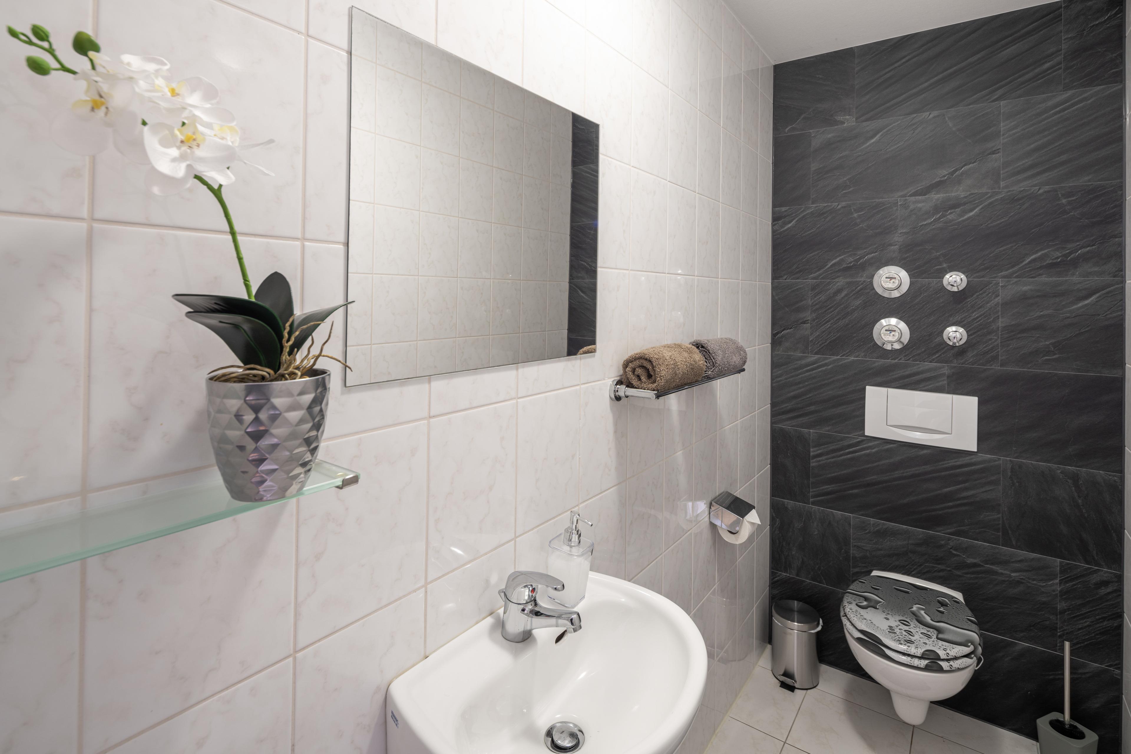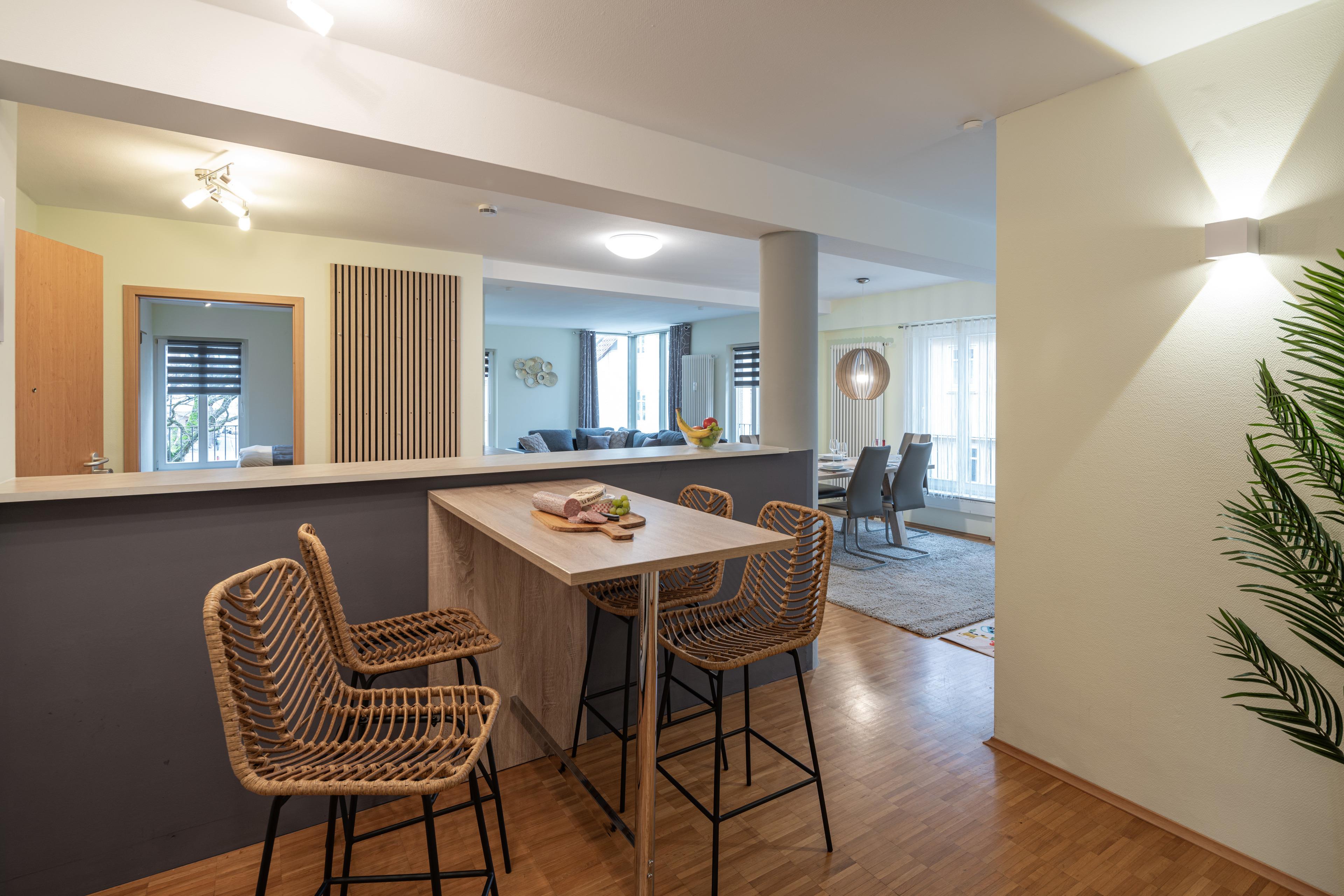Insgesamt bietet die Ferienwohnung Platz für 6 Personen, zwei Schlafzimmer bestehend aus zwei Doppelbetten und ein Schlafsofa für zwei Personen. Im modernen Wohn-/ Esszimmer ist ausreichend Platz für gemütliche Stunden am großen Esszimmertisch mit 6 Stühlen. Weiterhin gibt es Smart-TV mit YouTube sowie Streaming Diensten. In der angrenzenden Küche findest du neben Kaffeemaschine, Wasserkocher auch eine neue Mikrowelle, einen neuen Kühlschrank. In den hell gestalteten Badezimmern findest du neben Handtücher, Badetücher auch Haartrockner und Hygieneartikel, das separate Gäste WC ist gleich neben der Dusche.