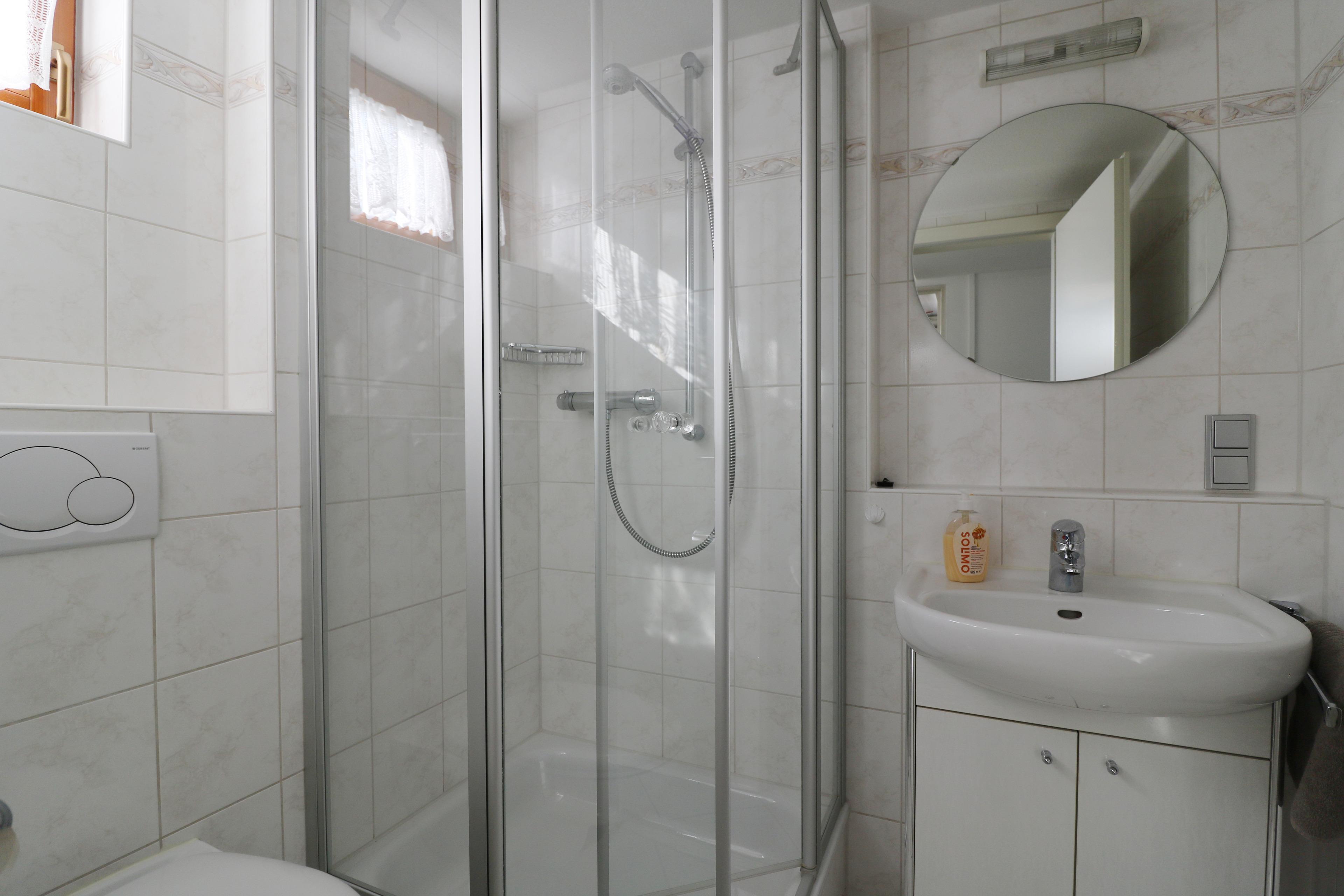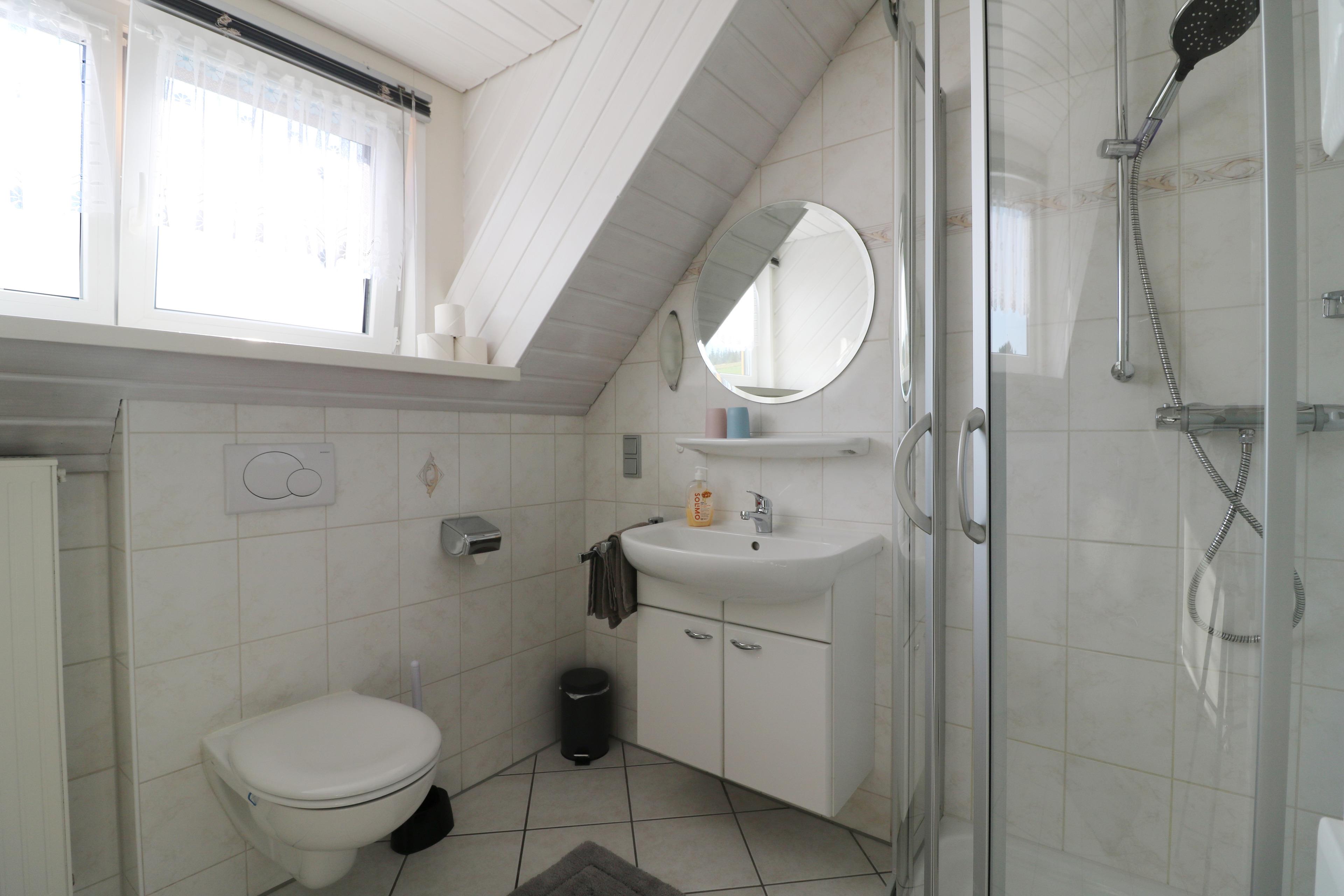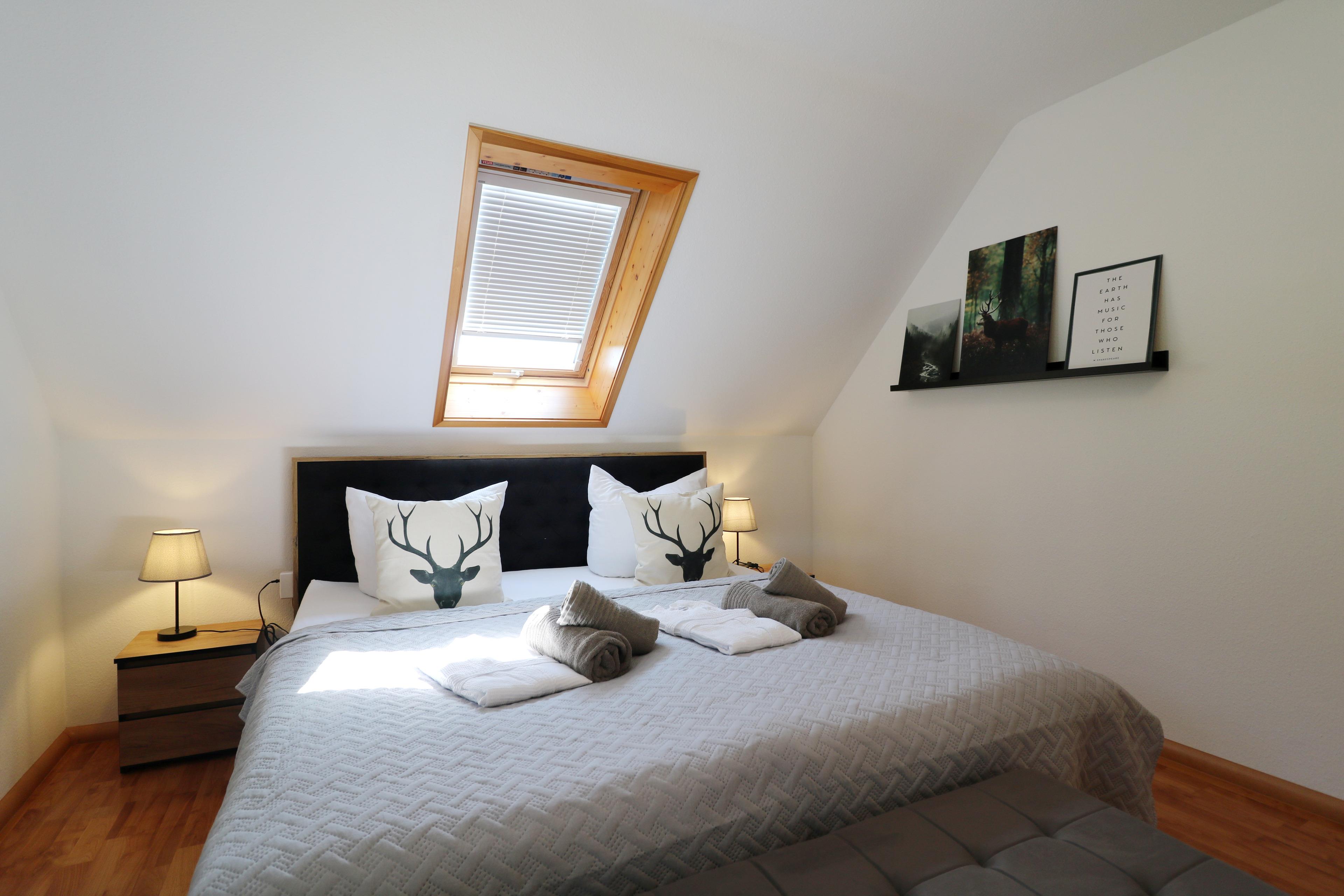 - 1 Schlafzimmer im OG mit Doppelbett (180 x 200), TV und Badezimmer mit Badewanne, Dusche und WC