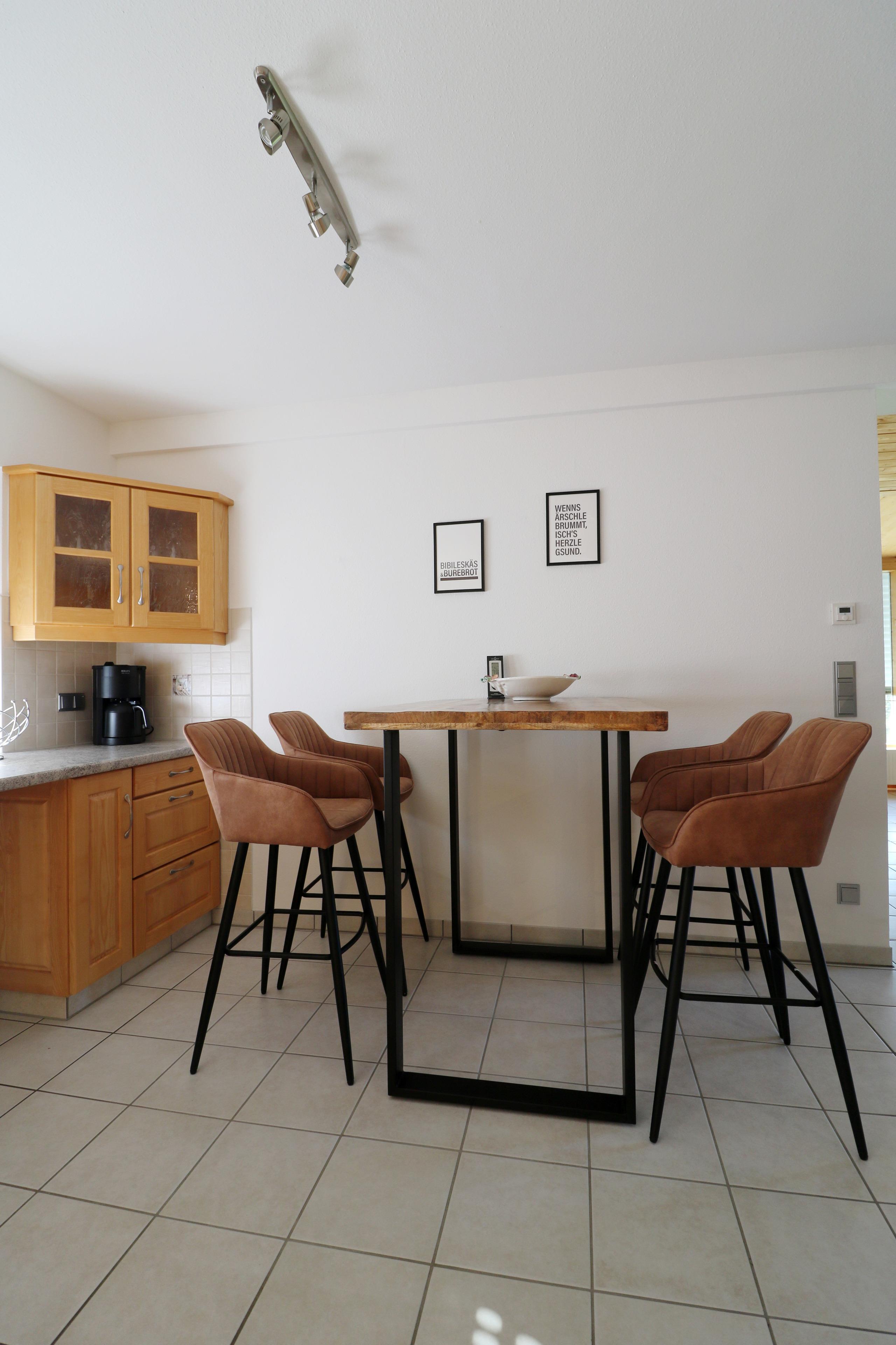- große Küche mit Herd mit 4 Kochfeldern, Filterkaffeemaschine, Kühlschrank mit Gefrierfach, Geschirrspülmaschine, Mikrowelle, Backofen Toaster, Wasserkocher und Essplatz