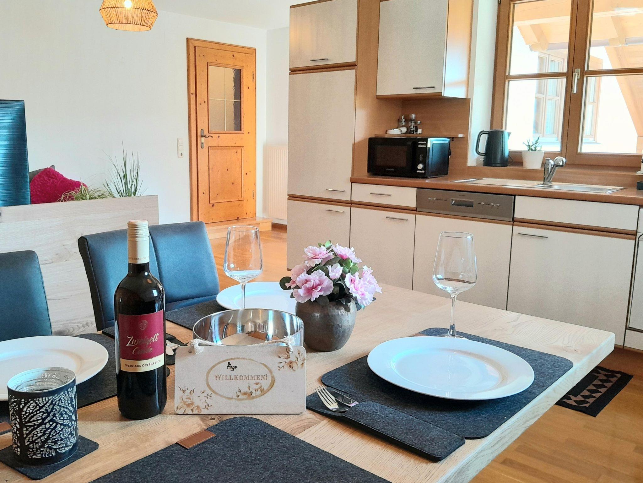 Die Ferienwohnung ist komfortabel ausgestattet und bietet Ihnen eine Kaffe- und Spülmaschine, Herd mit Backofen, Mikrowelle, Kühlschrank mit Gefrierfach, Wasserkocher, Toaster und sämtliches Geschirr.