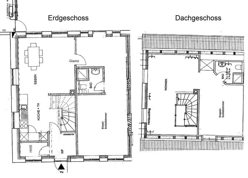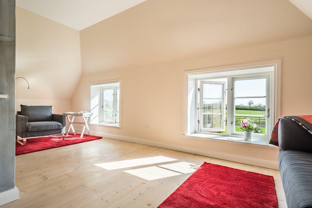 Verbringen Sie im Obergeschoss schöne Stunden im gemütlichen Wohnzimmer mit Flachbildfernseher: ein geschoss-eigenes Duschbad mit Handtuchtrockner steht hier ebenfalls zur Verfügung. Erholen können Sie sich im Doppelzimmer (180x200 cm) mit Blick auf die Landschaft.