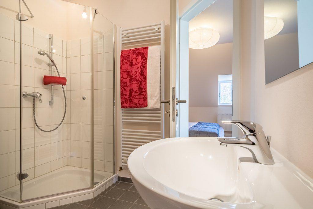 Durch eine Glastür gelangen Sie in den hinteren Teil des Erdgeschosses; hier befinden sich ein Duschbad und ein Schlafzimmer mit 2 Einzelbetten (je 90x200 cm), die bei Bedarf zusammengeschoben werden können, sowie ein Flachbild-TV.