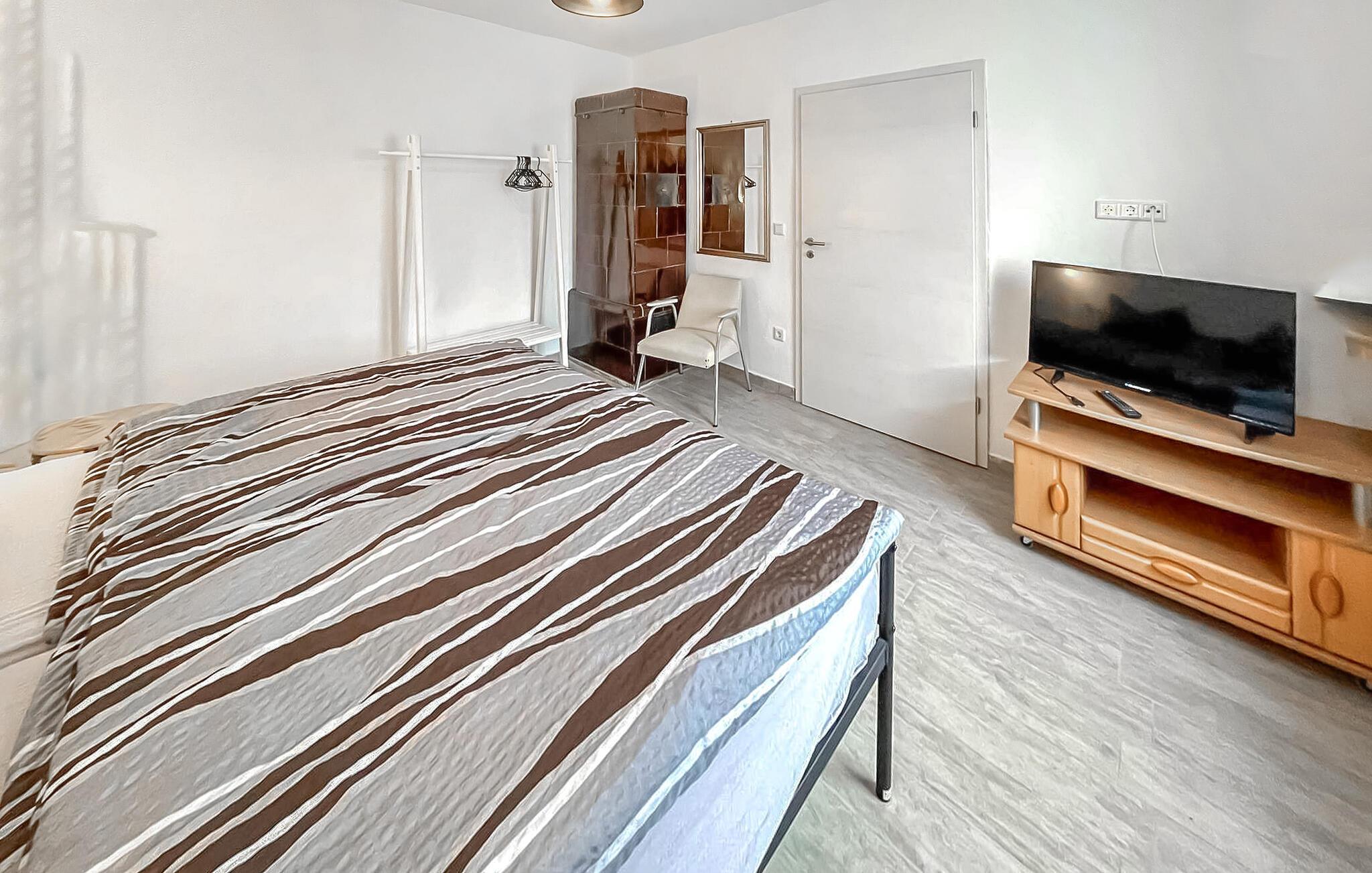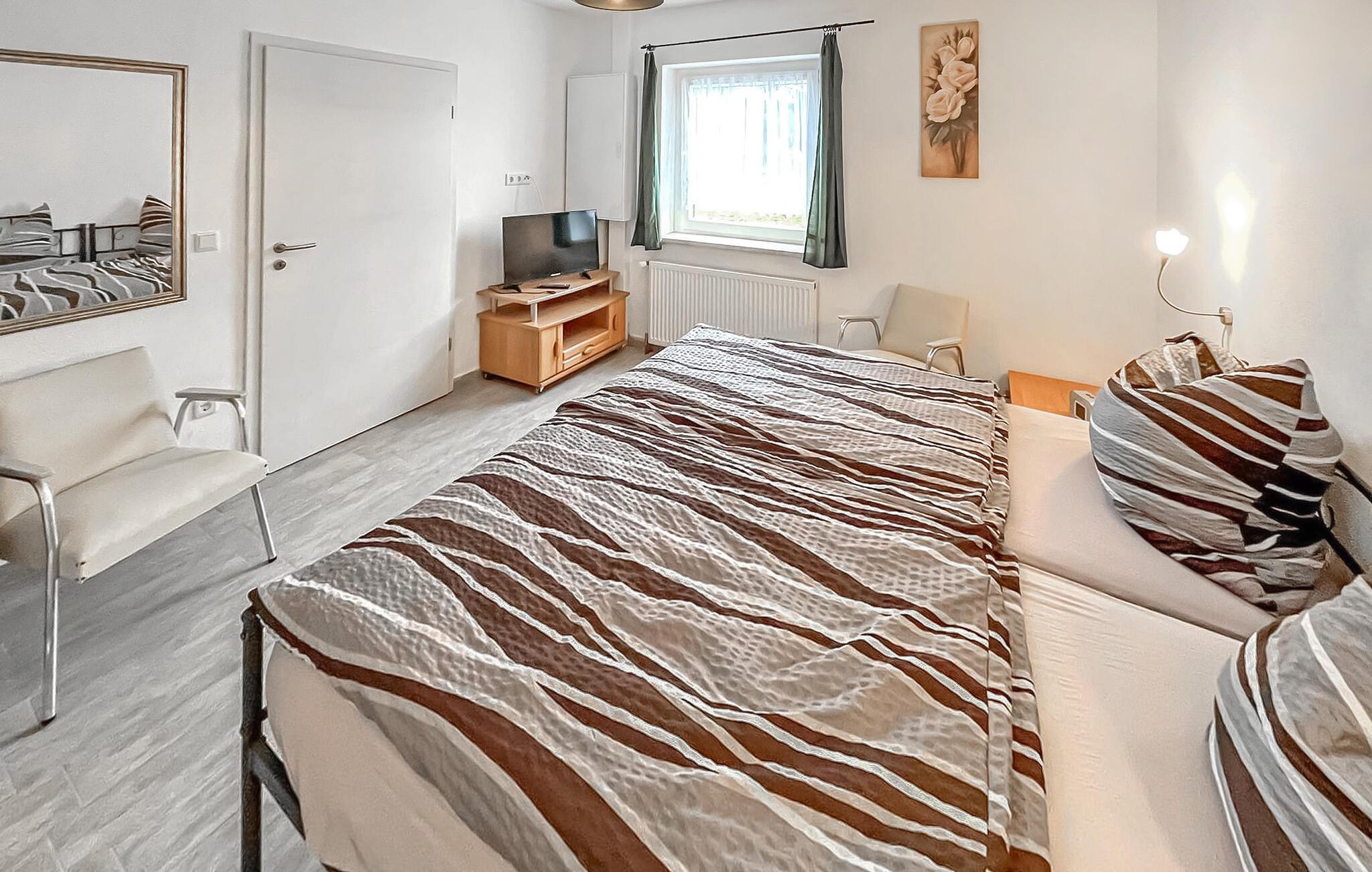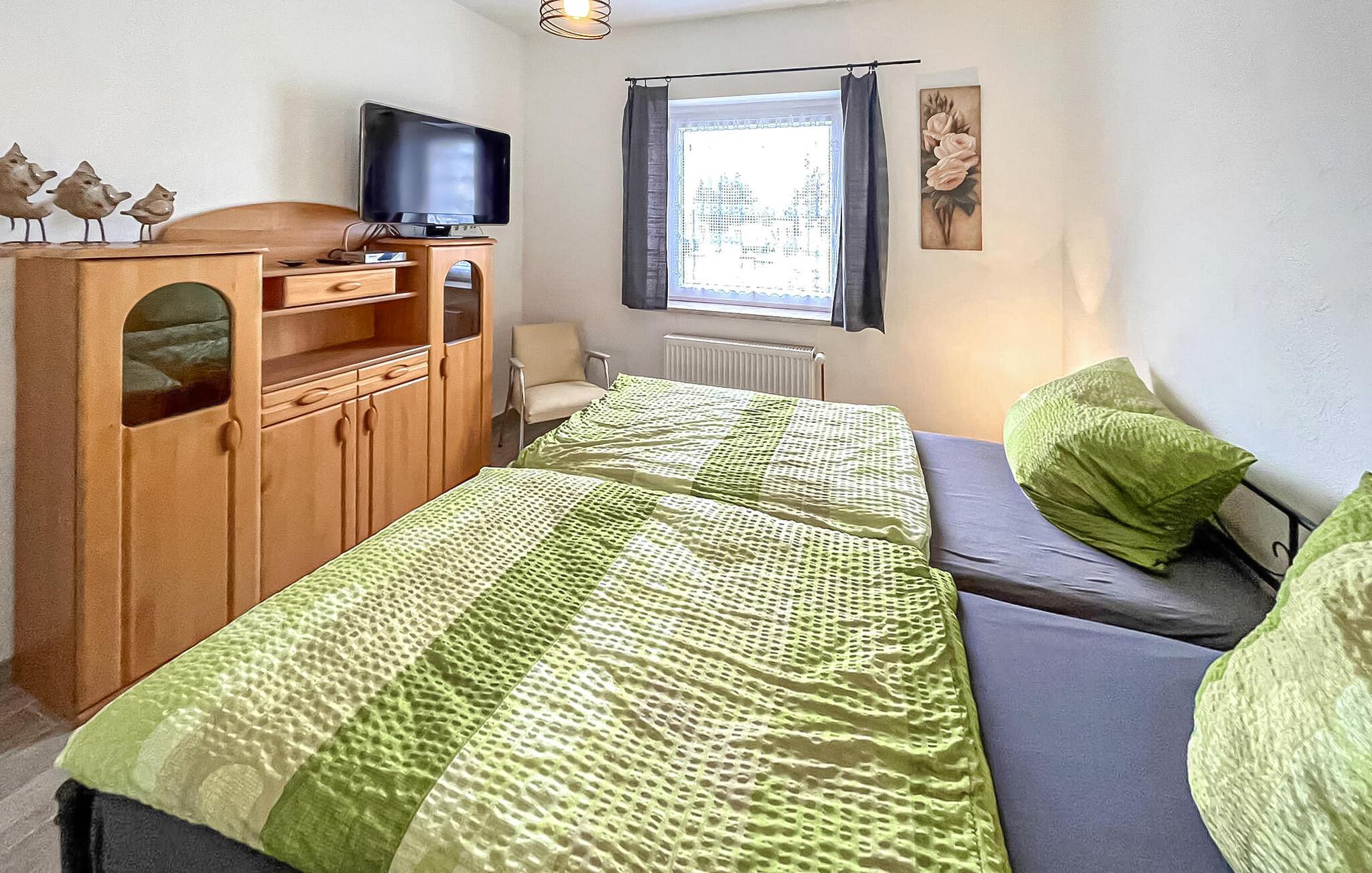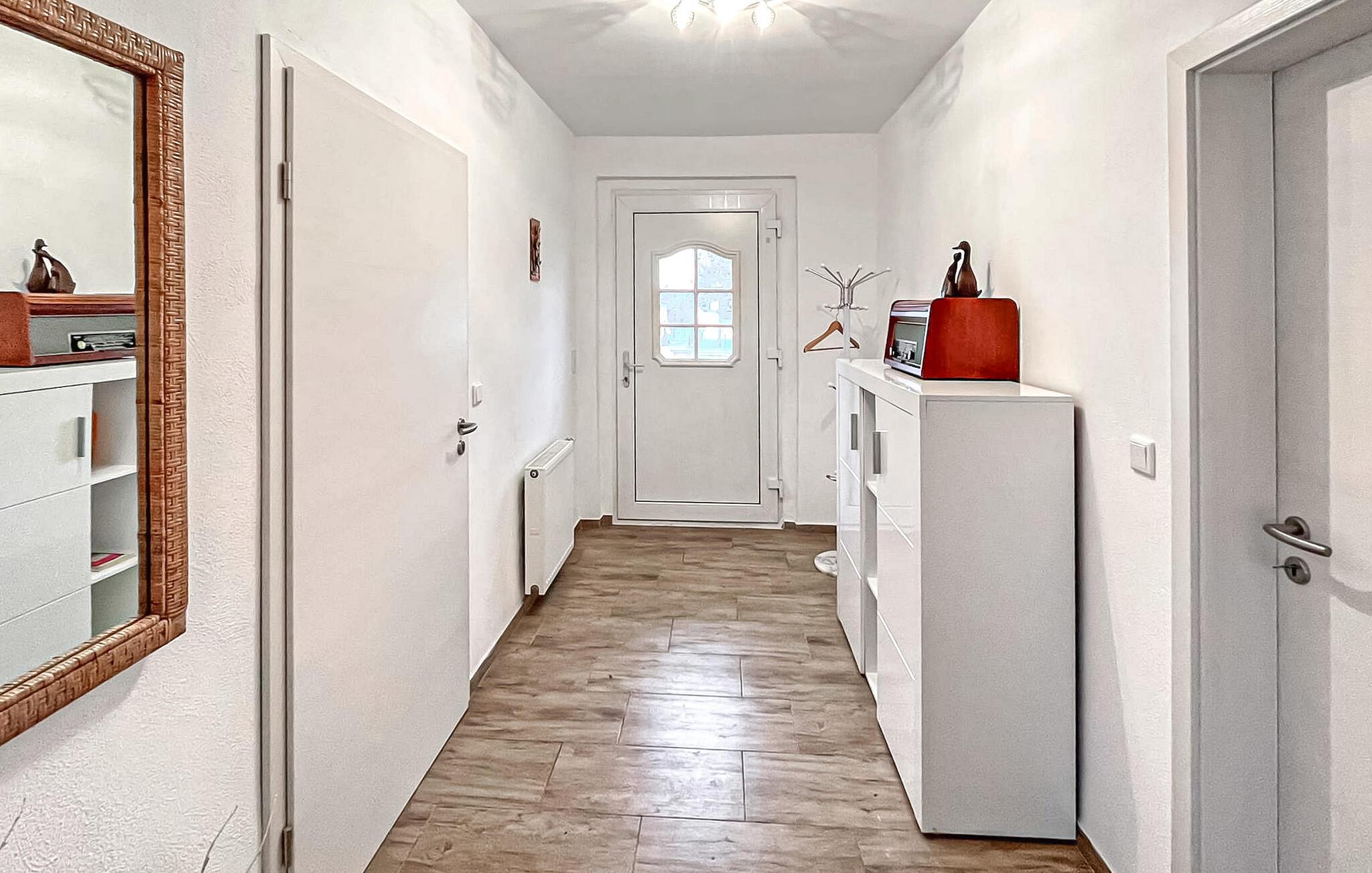 En af tre ferielejligheder beliggende i stueetagen i et tidligere dobbelthus på en 10.000 kvm stor grund i udkanten af en landsby. Den enorme ejendom byder på masser af plads til sport, leg og kæledyr. Fra ejendommen har man udsigt til den store natur, som gør det muligt at observere de lokale havørne og vilde dyr som rådyr og ræve. Hele ejendommen blev fuldstændig renoveret og nydesignet i 2021. Den cirka 90 kvm store treværelses lejlighed til højst 4 voksne og 2 børn har en stue (polstrede møbler, spisebord, fladskærms-tv, stereoanlæg), to soveværelser (hver med dobbeltseng, tv), et separat køkken (elkomfur med ovn, Køleskab med fryser, opvaskemaskine, spisebord, diverse køkkenmaskiner, vaskemaskine) samt rummeligt badeværelse med dobbelt håndvask og brus/toilet. Der er også et overdækket indgangsparti med opholdsområde. Værelserne er opvarmet med centralvarme. En barneseng og høj stol kan stilles til rådighed for små børn. Internet (W-Lan) er også tilgængelig. Udenfor er der et udendørs opholdsområde med grill. Der er også en parkeringsplads. Den samlede pris inkluderer slutrengøring, sengelinned, håndklæder samt vand- og elforbrug. Wredenhagen er en landsby i et naturskønt område i det sydlige Mecklenburgske sødistrikt på grænsen til Brandenburg. De små byer Röbel an der Müritz og Wittstock ligger hver omkring 15 km væk. Elde-floden løber gennem byen til Mönchsee, et naturreservat, hvor blandt andet havørnen er hjemmehørende. Søen er ikke en badesø på grund af dens sumpede kystområder. Glambecksee, 7 km væk, er dog perfekt til dette, da den har fremragende vandkvalitet. Et par kilometer syd for statsgrænsen strækker et enormt skovområde sig helt til Wittstock.Wredenhagen er kendt for sit slot, der kan dateres tilbage til det 13. århundrede. Engang magtsæde for fyrster, huser det nu en folkeskole, et museum med en udstilling og et 300 år gammelt kobberbøgetræ. Der er også en landsbybutik i landsbyen til små ærinder. Der skulle dog foretages større indkøb i de ovenfor nævnte små byer. Takket være livlig klubaktivitet finder der adskillige arrangementer sted i byen hvert år.
