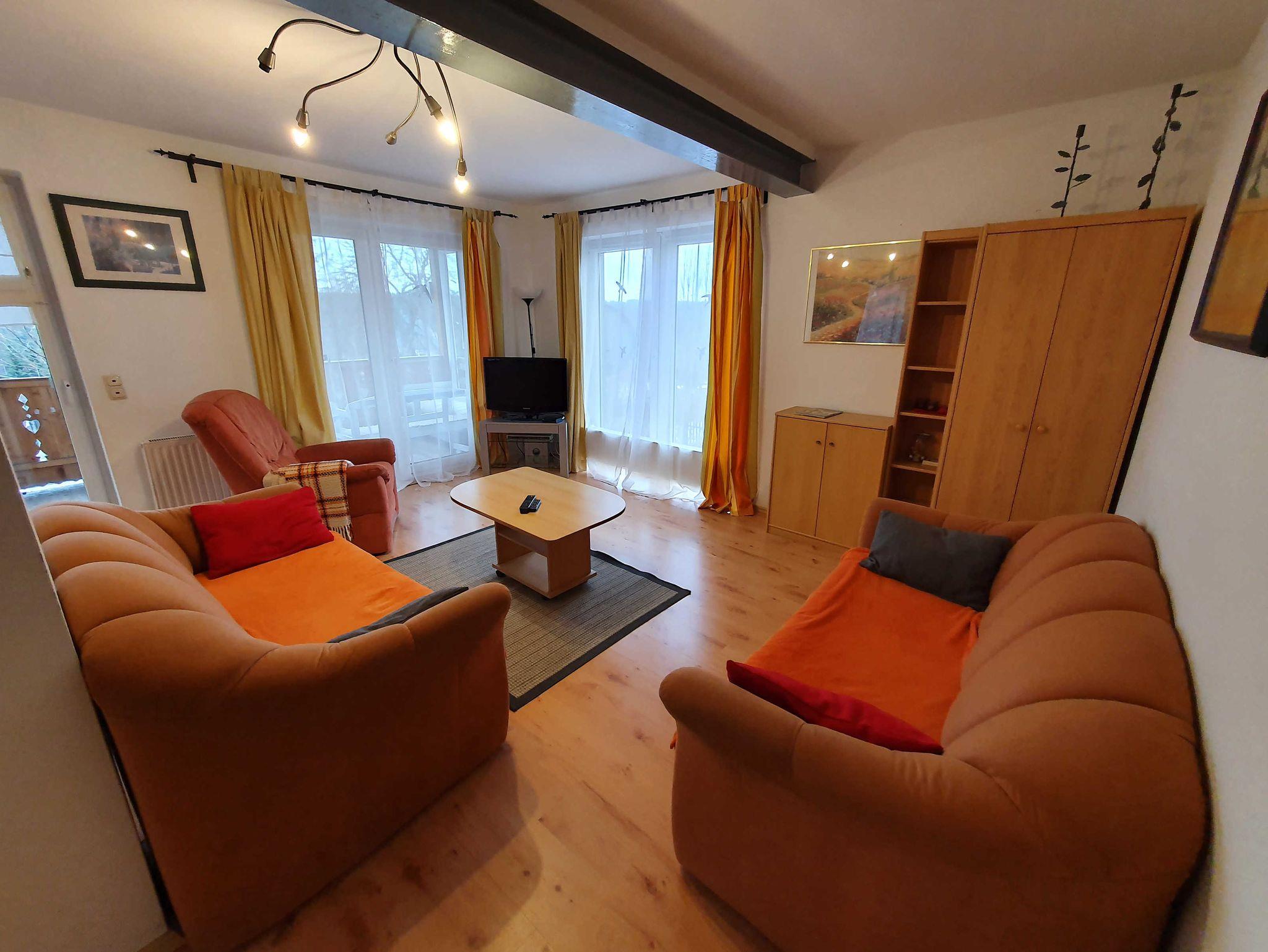 Die Ferienwohnung „Haus Anna“ bietet Ihnen Komfort für 4 Personen auf ca. 80 qm. Sie wohnen auf der gesamten unteren Etage. Zur Wohnung gehören zwei Schlafzimmer, ein Wohnzimmer mit offener Küche, eine Sauna und großzügiger Balkon. In den zwei Schlafzimmern finden je zwei Personen Platz. Zwei weitere Aufbettungen sind auf den beiden Schlafsofas im Wohnzimmer möglich.