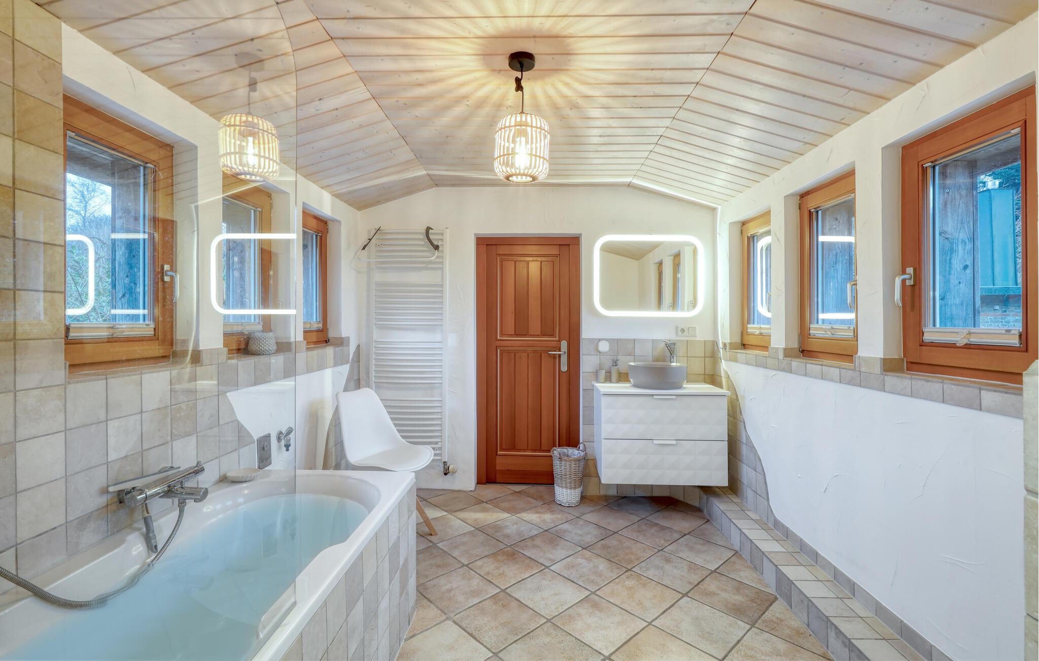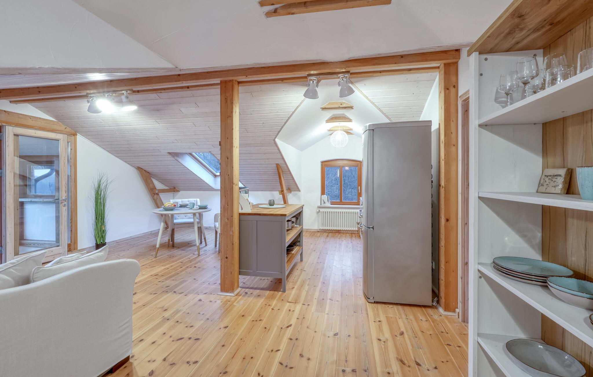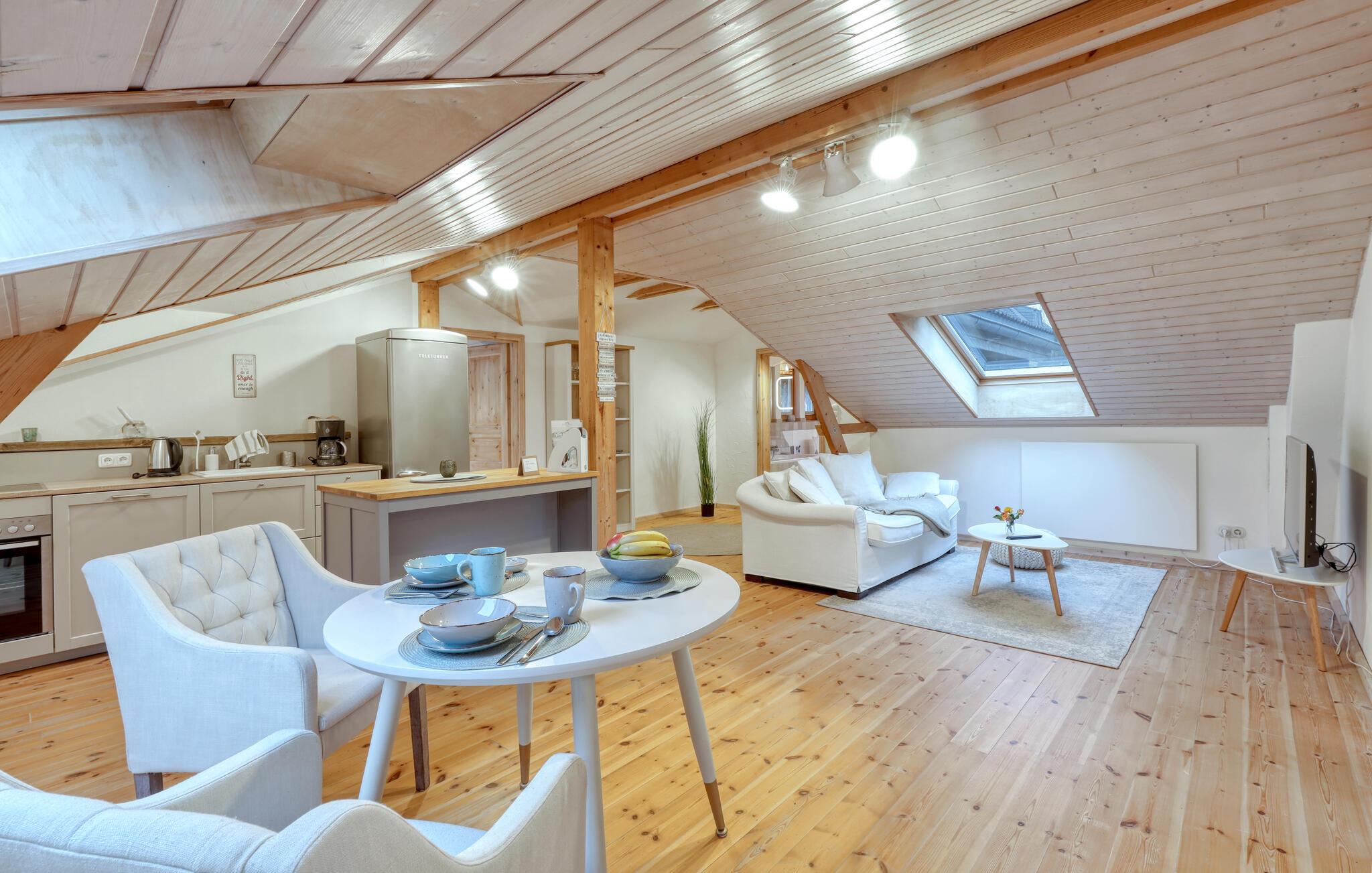 Tag en velfortjent pause og rejs som par eller med den lille familie til udkanten af Glücksburg, hvor I finder denne charmerende lejlighed i skønne, rolige omgivelser. Boligen er nydeligt indrettet med lyse træpaneler, gode møbler og et veludstyret køkken, hvor I kan tilberede jeres livretter efter en aktiv feriedag. Senere kan I rykke over i sofaen eller lænestolen med snacks og hver jeres bog, mens I lægger planer for de kommende dage.