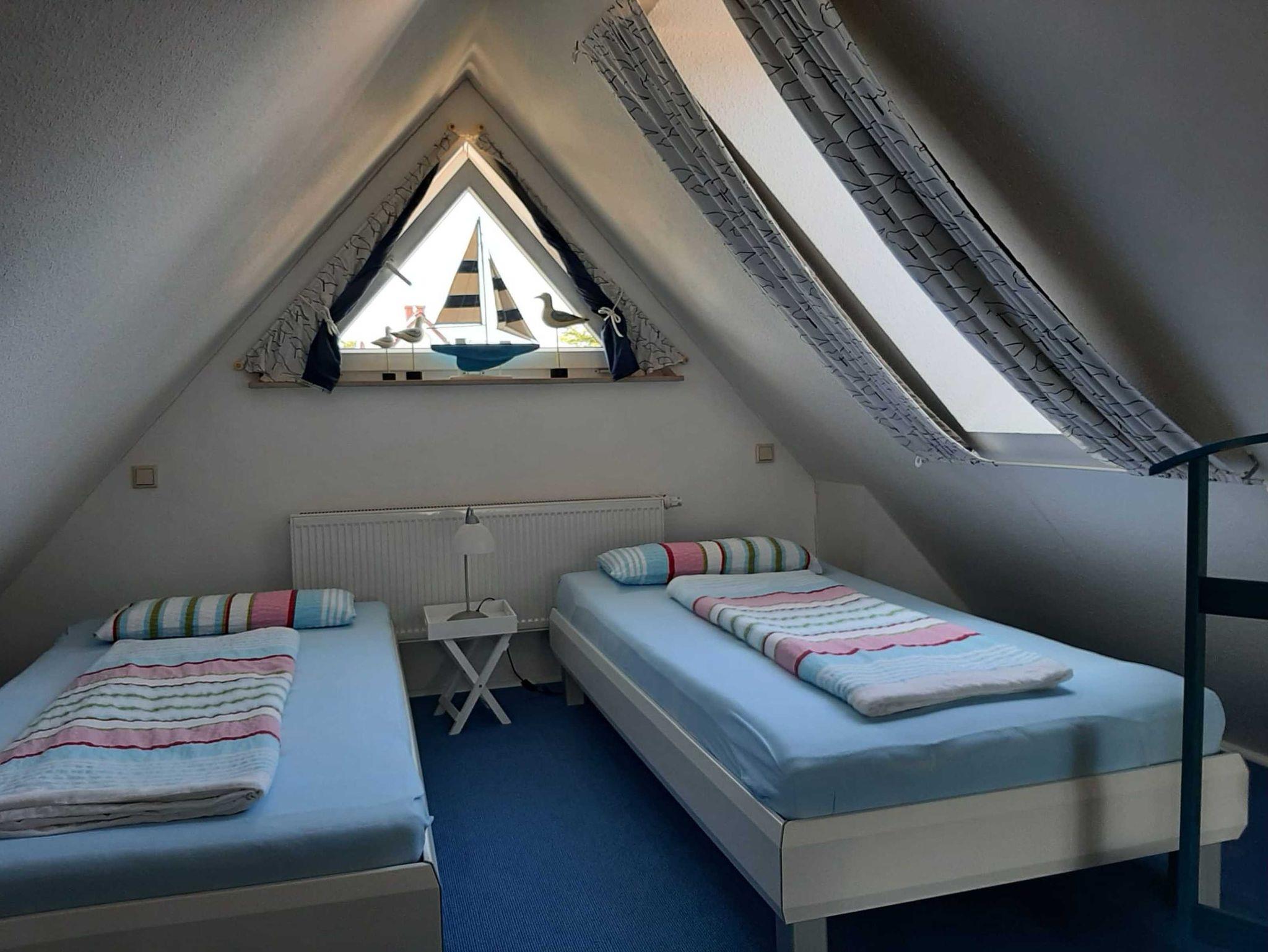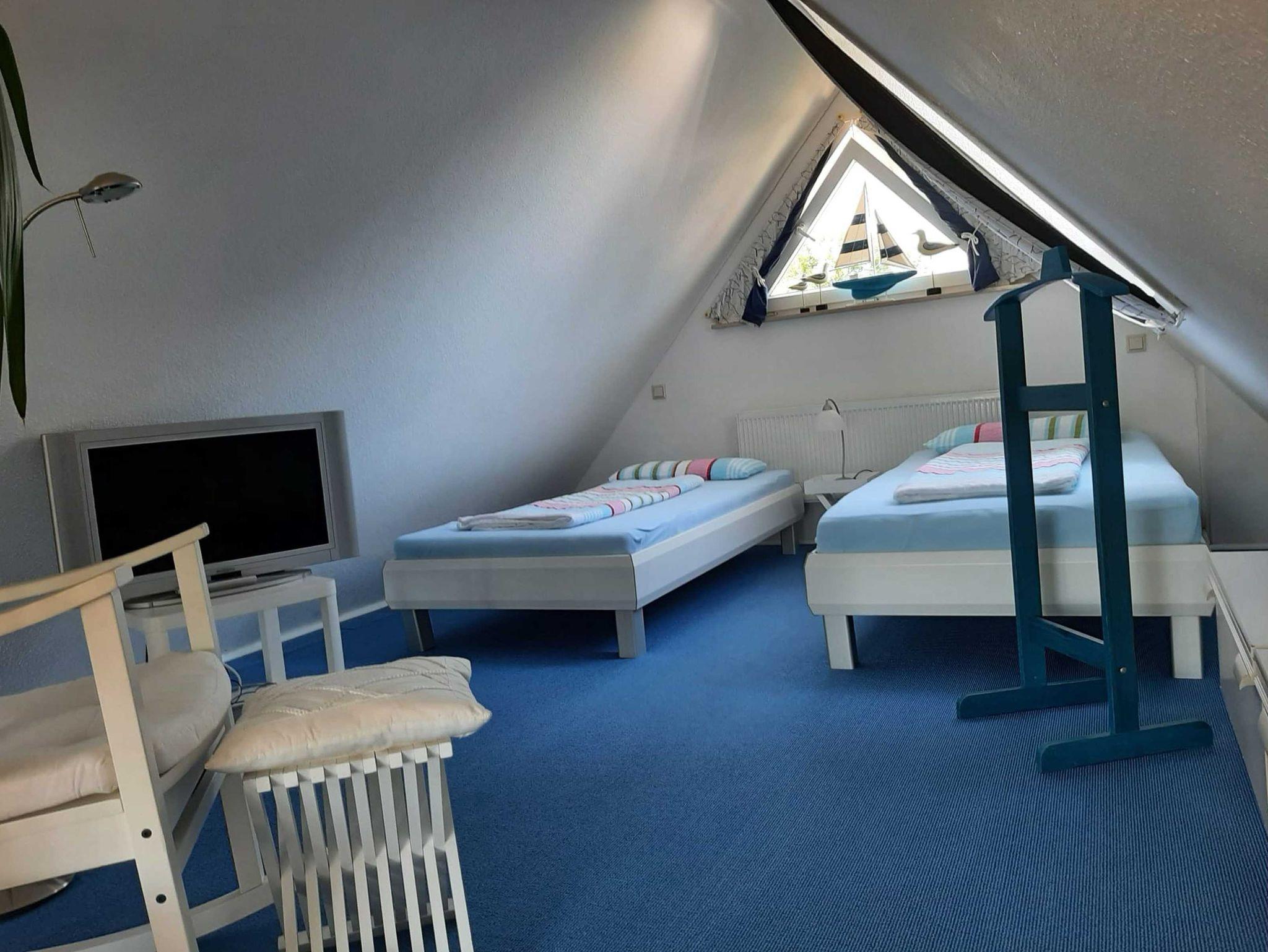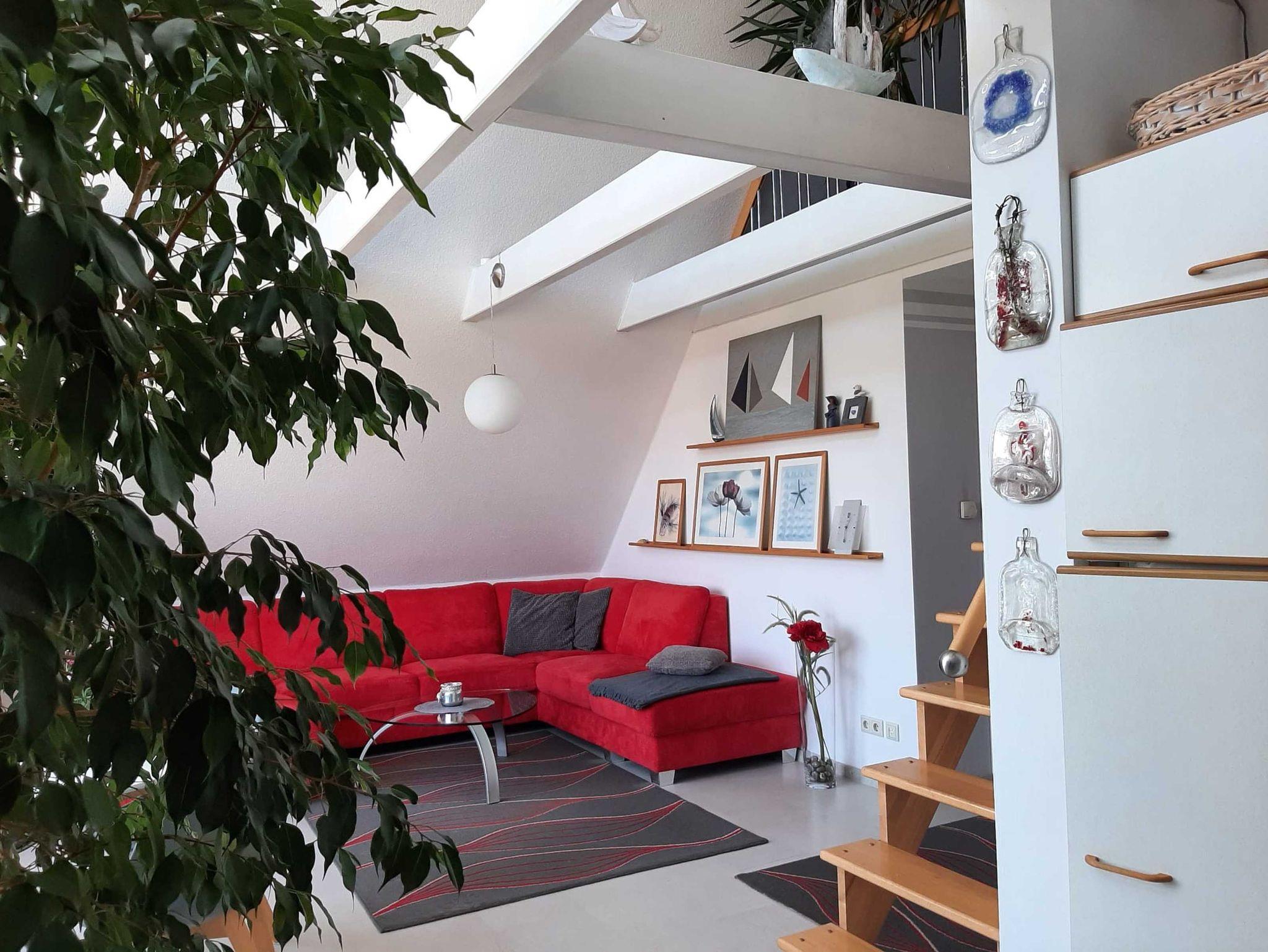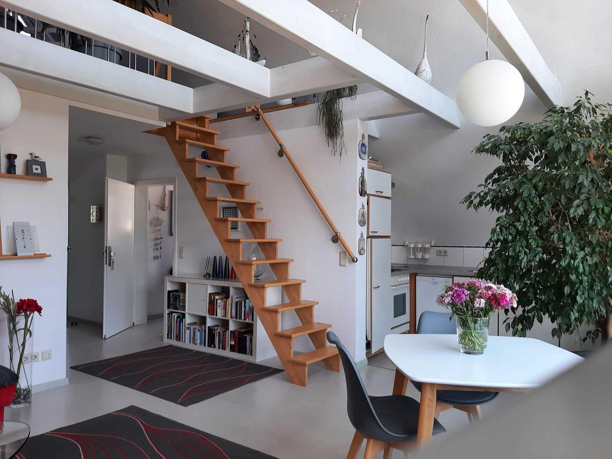 Die Ferienwohnung verfügt über zwei Schlafräume, einen ausgebauten Spitzboden, eine offene Küche zum Wohnraum sowie ein Bad mit Badewanne und separater Dusche.