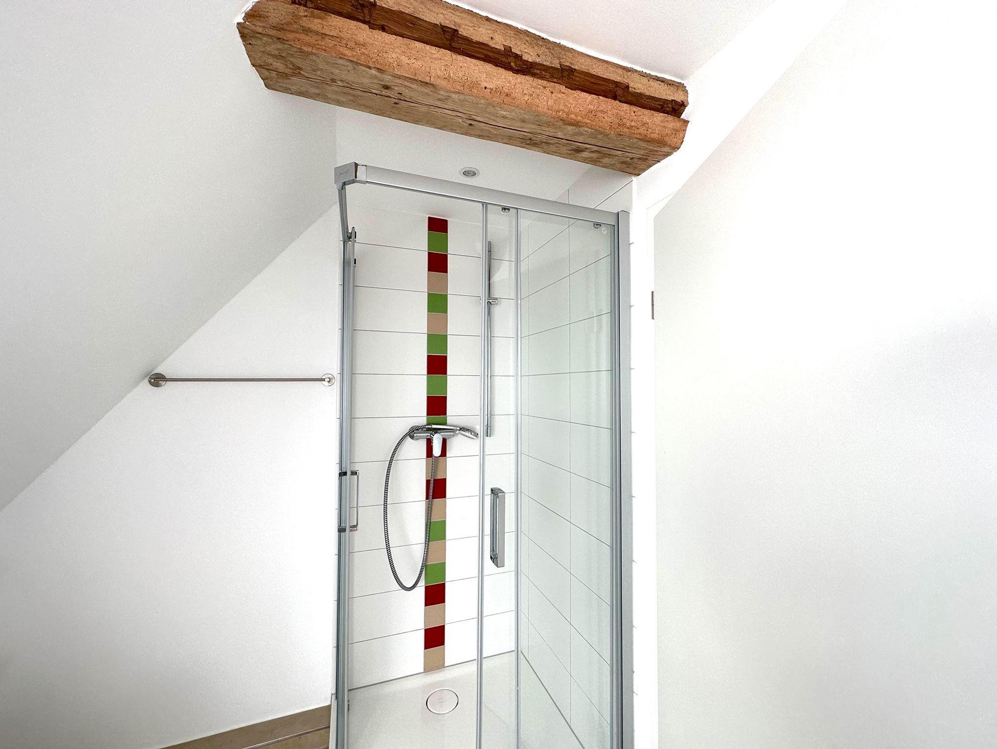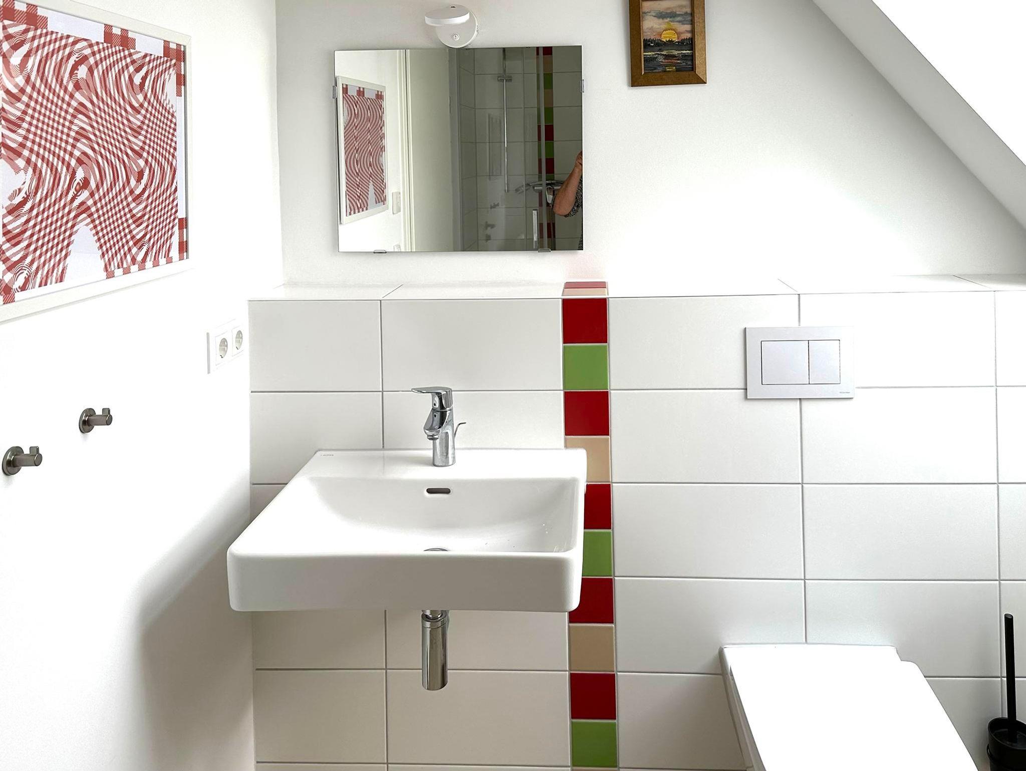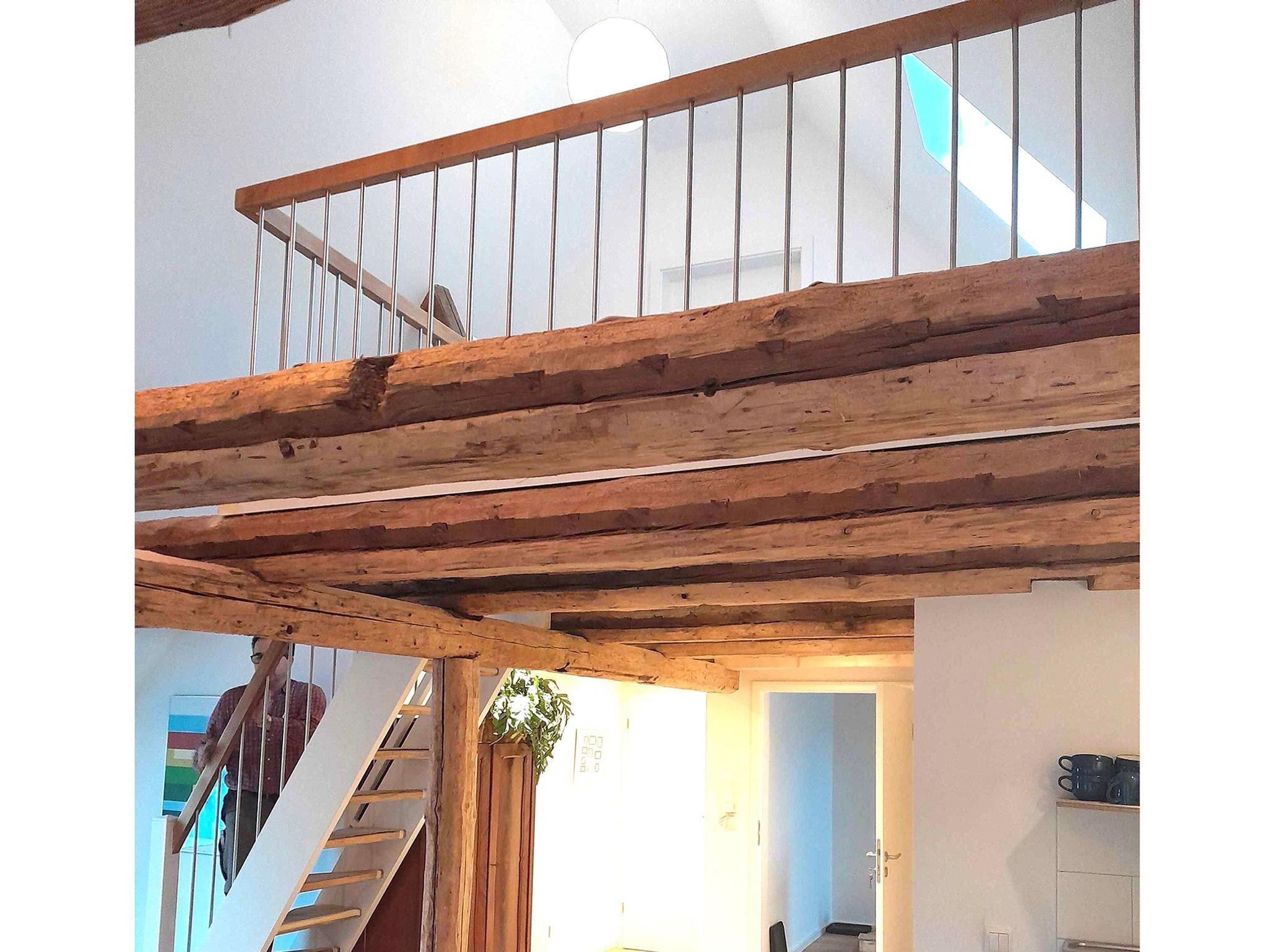 Die Fewo Horst 1_ rot im OG ist grundsaniert und ganz neu. Die 60 qm plus 6 qm Empore bieten Raum für 1-3 Personen bzw. plus Schlafsofa 5 Personen. Der großzügige Wohnbereich ist zum Dach geöffnet. Die freigelegten Balken und der Holzfußboden geben der Wohnung ein besonderes Flair – attraktiv ist die Empore als Rückzugsort oder zum Spielen. Es gibt zwei Schlafzimmer: einen Doppelbett-Schlafraum und einen weiteren Einzelbett-Schlafraum. Zusätzlich gibt es ein hochwertiges Schlafsofa, auf dem zwei Personen gut schlafen können. Das Duschbad ist geräumig und hell. Die Küchenzeile und die Elektrogeräte darin sind neu.