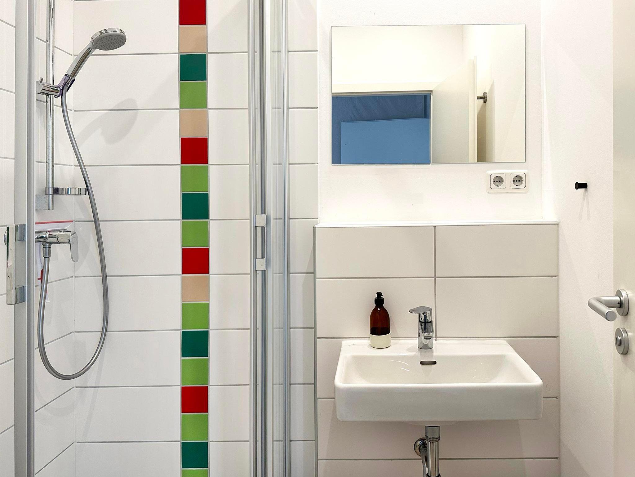 Das Doppelzimmer in der ersten Etage der Pension hat ein eigenes Duschbad mit WC und ist frisch renoviert. Es wirkt hell und freundlich und vermittelt durch das schöne Stäbchenpakett sowie die stylische Sitzecke eine besondere Atmosphäre – dieses Zimmer ähnelt Zimmer 10.