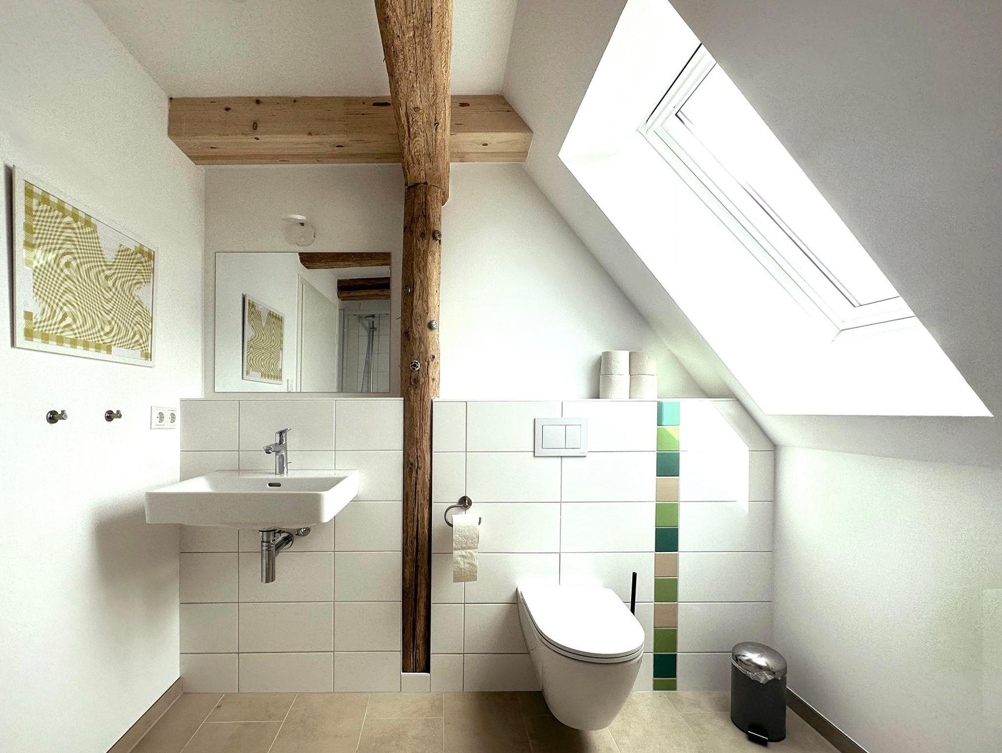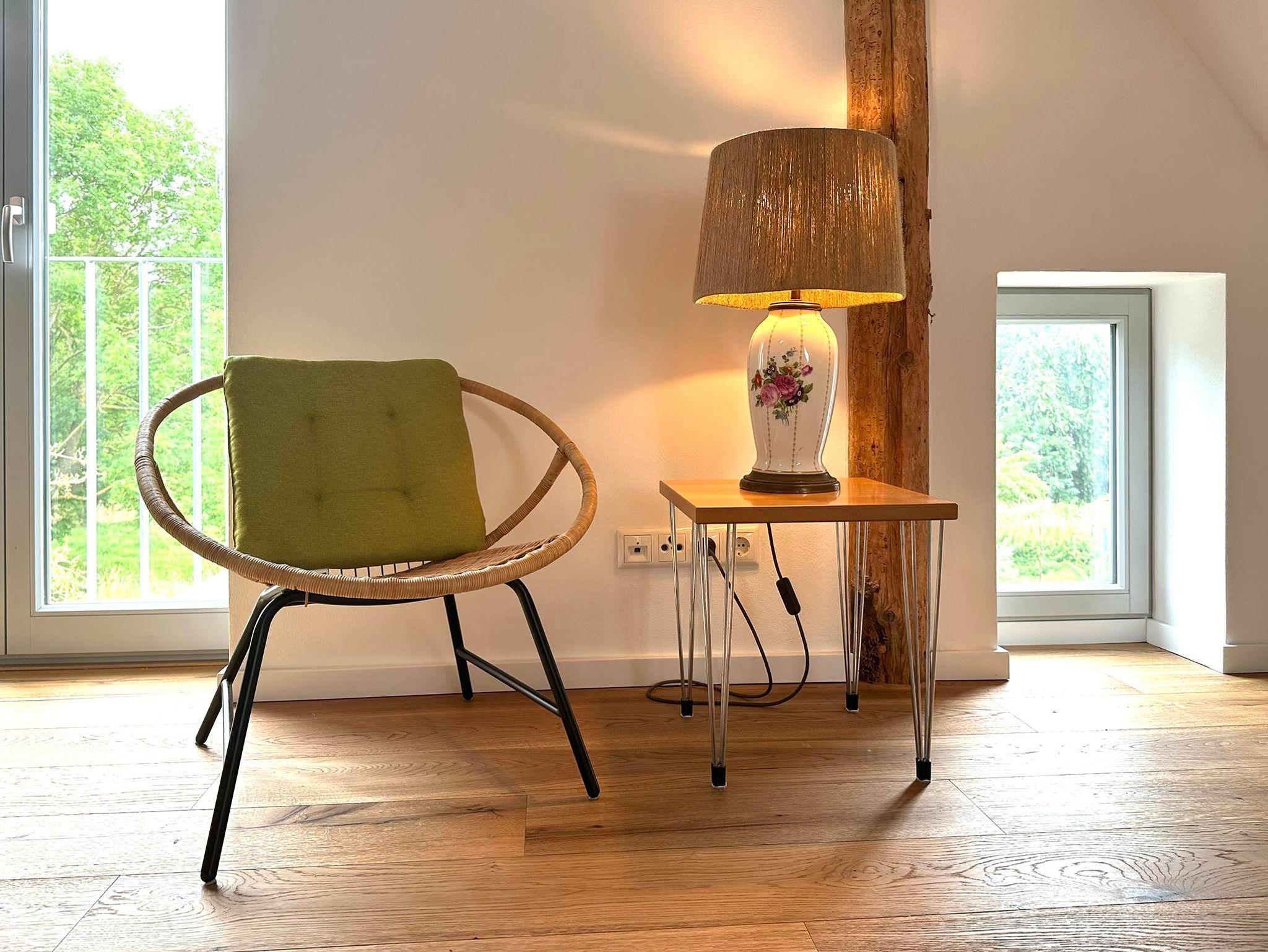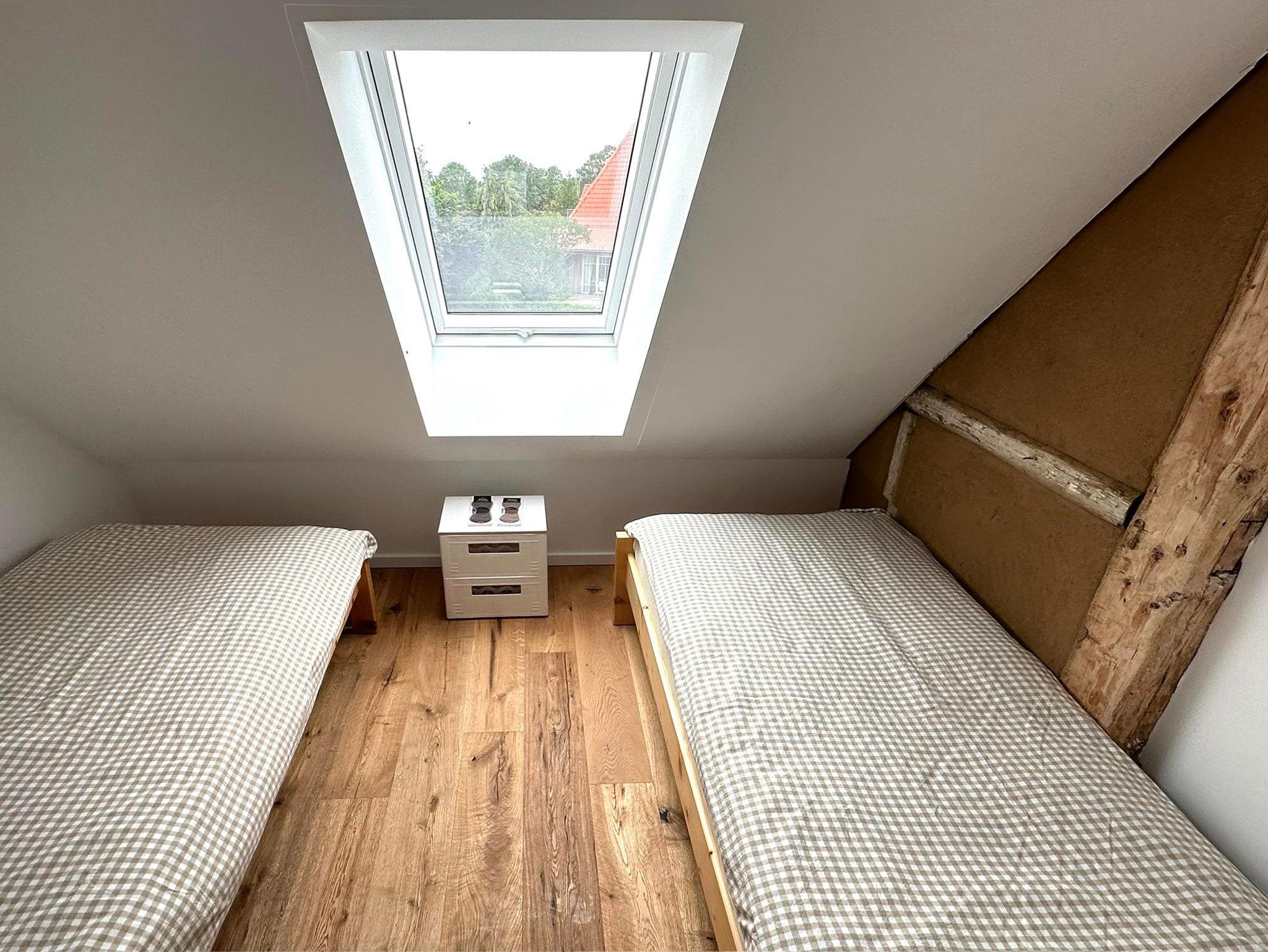 Die Fewo Horst2_ grün im OG ist grundsaniert und ganz neu. Die 60 qm plus 6 qm Empore bieten Raum für 4-5 Personen. Der großzügige Wohnbereich ist zum Dach geöffnet. Die freigelegten Balken und der Holzfußboden geben der Wohnung ein besonderes Flair – attraktiv ist die Empore als Rückzugsort oder zum Spielen. Es gibt zwei Schlafzimmer: einen Doppelbett-Schlafraum und einen weiteren mit zwei Einzelbetten. Zusätzlich gibt es eine Schlafkammer mit einem Einzelbett (offen zum Wohnraum). Das Duschbad ist gräumig und hell. Die Küchenzeile und die Elektrogeräte darin sind neu.