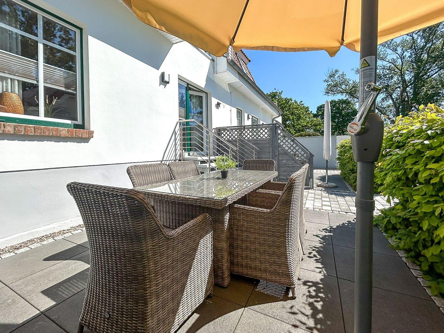 Die überdachte Holzterrasse des angrenzenden Gebäudes ist für alle Gäste frei nutzbar. Von hier aus kannst du auch prima die untergehende Sonne genießen.