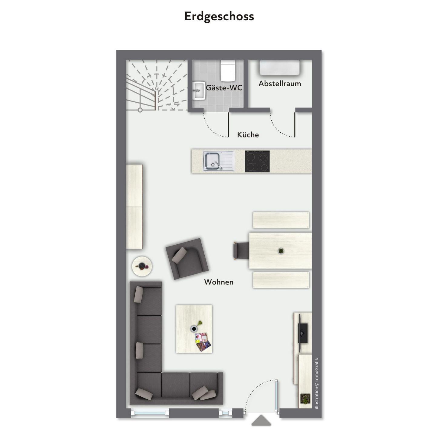 In der Flurnische ist weiterhin die Garderobe mit ausreichend Platz zum Ablegen deiner Jacken und Taschen untergebracht. Die gesamte untere Etage ist mit einer Fußbodenheizung versehen, die in den kalten Monaten eine wohlige Wärme bietet.