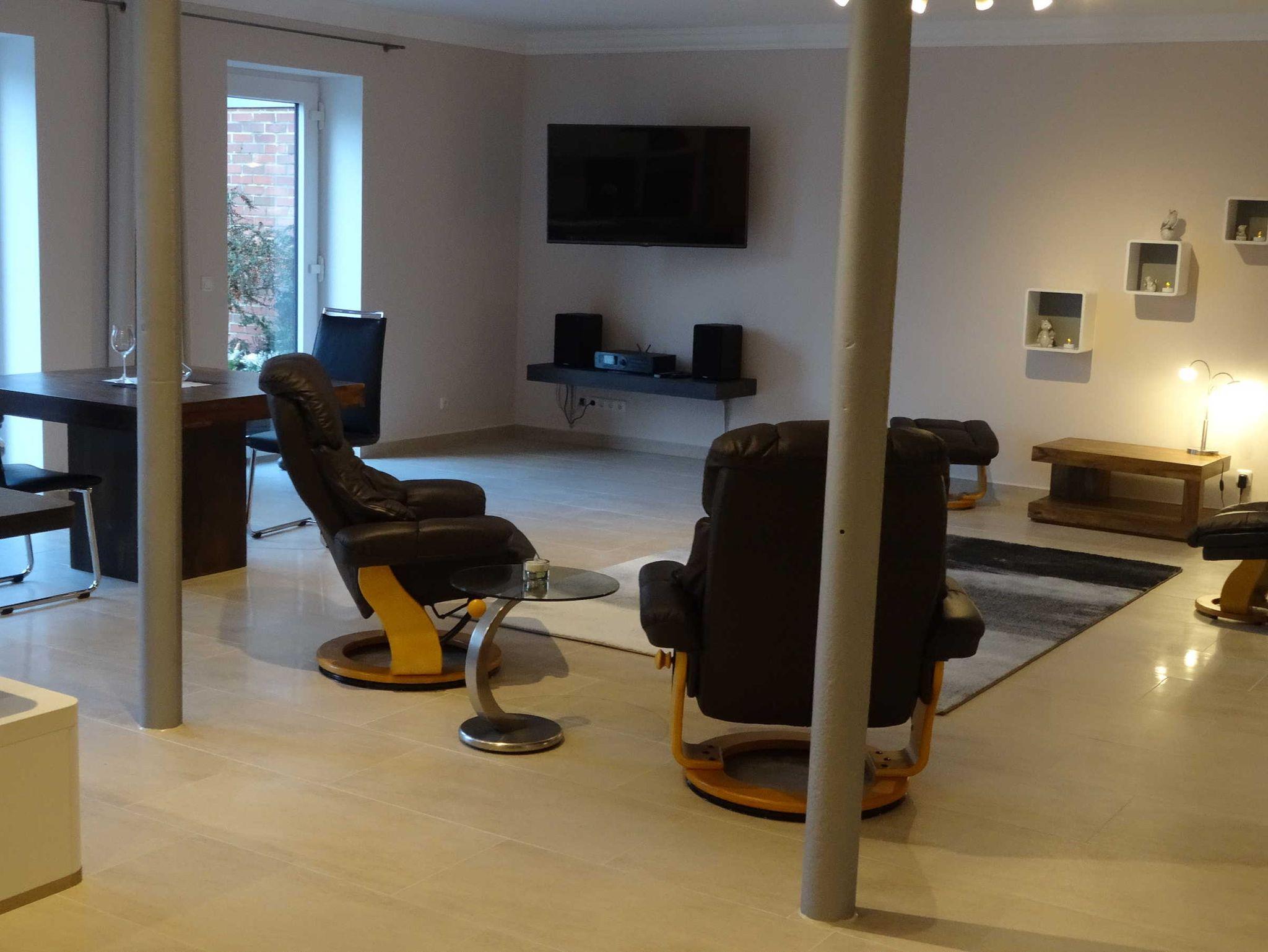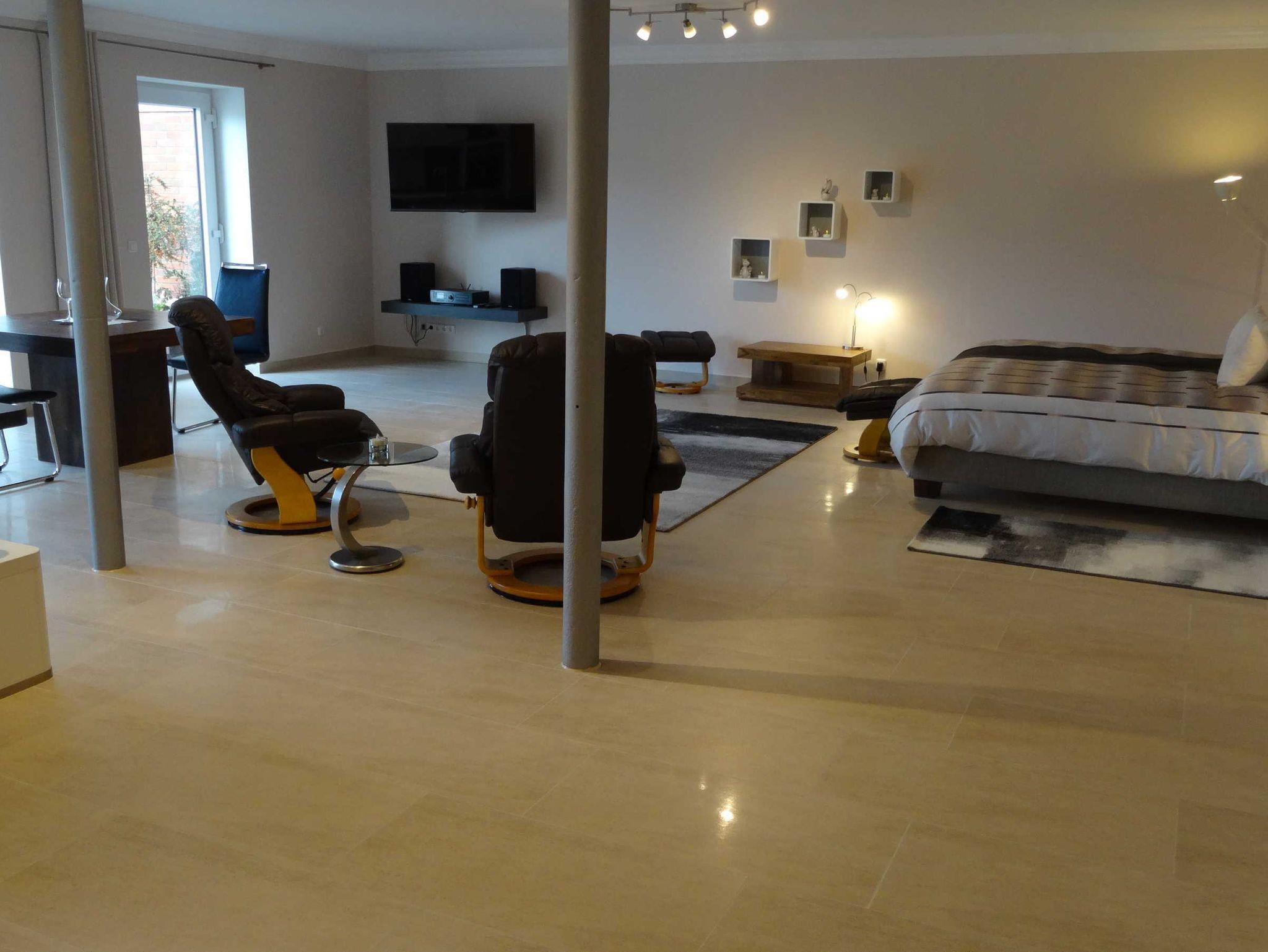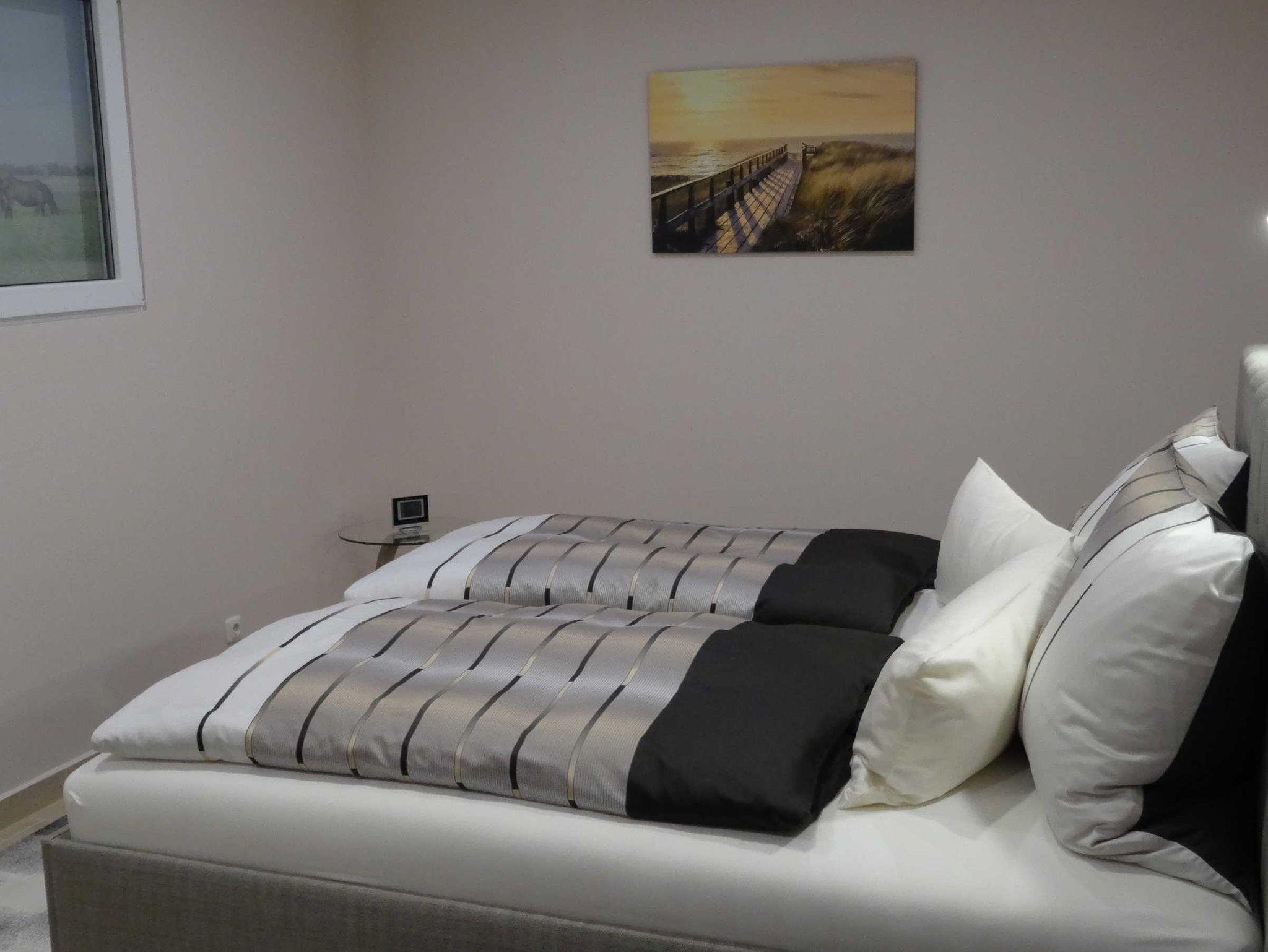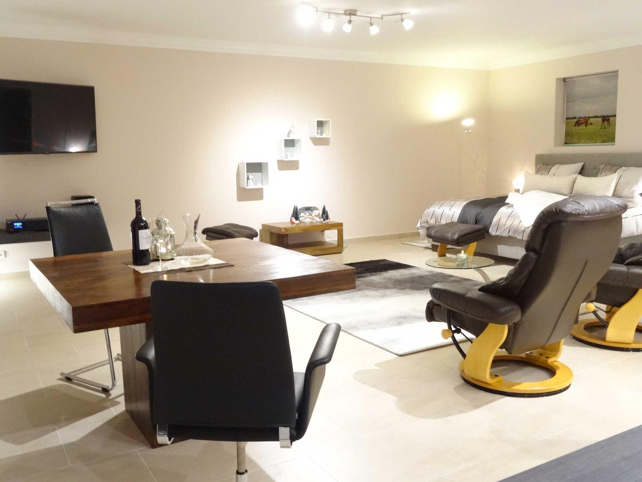 Die 150 qm Ferienwohnung im Erdgeschoss bietet für 2 bis 4 Personen ein behagliches Domizil für Entdeckungen. Die großen Fenster lassen die Nachmittagssonne herein. Der Flachbild Fernseher sowie eine Internet Radioanlage mit integriertem CD-Player ist vorhanden. In dem großen Schlafzimmer ist ein Boxspringbett für 2 Personen nach neusten Erkenntnissen mit einer Komfort-Matratze und der kuscheligen Bettwäsche vorzufinden. . Einfach schön! Die offene Küche ist nach neusten Erkenntnissen mit einem Tresen ausgestattet.Es ist ausreichend Porzellan und Geschirr vorhanden. Ein Wasserkocher, eine Kaffeemaschine, ein Toaster, einige Töpfe und eine Bratpfanne sind im Schrank platziert.Das barrierefreie Dusch-Bad ist mit einem Fön, einem Kosmetikspiegel und einer Waschmaschine ausgestattet. Es sind ausreichend Handtücher vorhanden. Das Auto stellen sie auf dem Privatparkplatz ab. Die Fahrräder werden unter Verschluss abgestellt.