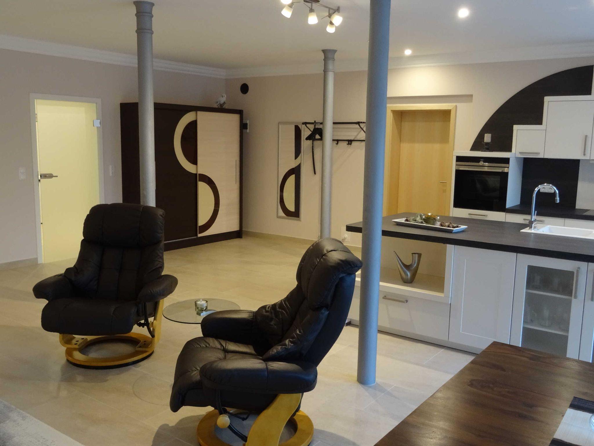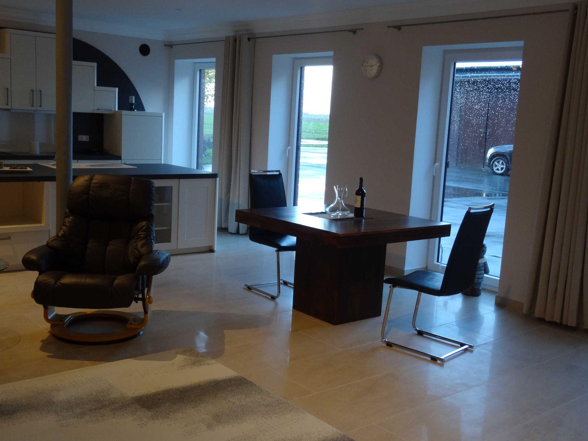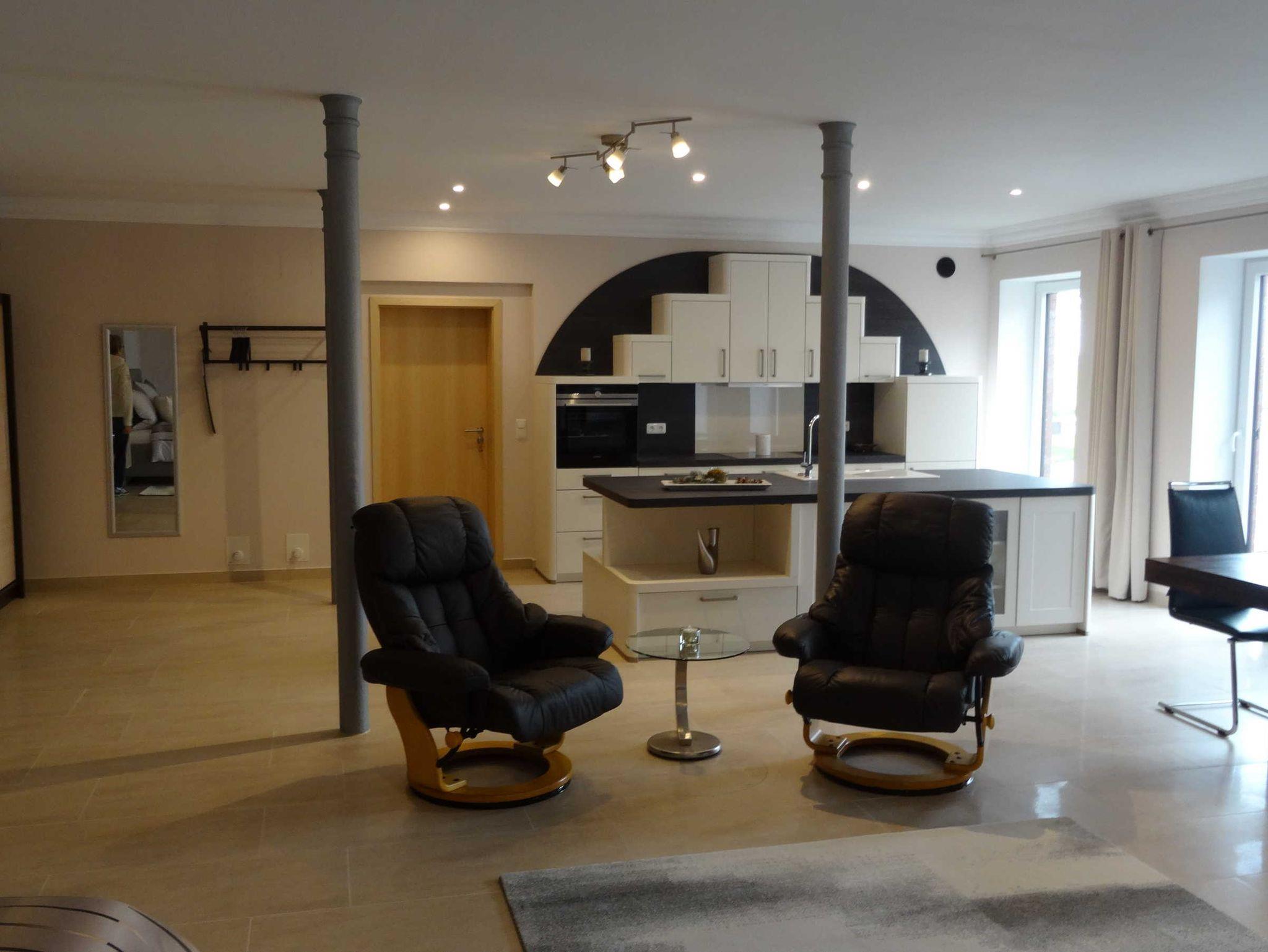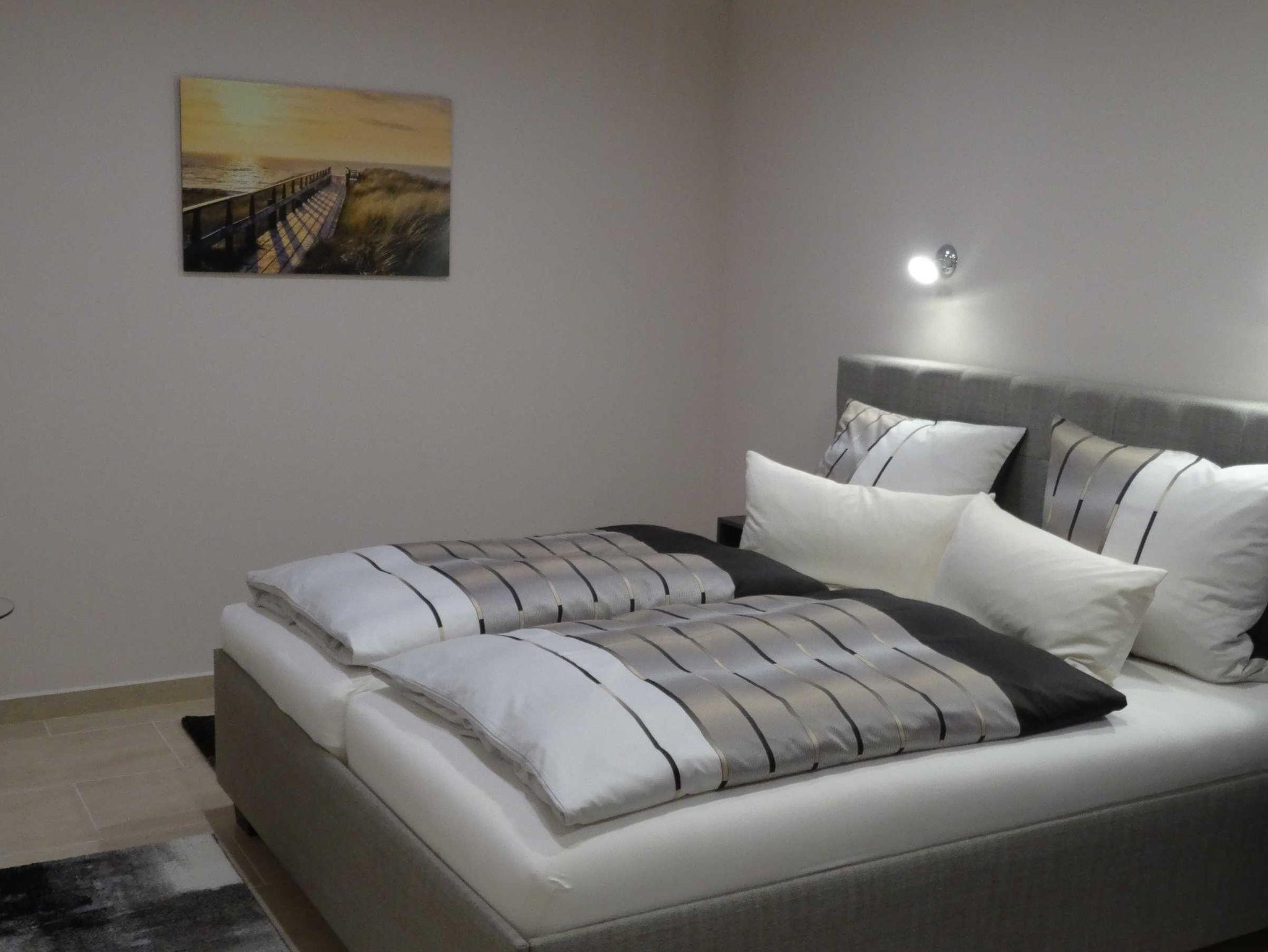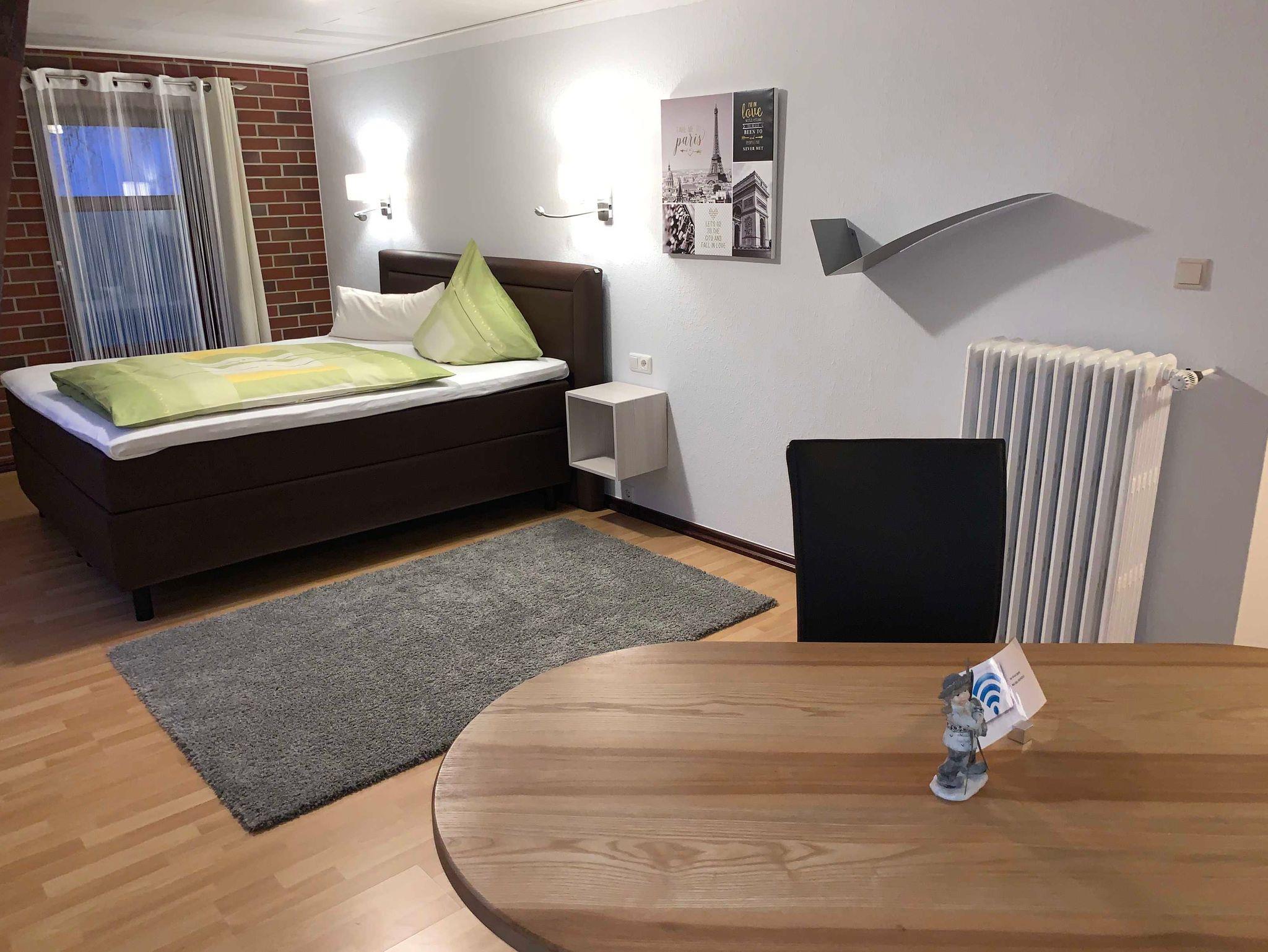 Die 150 qm Ferienwohnung im Erdgeschoss bietet für 2 bis 4 Personen ein behagliches Domizil für Entdeckungen. Die großen Fenster lassen die Nachmittagssonne herein. Der Flachbild Fernseher sowie eine Internet Radioanlage mit integriertem CD-Player ist vorhanden. In dem großen Schlafzimmer ist ein Boxspringbett für 2 Personen nach neusten Erkenntnissen mit einer Komfort-Matratze und der kuscheligen Bettwäsche vorzufinden. . Einfach schön! Die offene Küche ist nach neusten Erkenntnissen mit einem Tresen ausgestattet.Es ist ausreichend Porzellan und Geschirr vorhanden. Ein Wasserkocher, eine Kaffeemaschine, ein Toaster, einige Töpfe und eine Bratpfanne sind im Schrank platziert.Das barrierefreie Dusch-Bad ist mit einem Fön, einem Kosmetikspiegel und einer Waschmaschine ausgestattet. Es sind ausreichend Handtücher vorhanden. Das Auto stellen sie auf dem Privatparkplatz ab. Die Fahrräder werden unter Verschluss abgestellt.
