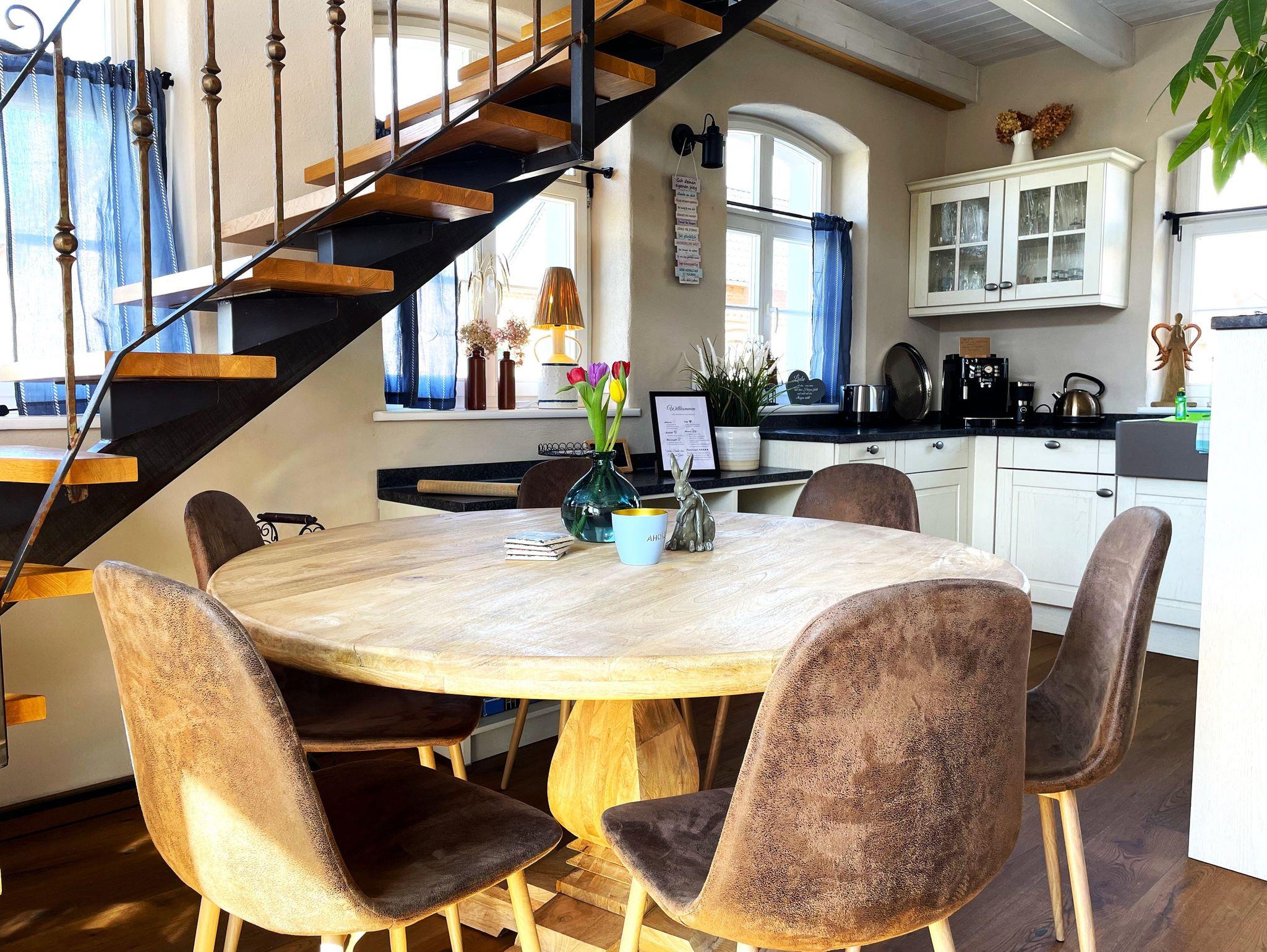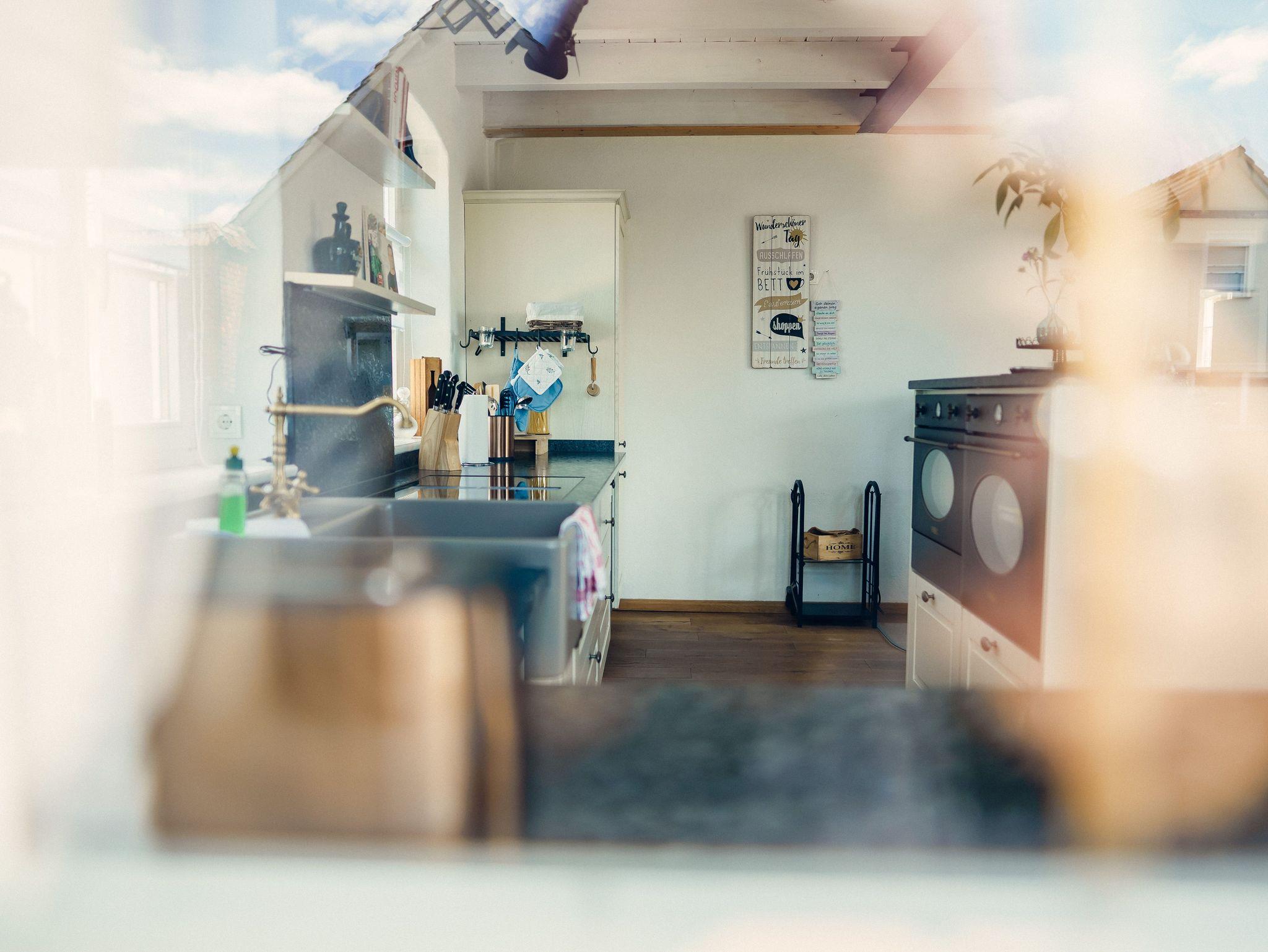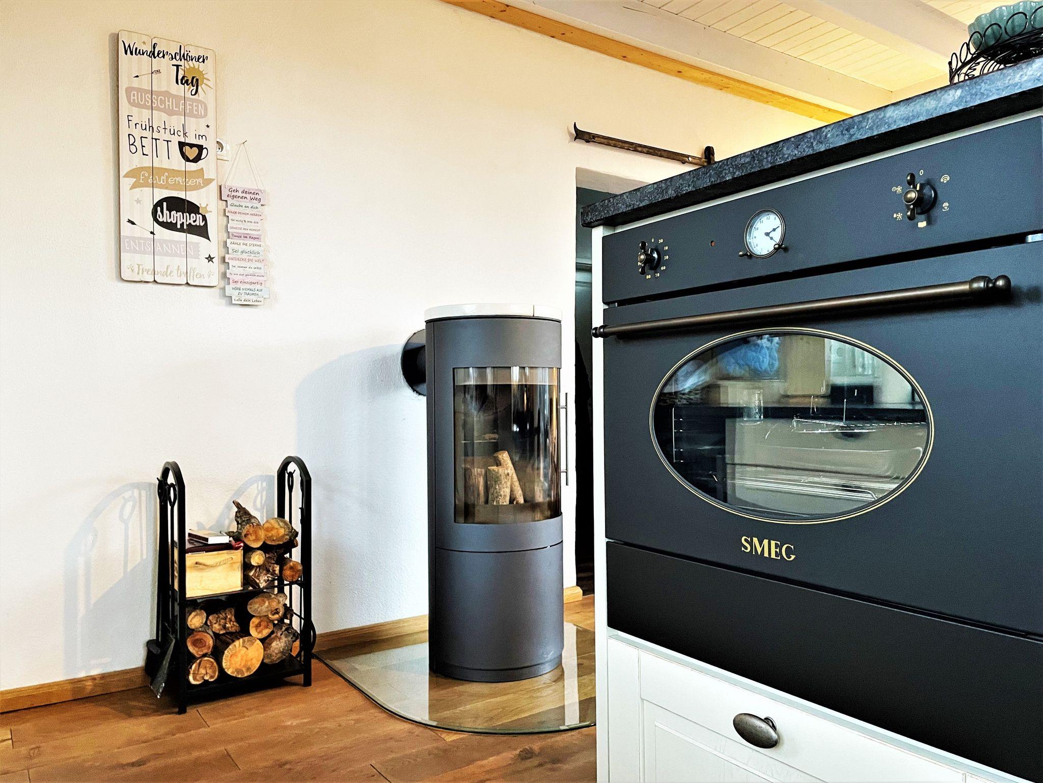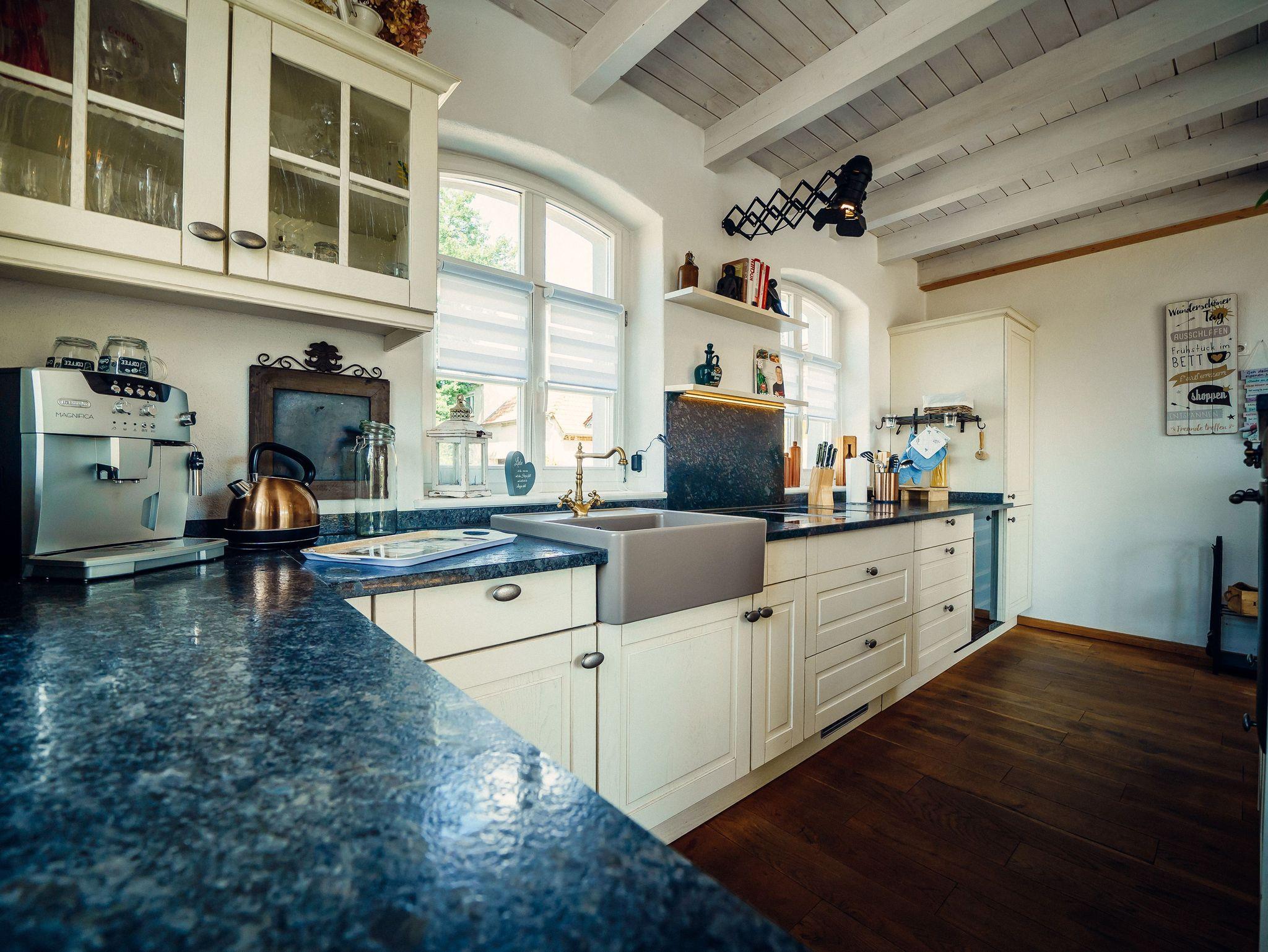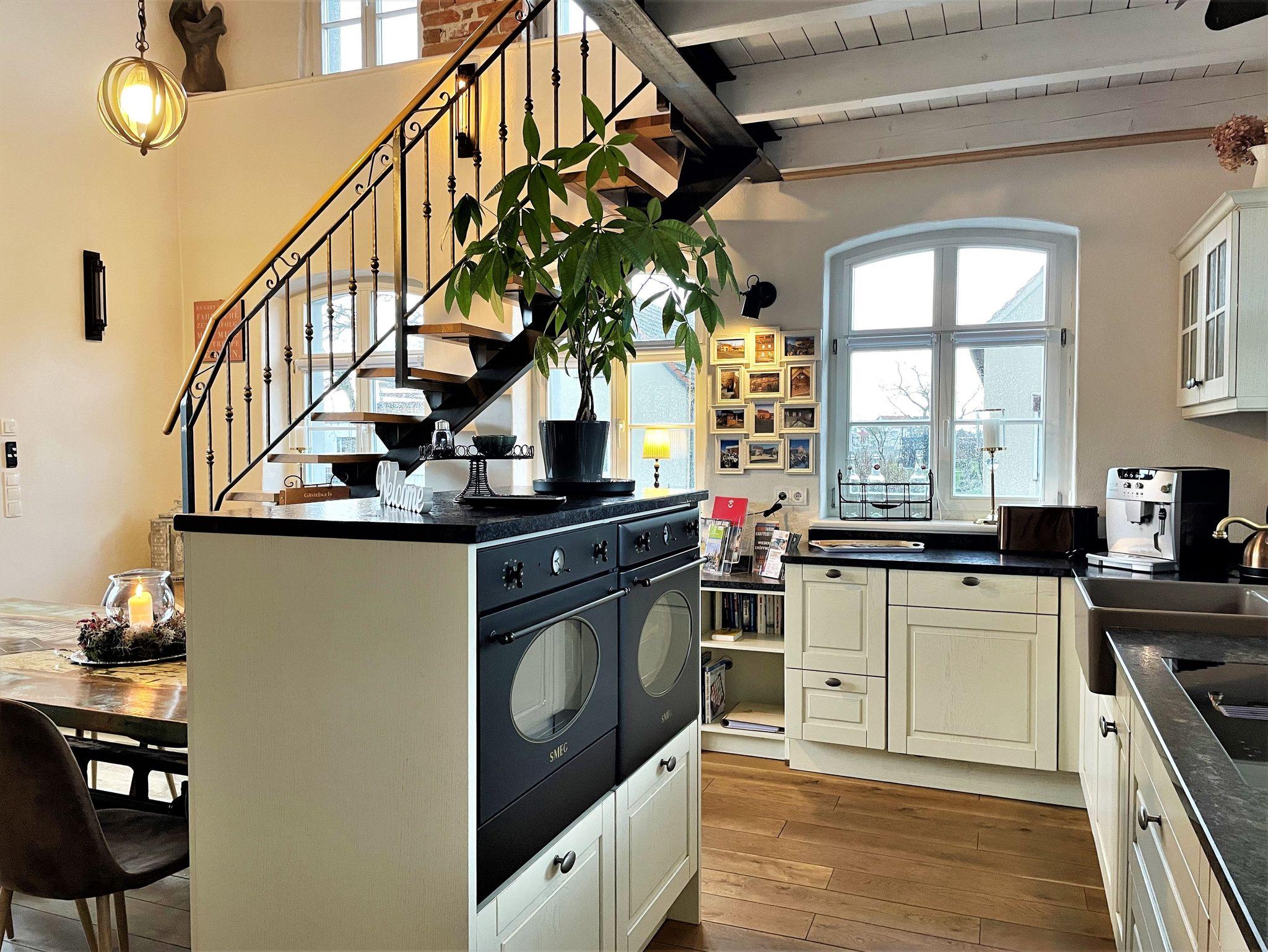Die große, offene Küche ist modern eingerichtet und lädt zum Verweilen ein. Ausgestattet ist diese mit Kühlschrank sowie Gefriermöglichkeit, Backofen im Retrostyle und einem Geschirrspüler. Zu weiteren Annehmlichkeiten zählten Kaffeemaschine, Wasserkocher, Toaster und ein Weinkühlschrank. Ein Kamin sorgt für wohlige Wärme.