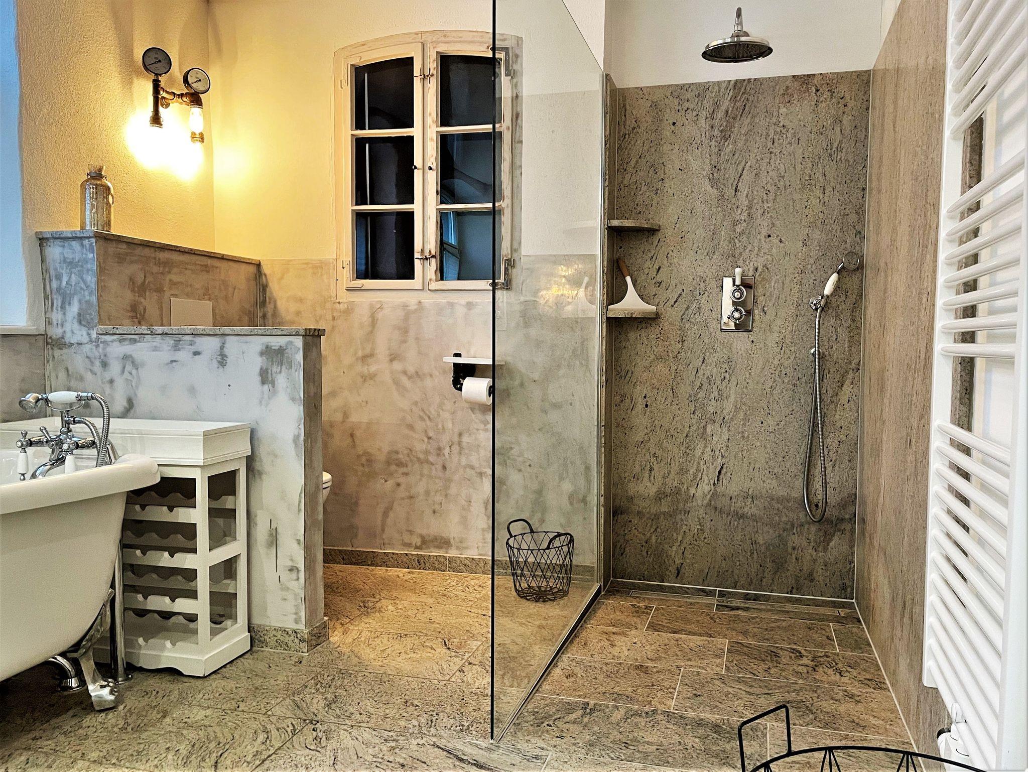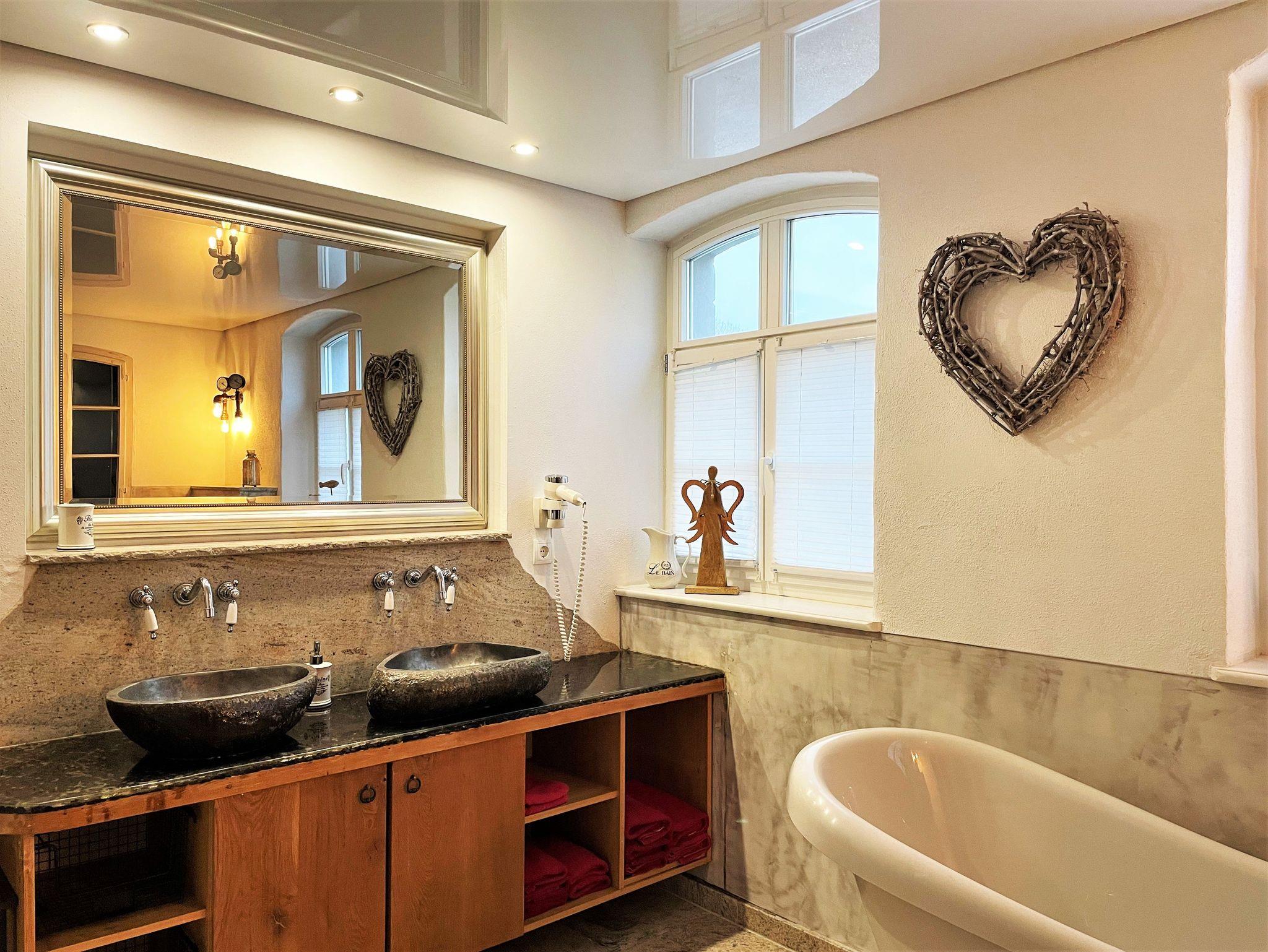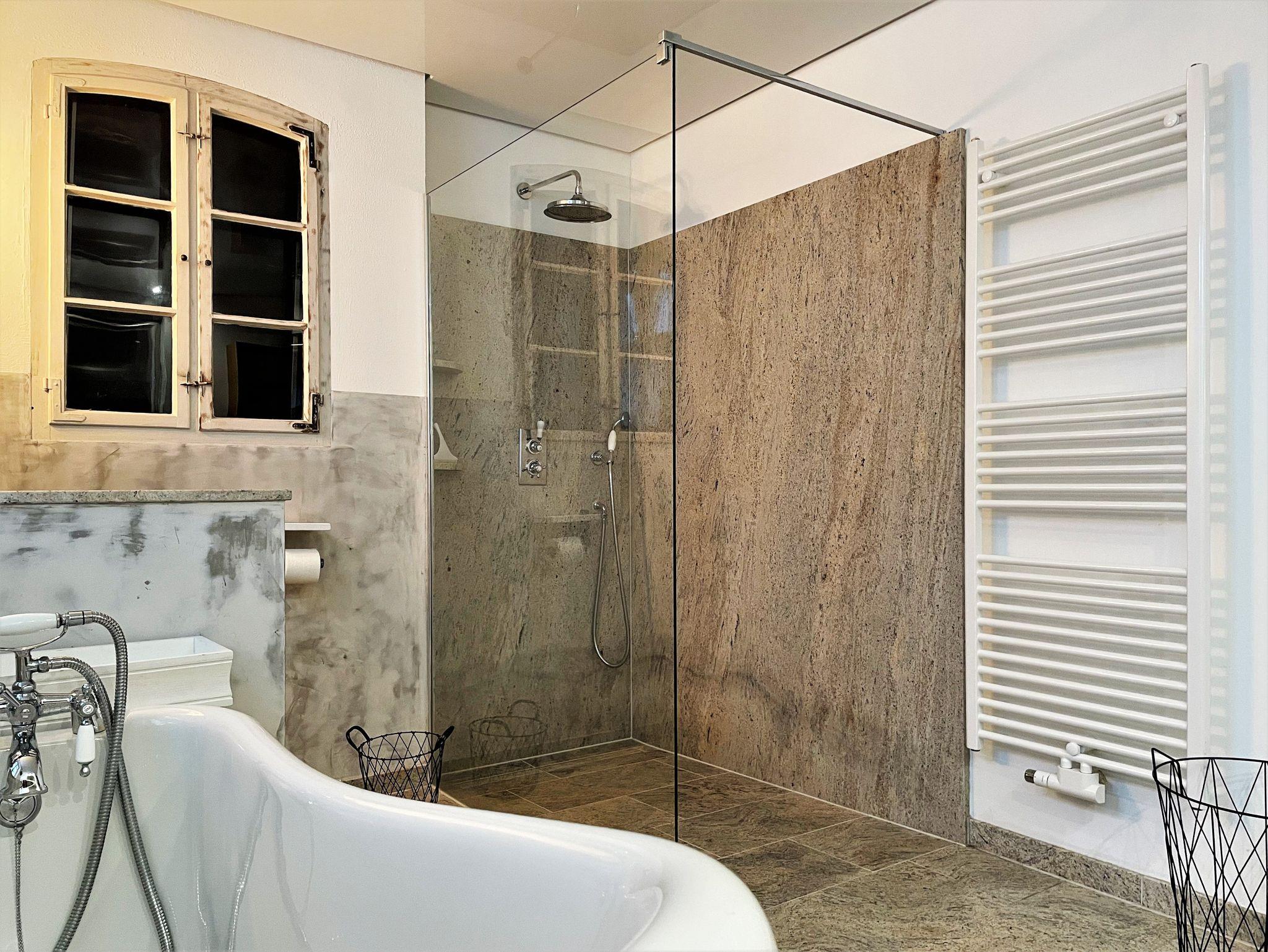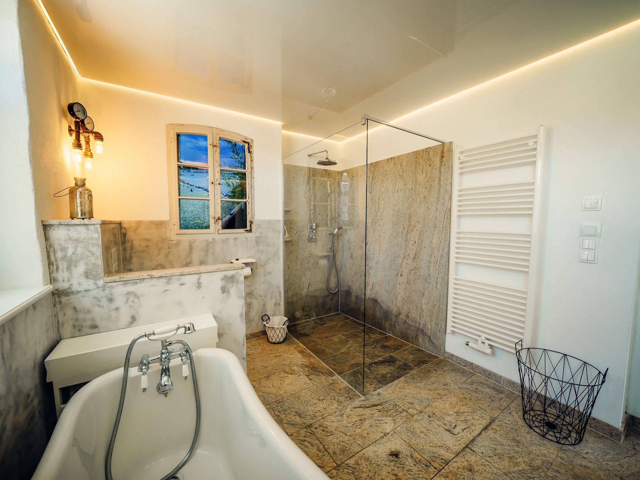 Ein großes Badezimmer in der unteren Etage ist mit einer Badewanne, begehbarer Dusche und einem Waschtisch mit 2 Waschbecken eingerichtet.