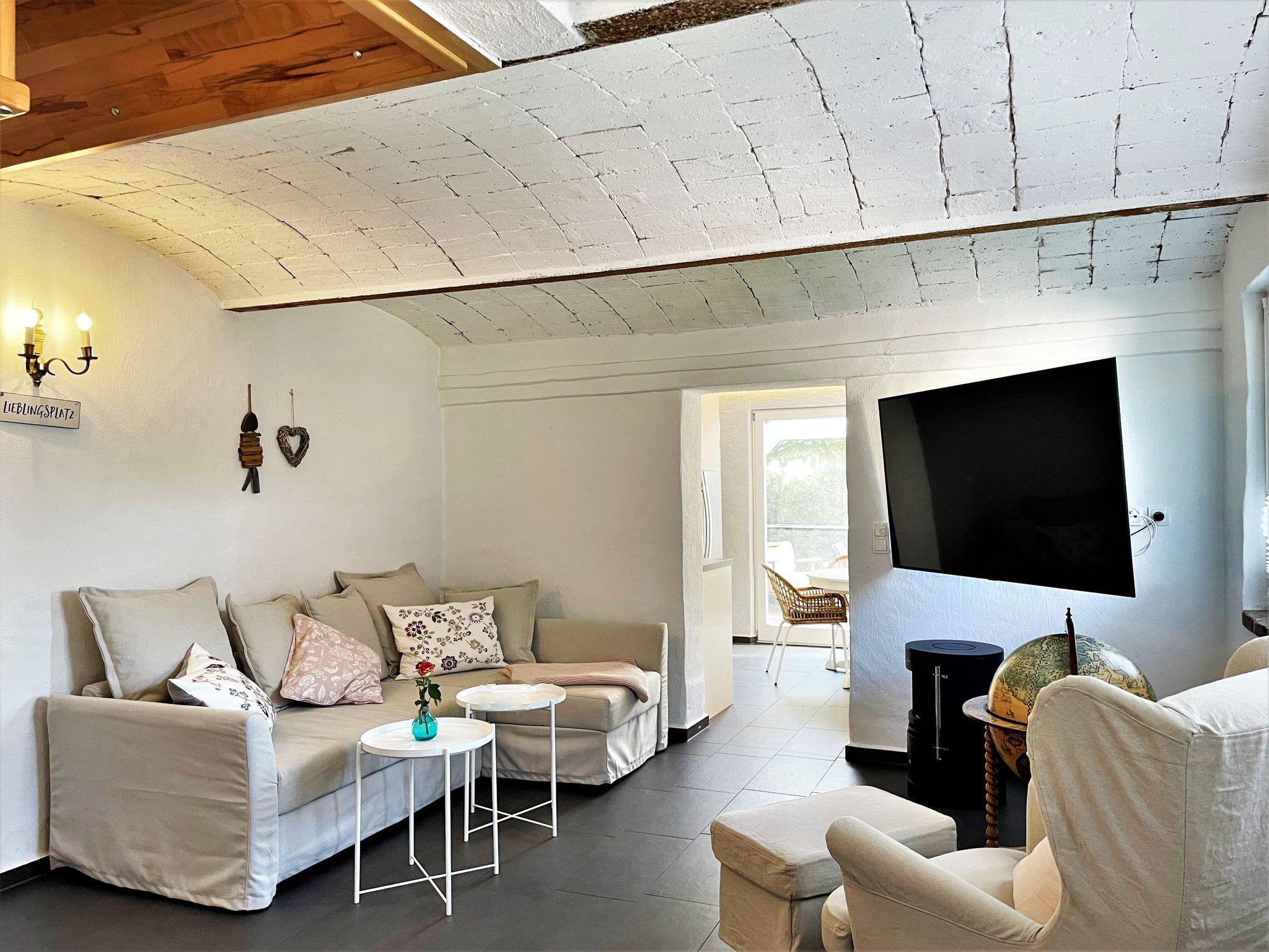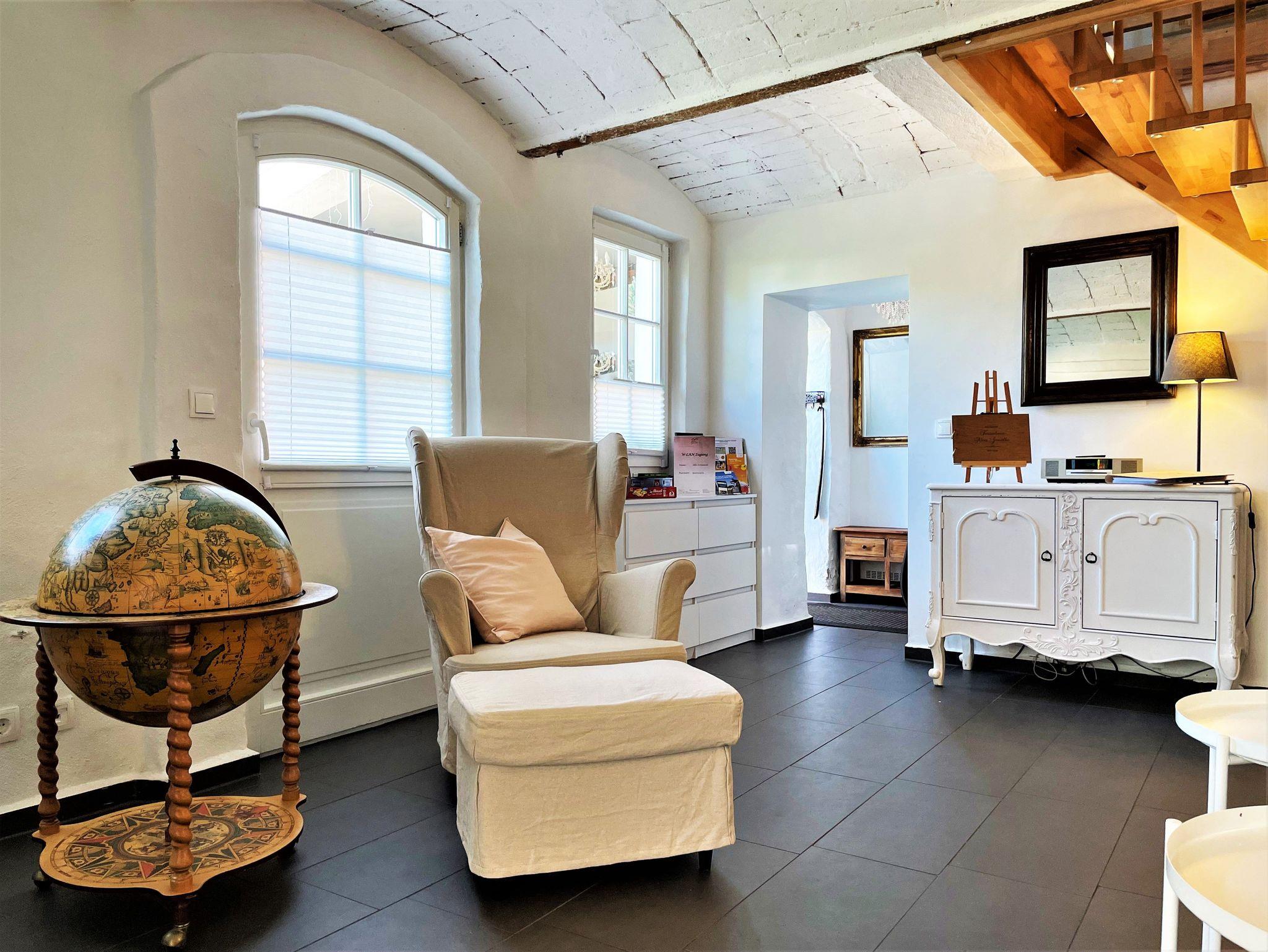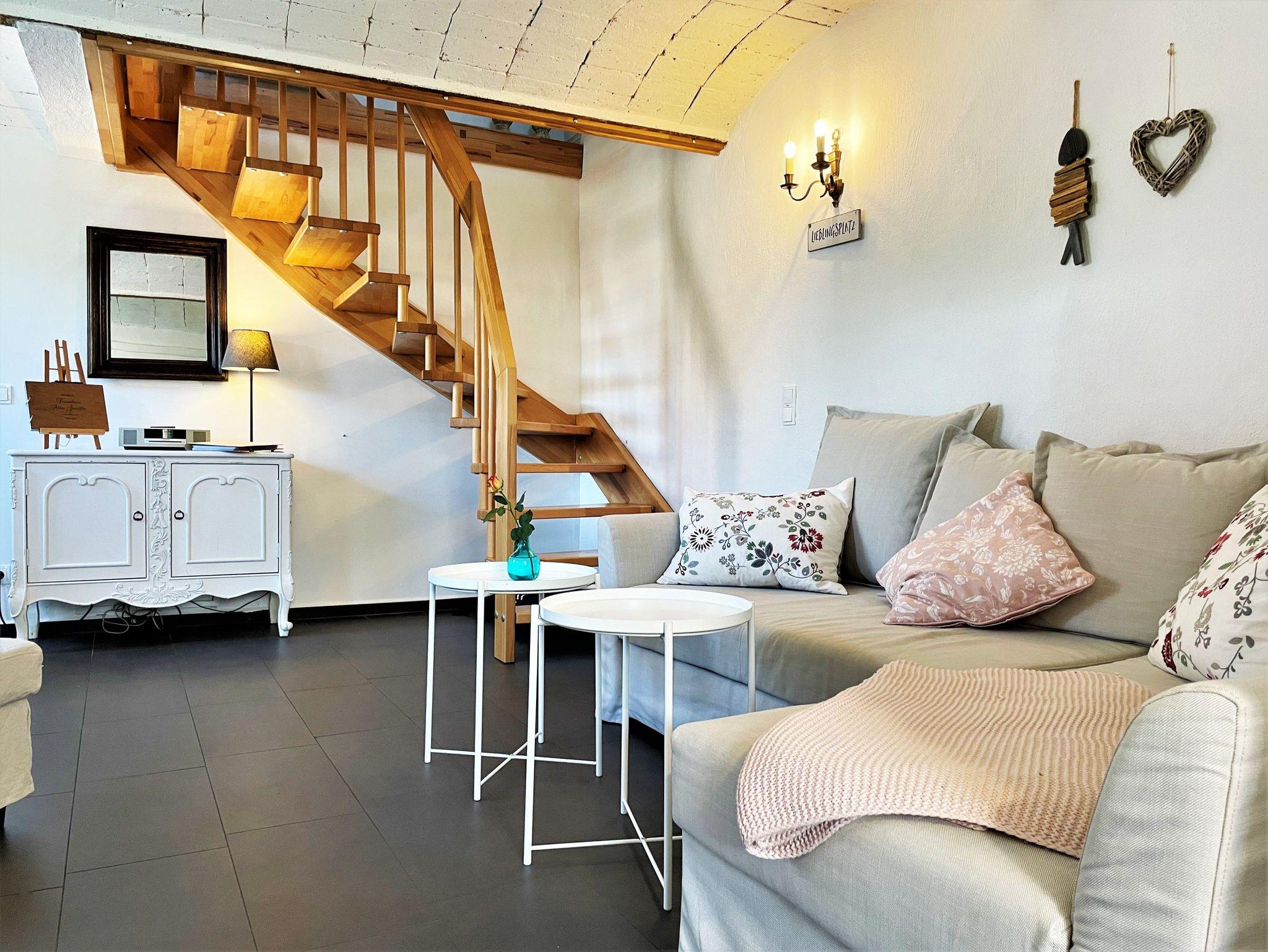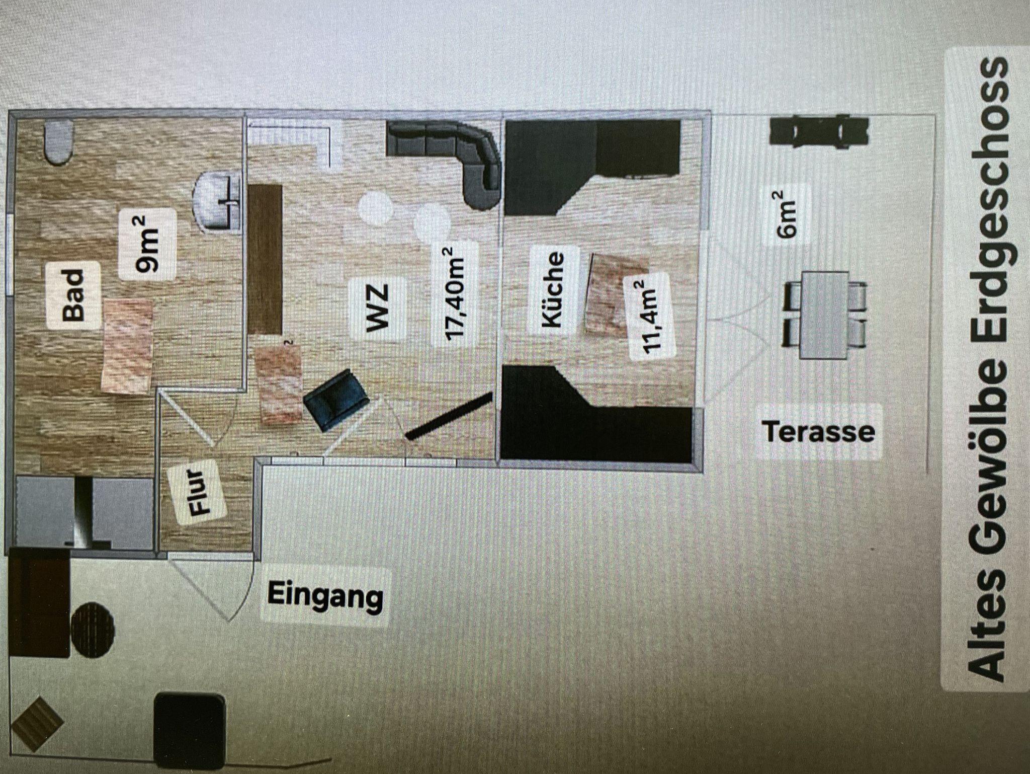 Das 60 m² große Ferienhaus „Altes Gewölbe“ erstreckt sich über 2 Etagen und eignet sich ideal für 3 Personen. Auf Anfrage findet ein Kleinkind (bis 3 Jahre) in einem Babybettchen einen Schlafplatz. In der unteren Ebene befindet sich ein gemütliches Wohnzimmer mit einem Sofa, Sessel sowie einem großen Smart-TV der für Unterhaltung sorgt. Ein elektrischer Kamin hingegen verbreitet angenehme Wärme und Wohlbehagen. Die modern eingerichtete Küche verfügt über einen großen Kühlschrank mit Gefriermöglichkeit, einem Backofen, Mikrowelle, Geschirrspüler. Weiterhin gehört ein Kaffeevollautomat, Toaster und Wasserkocher zur Ausstattung. Eine Waschmaschine mit Trockner runden das Angebot ab. An warmen Tagen kann man seine Mahlzeiten auf der möblierten Terrasse einnehmen und man hat die Möglichkeit zu grillen. Diese ist direkt von der Küche aus begehbar.
