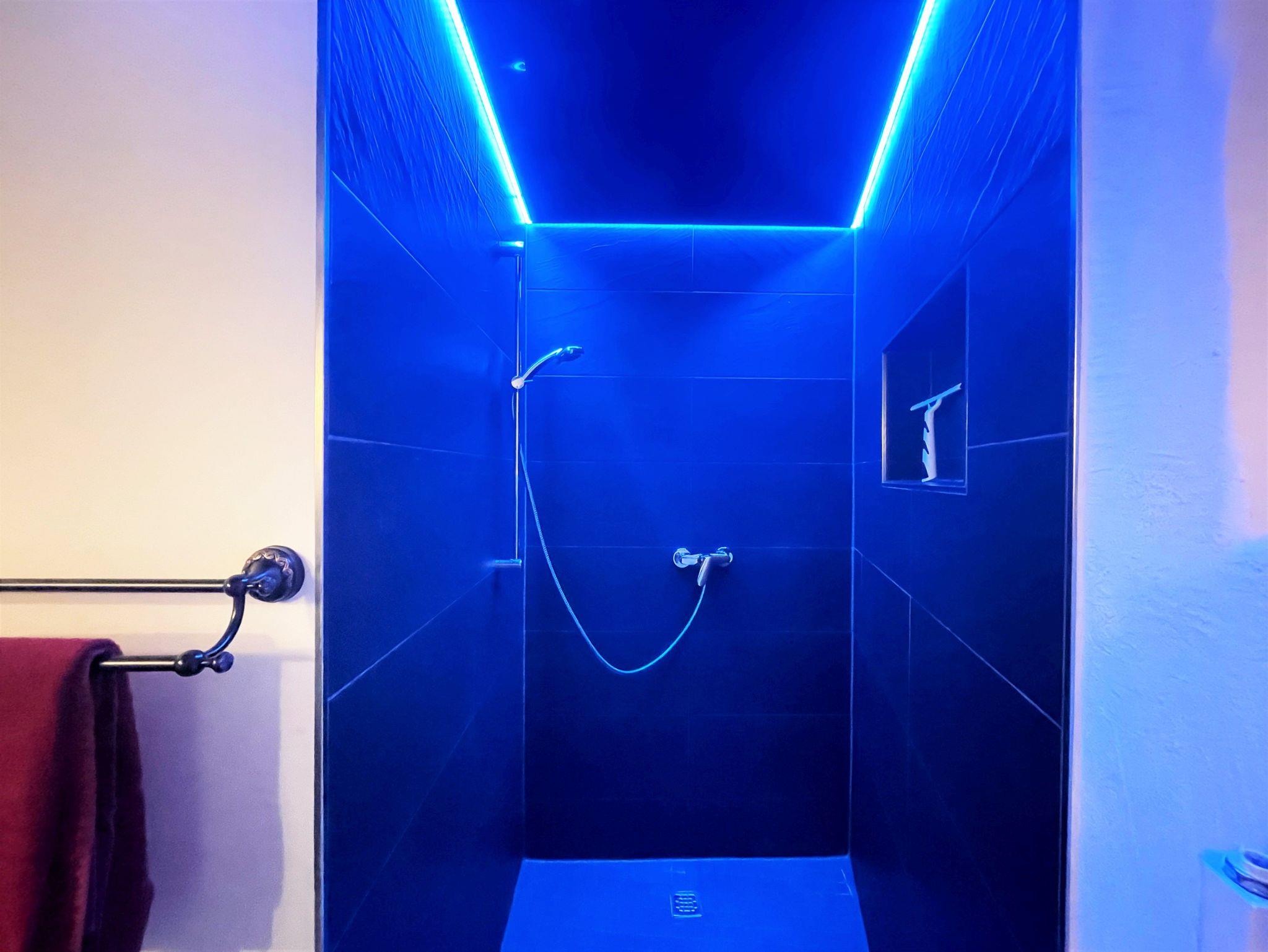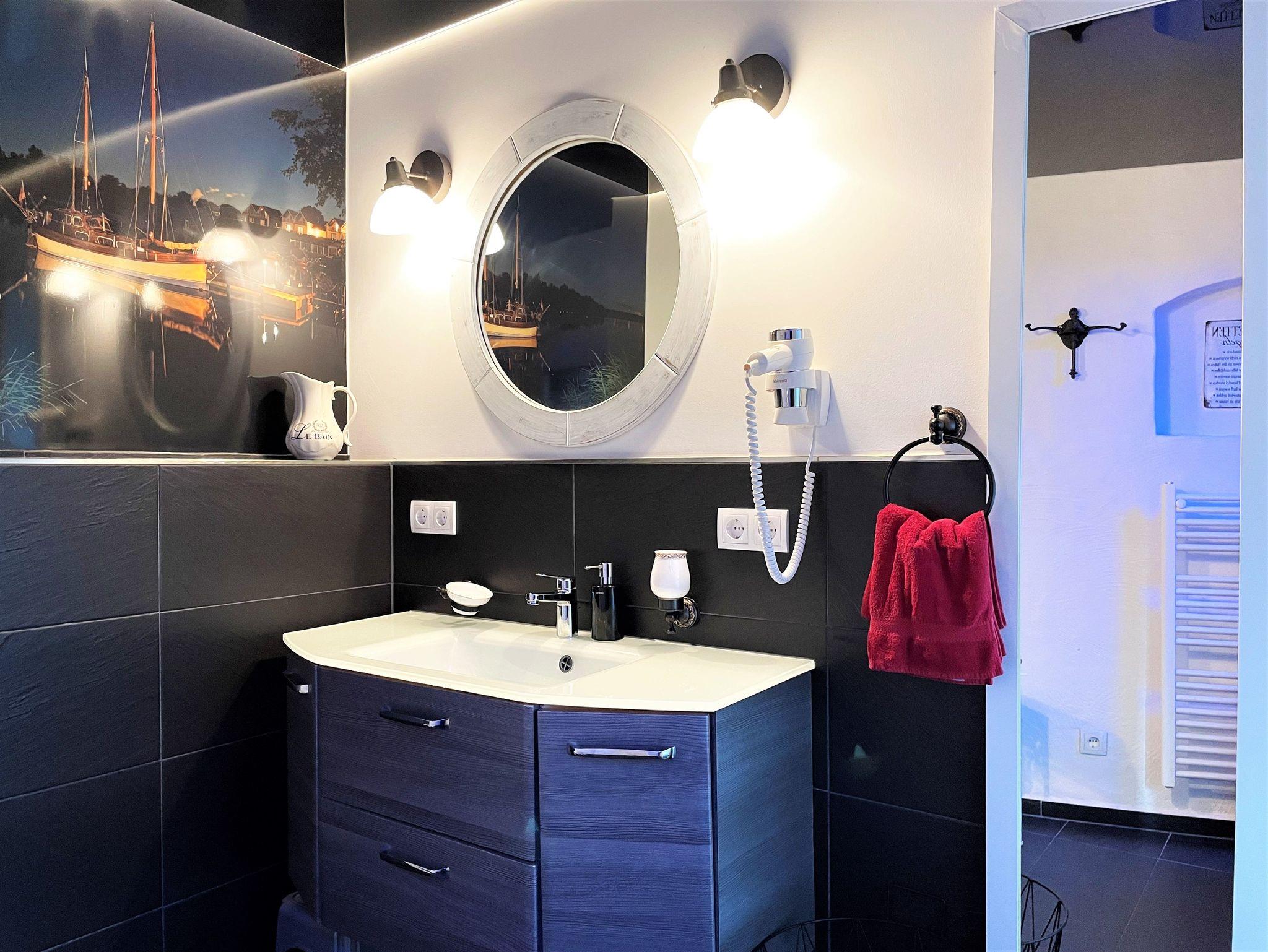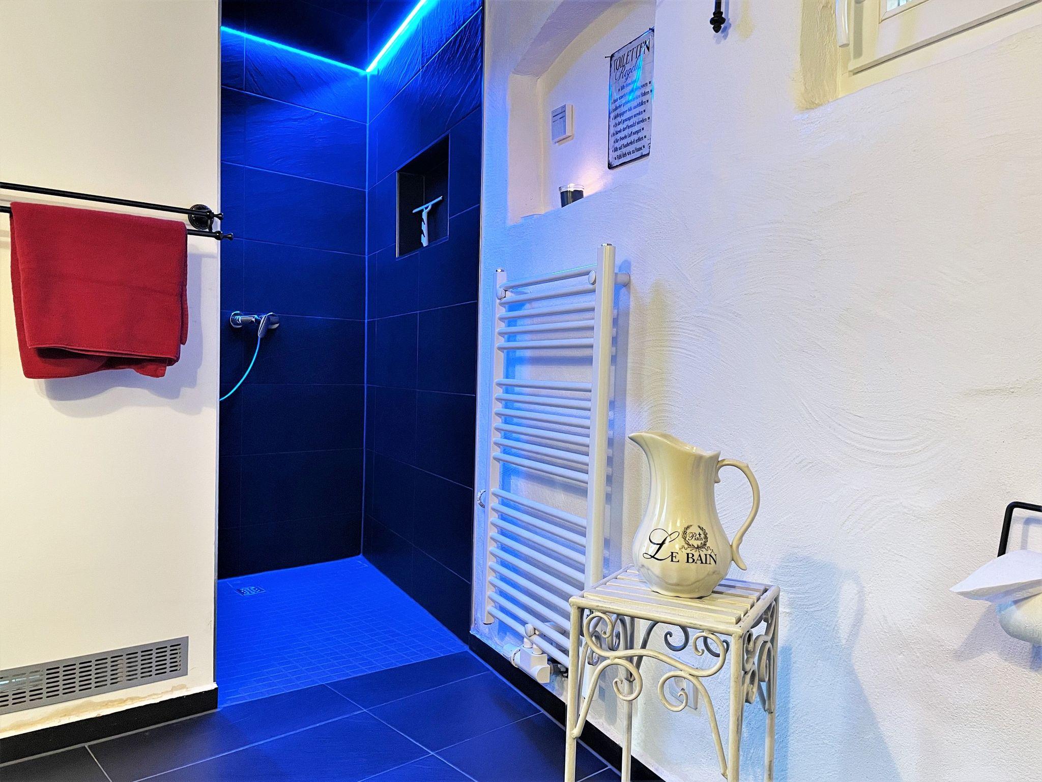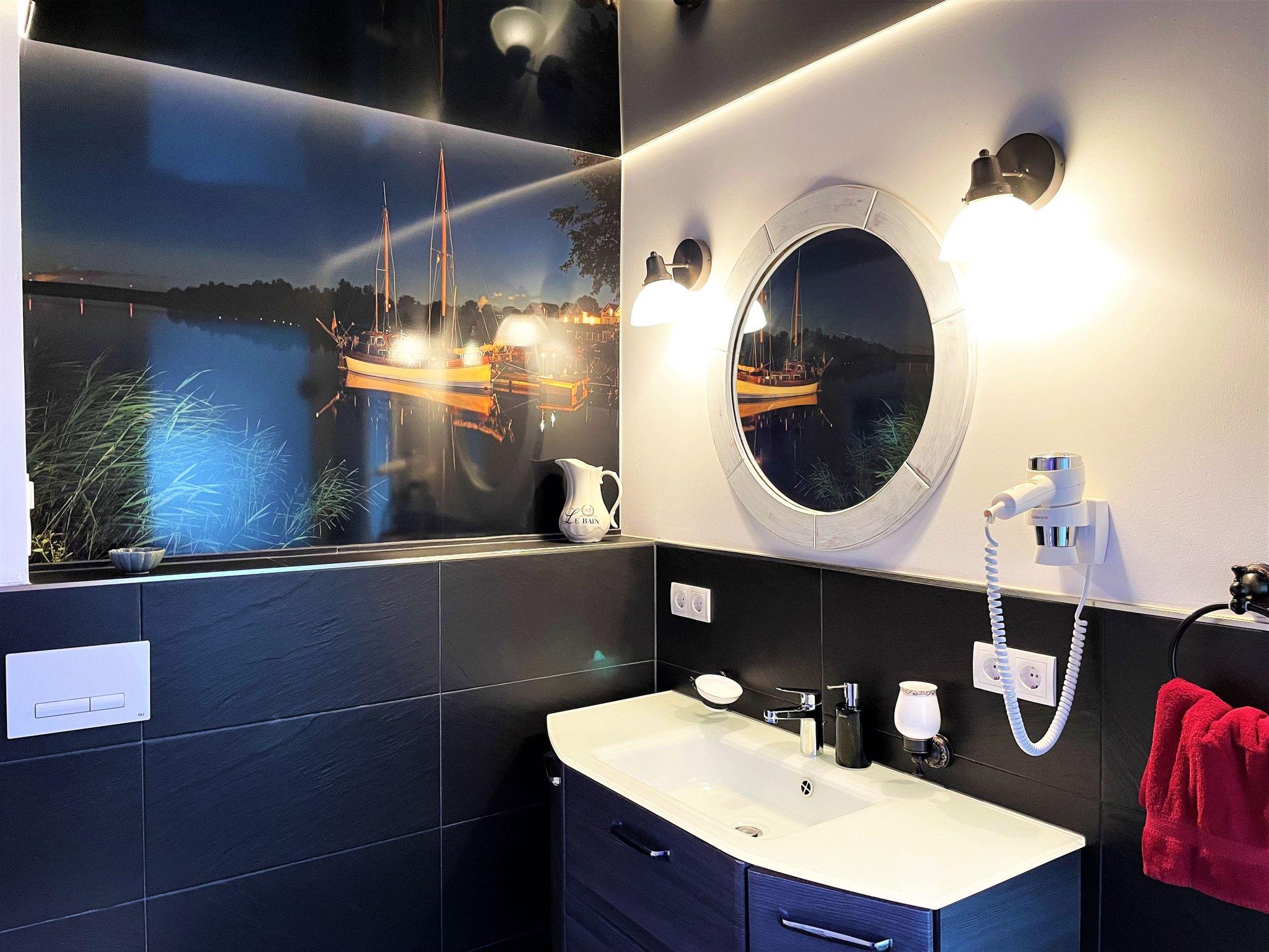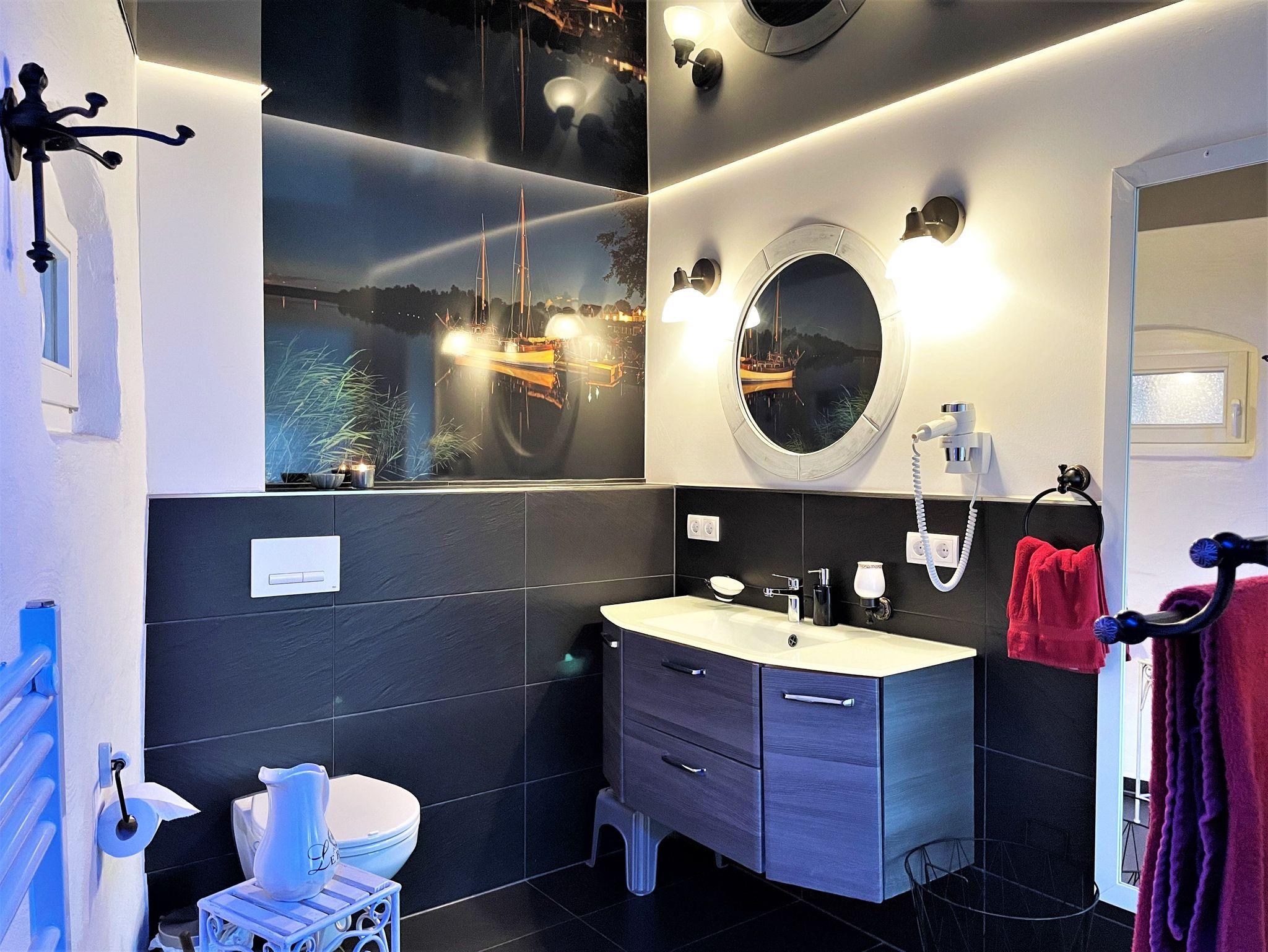 Das stilvoll eingerichtete Bad in der 1. Etage wurde mit einer begehbaren Dusche, WC und einem Waschtisch mit großem Spiegel ausgestattet. Lichtspiele machen auch diesen Ort sehr behaglich.