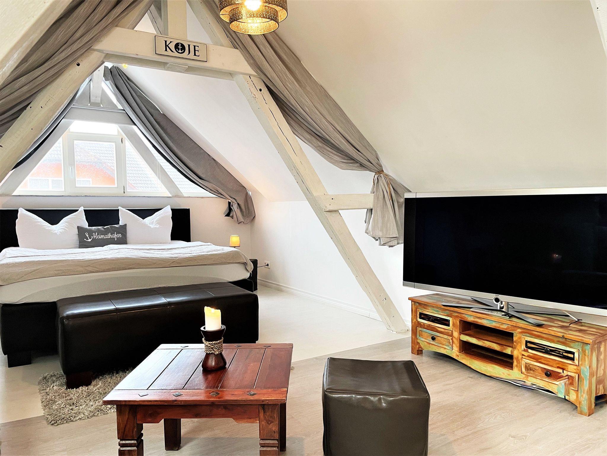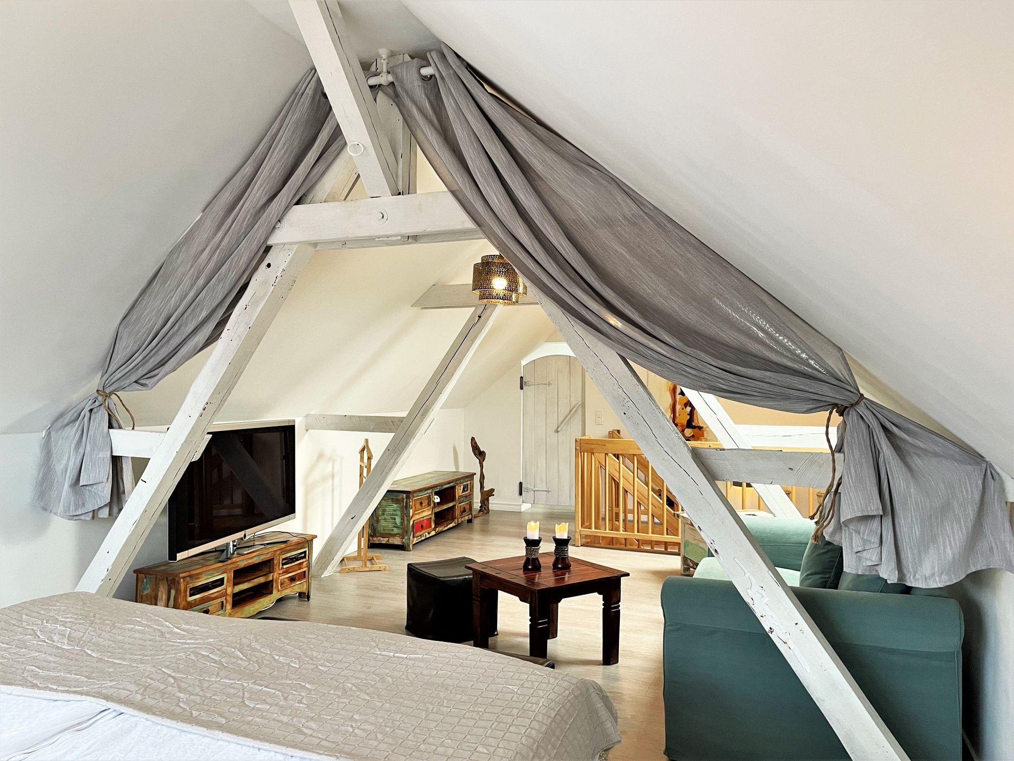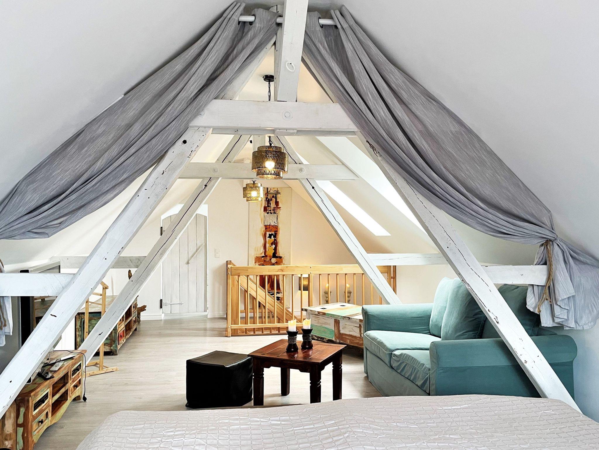 Über eine Treppe erreichen Gäste das geschmackvoll ausgebaute Obergeschoss, welches als Schlafzimmer im romantischen Ambiente erscheint. Ein Doppelbett sowie ein kleiner Zweisitzer reihen sich perfekt in das Ambiente ein. Auch hier hat man die Möglichkeit, über einen weiteren Smart-TV den Abend ausklingen zu lassen.