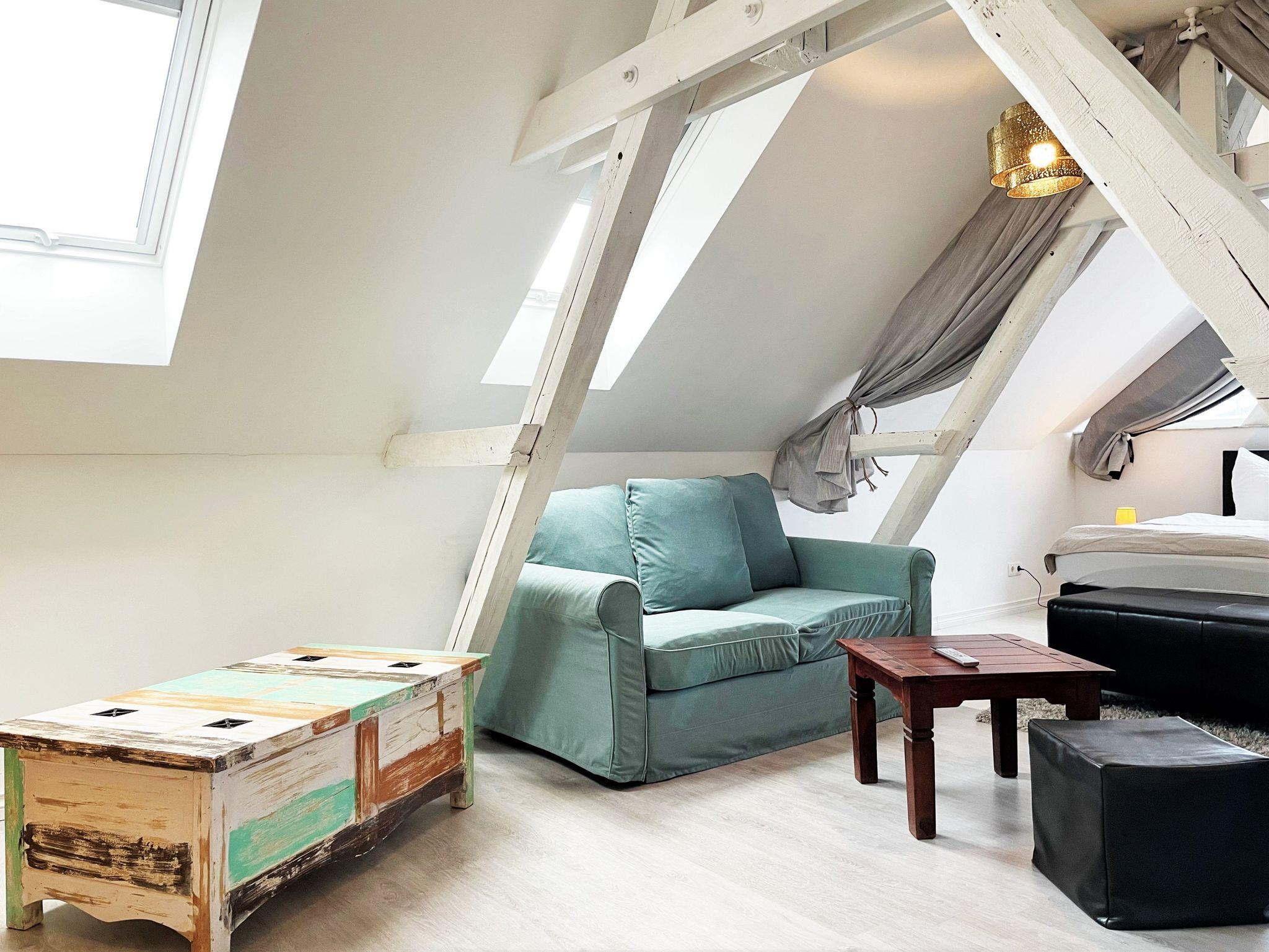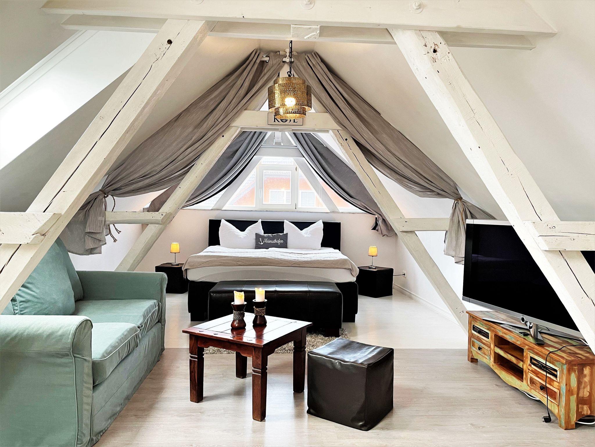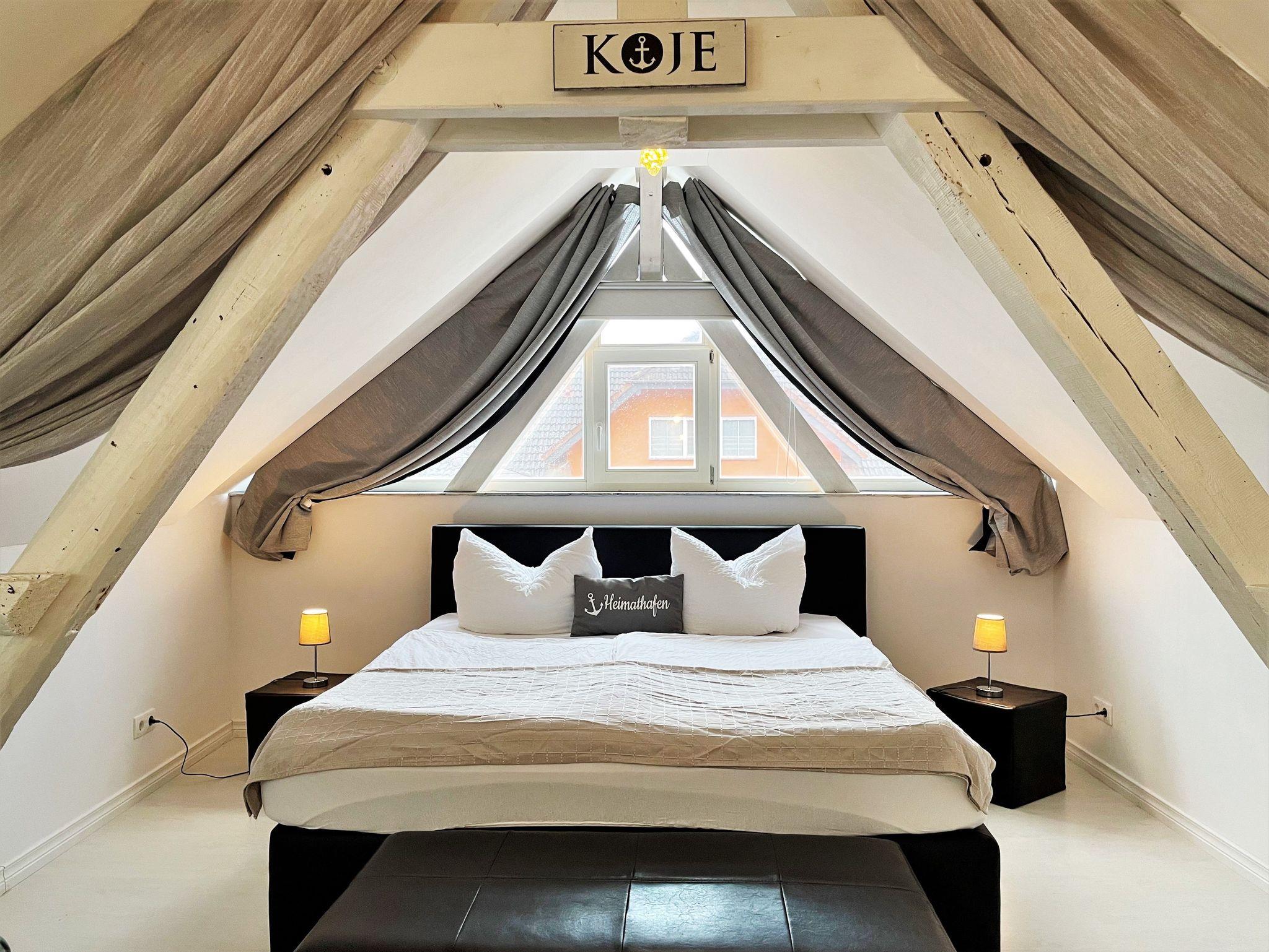 Über eine Treppe erreichen Gäste das geschmackvoll ausgebaute Obergeschoss, welches als Schlafzimmer im romantischen Ambiente erscheint. Ein Doppelbett sowie ein kleiner Zweisitzer reihen sich perfekt in das Ambiente ein. Auch hier hat man die Möglichkeit, über einen weiteren Smart-TV den Abend ausklingen zu lassen.