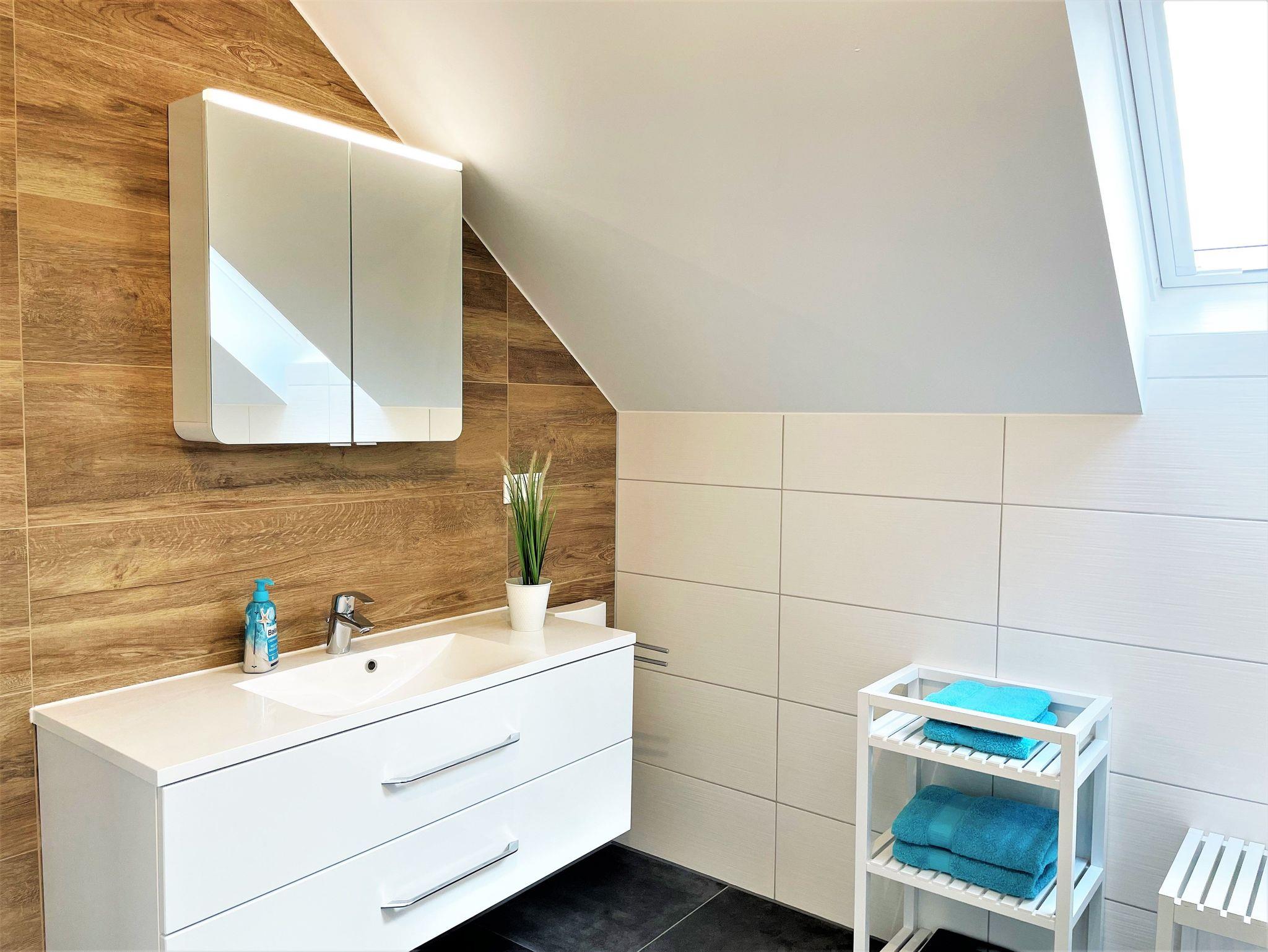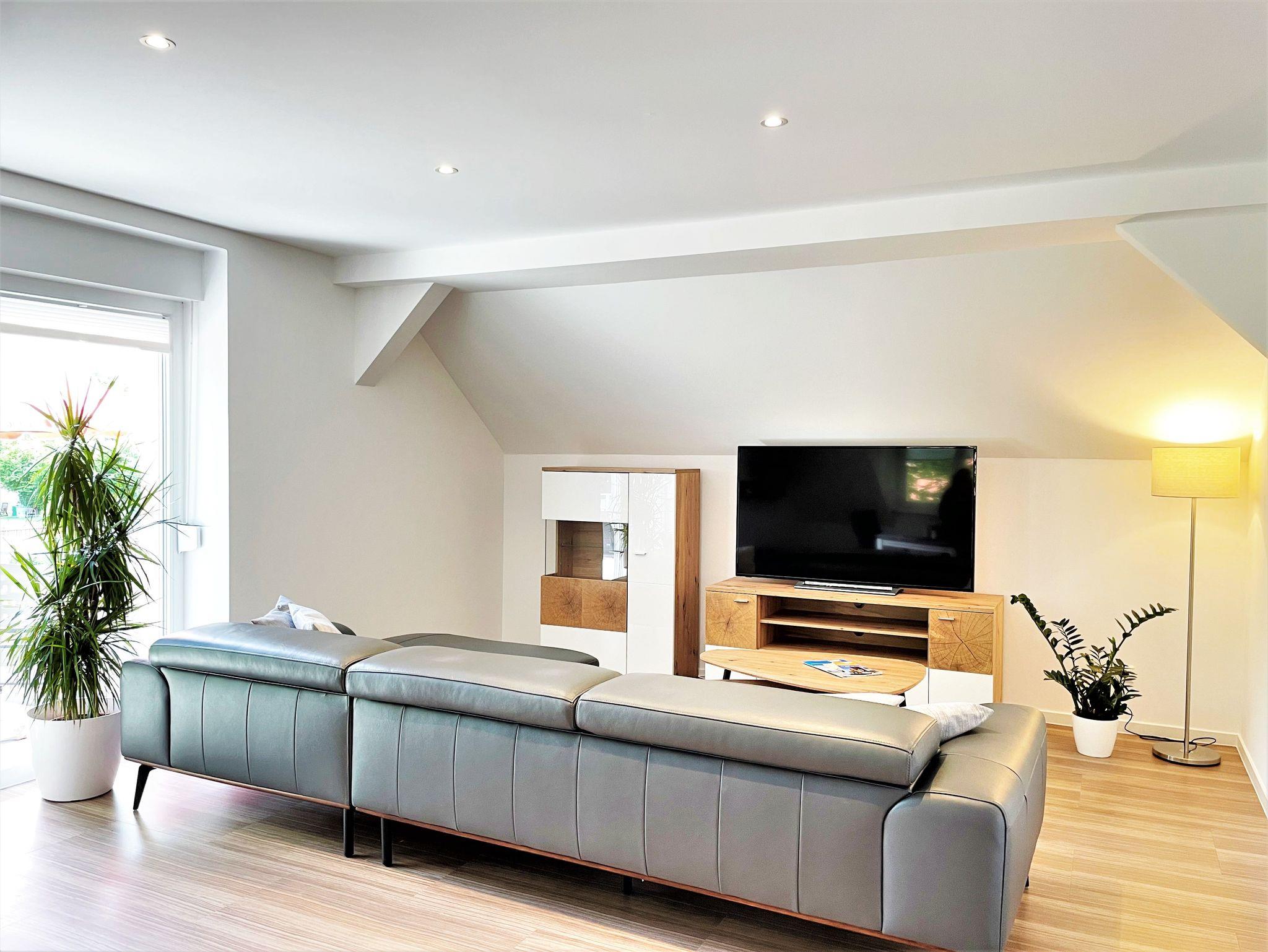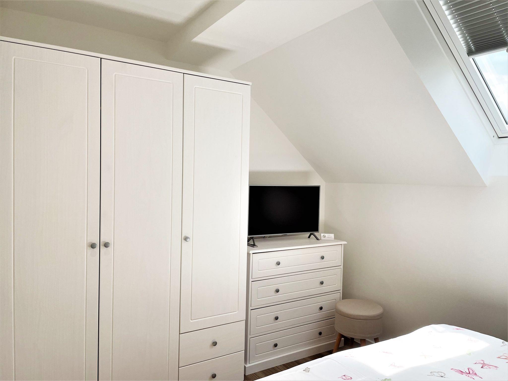 Die 86 m² große Nichtraucherferienwohnung hat 3 Zimmer, befindet sich in der oberen Etage und eignet sich ideal für 4 Personen. Alle Zimmer sind farblich, hell und harmonisch aufeinander abgestimmt. Das Wohnzimmer ist mit einer modernen Schrankwand, großem TV-Flachbildschirm und einem bequemen Ecksofa eingerichtet. Weiterhin befindet sich ein Esstisch im Wohnzimmer, an dem 4 Personen speisen können. Ein Schlafzimmer verfügt über 2 getrennt stehende Schlafmöglichkeiten und einer Kommode. Im 2 Schlafzimmer steht Gästen ein Boxspringbett zu Verfügung sowie ein großer Kleiderschrank, Kommode und ein TV-Flachbildschirm.
