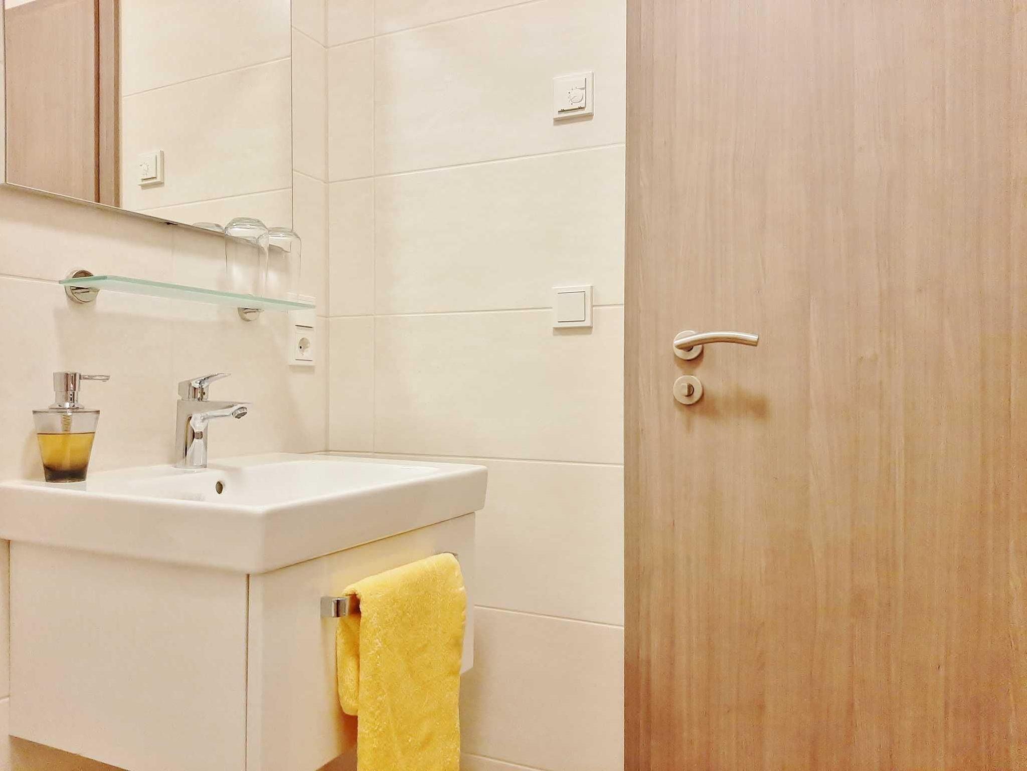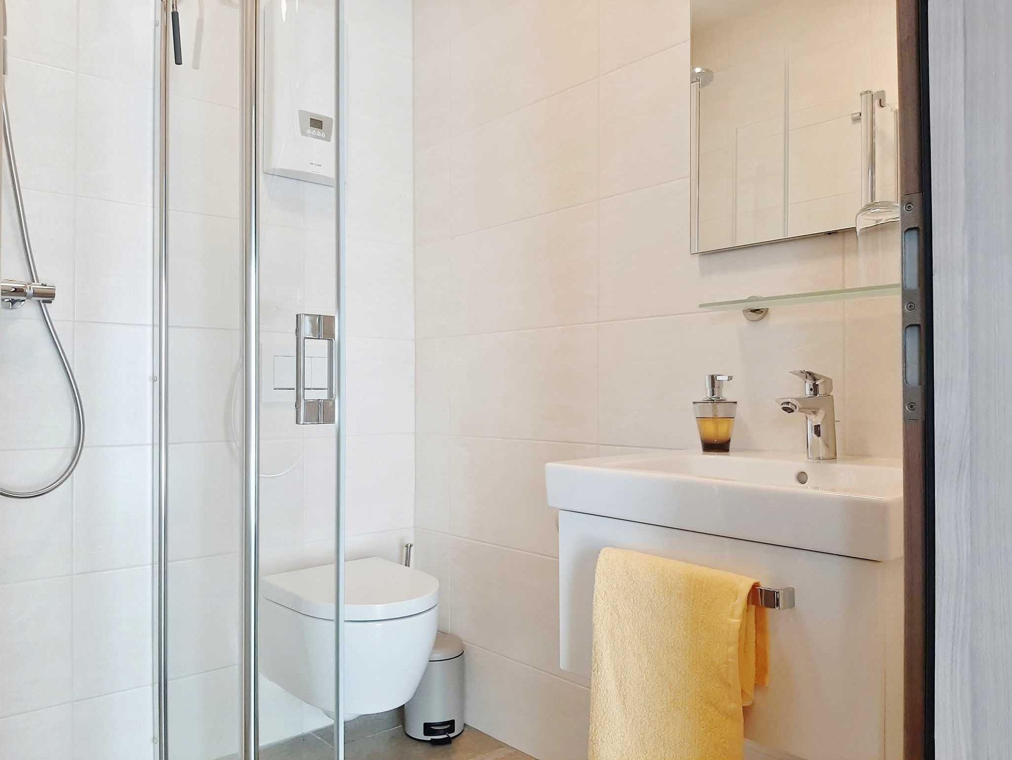 ein. Das kleine Badezimmer ist mit Dusche, WC und Föhn ausgestattet. Ein