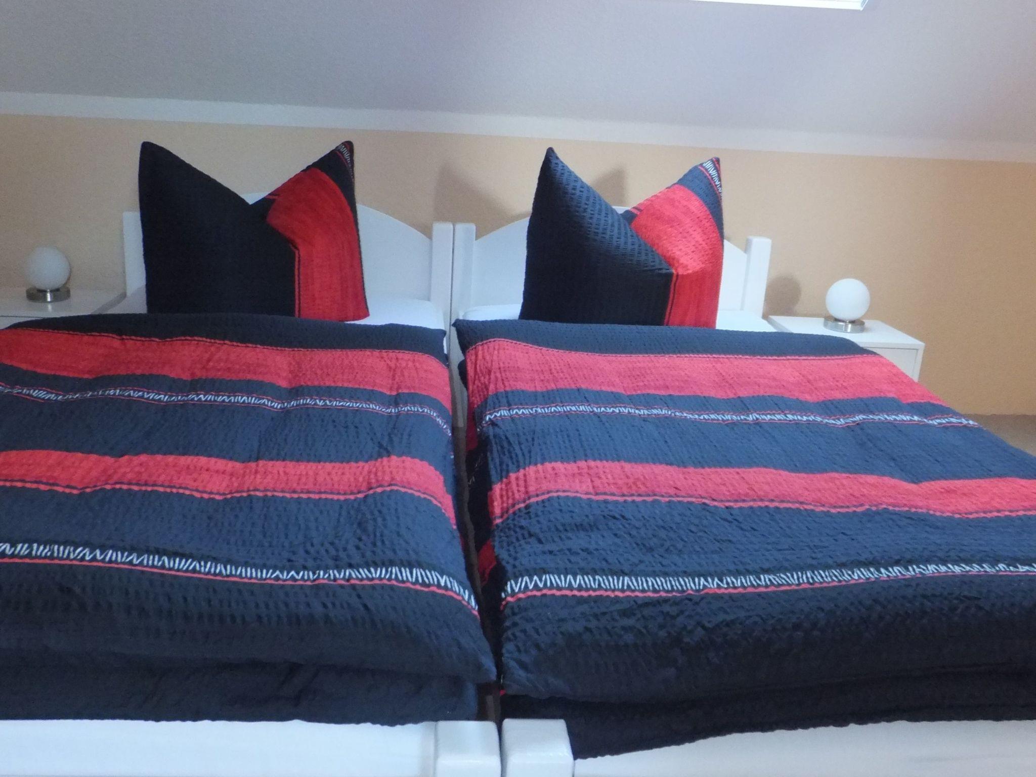 The holiday flat has a living space of 75 m² and is located on the first floor of the two-storey house. It was last renovated in January 2016 and is now being offered as a holiday flat. As the flat was used by the owner family themselves before the renovation, it is furnished to a high standard and suitable for children for a relaxing stay. Due to its location on the upper floor, which is also the top floor of the house, the interior is somewhat larger and has a very cosy feel. The holiday accommodation is divided into two double bedrooms, a spacious living room with a comfortable lounge area and flat-screen TV, a separate kitchen-diner and a bathroom with a corner bath and WC. The two bedrooms are each furnished with two single beds measuring 90 cm x 200 cm, which are set up next to each other as a double bed. The sleeping area is always surrounded by two bedside tables with reading lamps on both sides. There is also a cot/baby bed in one of the bedrooms. The heart of the flat is the friendly living room, decorated in warm colours. Here you can relax and socialise on a U-shaped lounge area after a day out. The flat-screen TV with satellite TV provides entertainment in the evening. There is also a free Internet connection via WLAN. From the living room, you can access the balcony through an external door, allowing plenty of natural light to pleasantly illuminate the interior. In the separate fitted kitchen, you can prepare your own meals using a cooker with four-zone ceramic hob and oven, a fridge with freezer compartment, a dishwasher and small electrical appliances such as a microwave, coffee machine, toaster and kettle. In front of the corner kitchen, four people can enjoy a meal together. A high chair is also available.