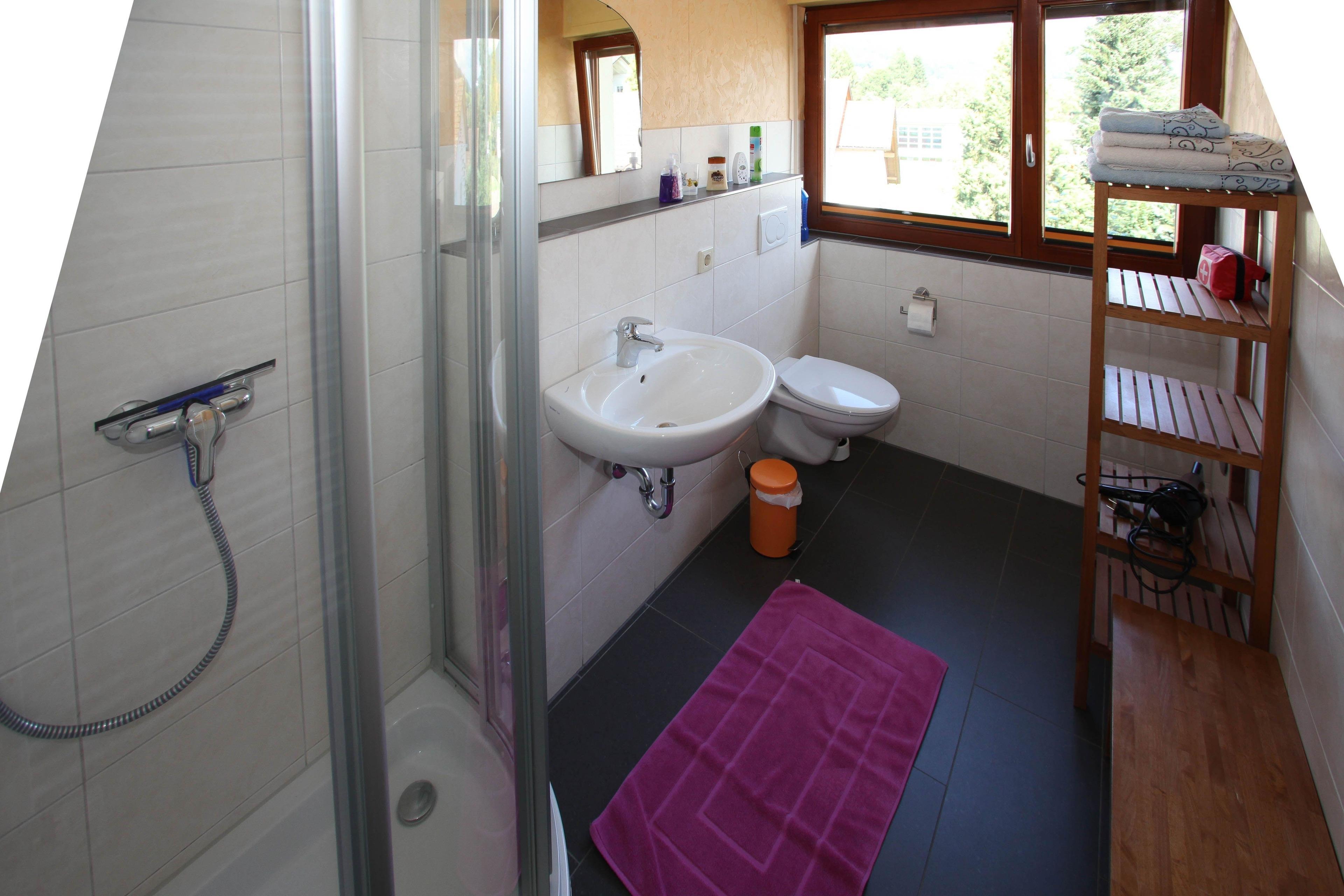 Das moderne Badezimmer ist mit einer Dusche, WC und Waschbecken versehen.