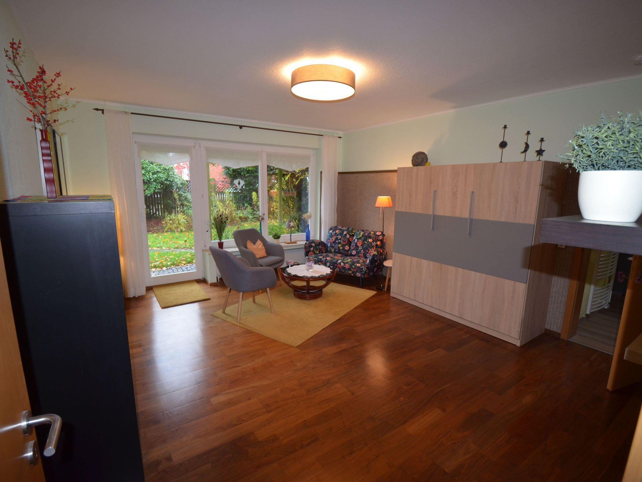 Großzügige stilvolle Wohnung für zwei Personen im ERdgeschoss mit der Option zweier weiterer Schlafplätze. Sehr ruhige Wohnlage gelegen im ruhigen Garten hinter dem Wohnhaus. Liebevoll gestaltetes Ambiente, Bettwäsche, Handtücher und Haarföhn sind vorhanden. Freundlicher Vermieter, der auch englisch spricht. 64 qm ebenerdige Wohnfläche mit geräumigem Duschbad, großem Kleiderschrank im Flur zwischen Bad und Schlafzimmer, Zugang zum Garten aus dem Wohnzimmer und der Eingangstür. Wohnzimmer mit TV mit SAT-Anschluss, WLAN, LAN, Schlafsofa im Wohnzimmer für zwei weitere Übernachtungsgäste. Funktionale Küche mit Spülmaschine, Cerankochfeld, Umluftherd, Kaffeemaschine, Esstheke, Stilvoller Essplatz in der Eingangsdiele. Außenterrasse mit antiken Gartenmöbeln. Fahrradunterstellmöglichkeit. Fahrradmietmöglichkeit gegen zusätzliche Mietgebühr von Euro 5,--/Tag & Rad. 2-er Canadiervermietung auf Anfrage und gegen zusätzliche Mietgebühr