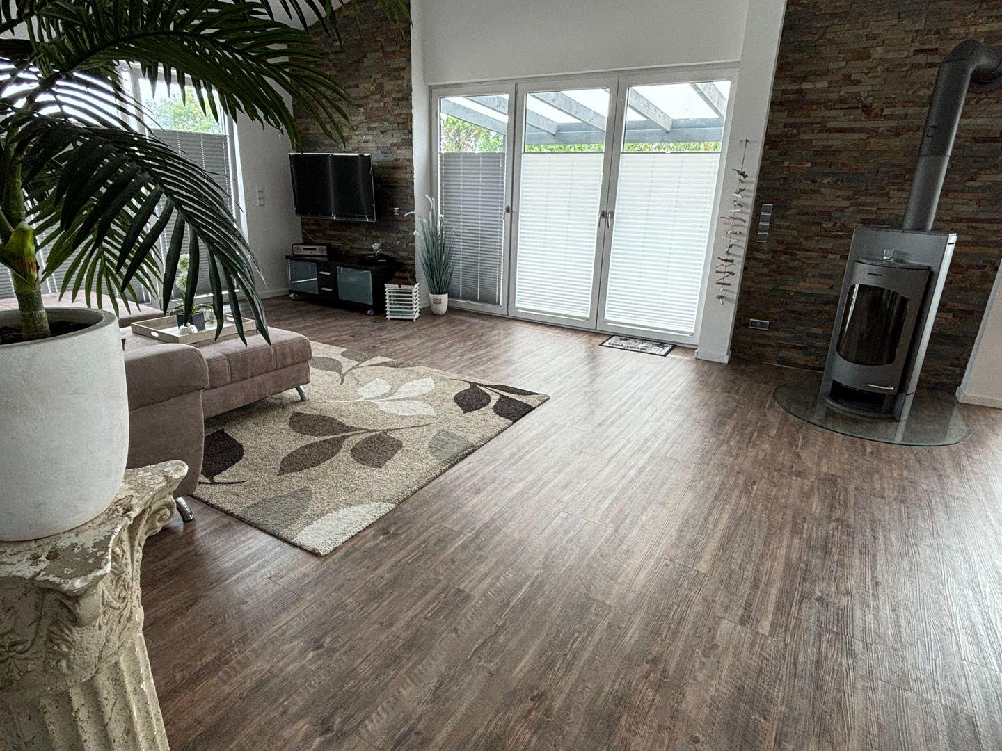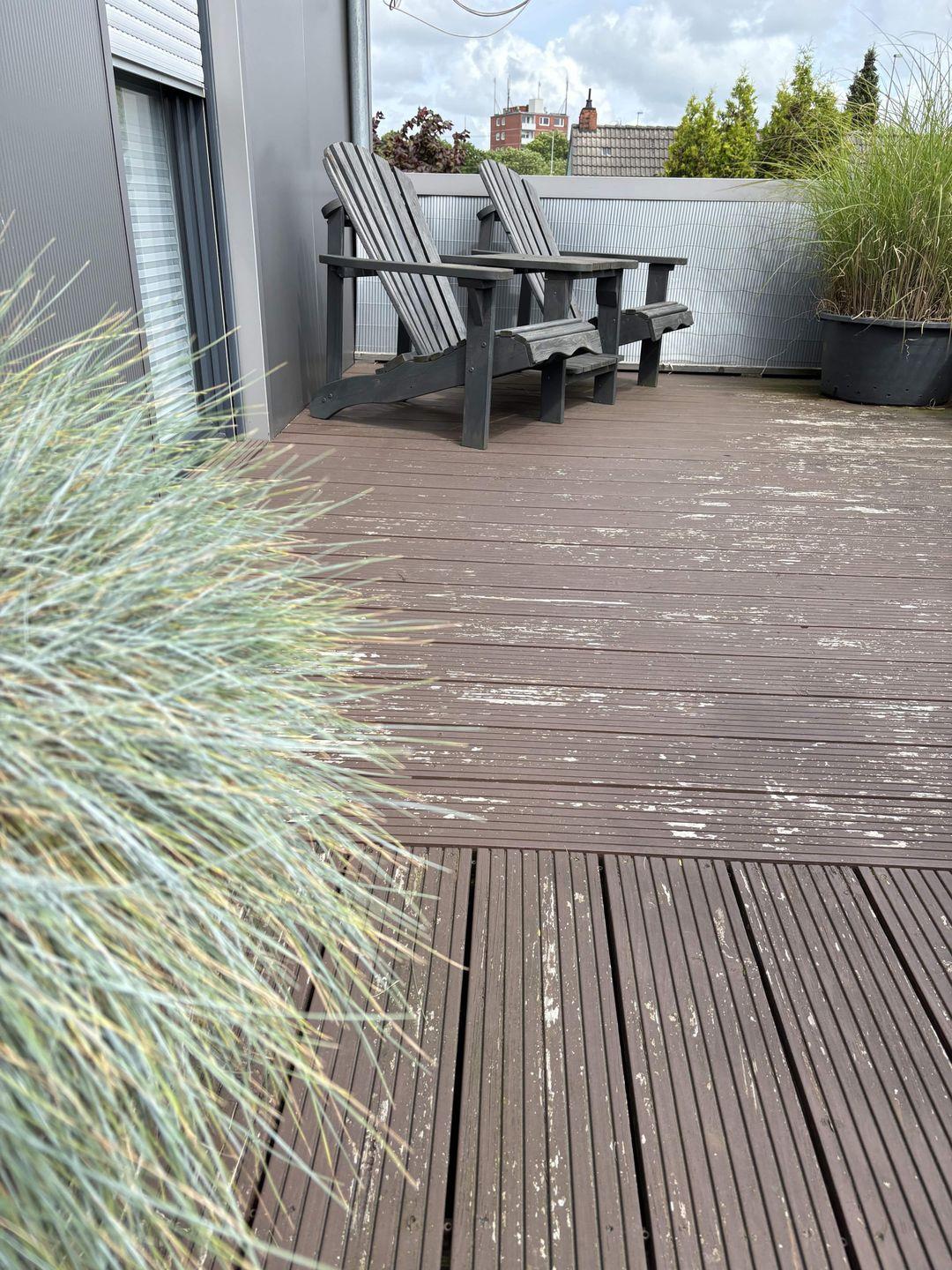 Das Highlight der Wohnung ist der offene Wohn-/Essraum mit hellen Fensterfronten und einer umlaufenden Dachterrasse. Die hohen Decken, der gemütliche Kaminofen und die hochmoderne Einrichtung lassen Ihre Herzen höher schlagen. Die daran angrenzende ca. 110qm große Dachterrasse mit großer Terrassenüberdachung und ihren zahlreichen Sitzgelegenheiten, wie z.B. einem Strandkorb, lädt am Morgen zu einem ausgiebigen Frühstück oder am Abend zu einem Glas Wein ein.