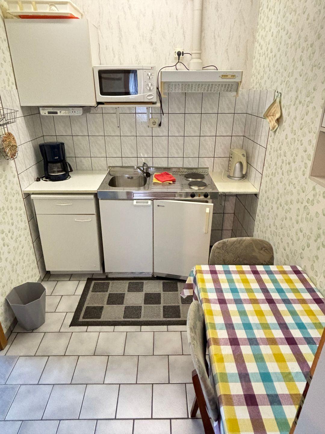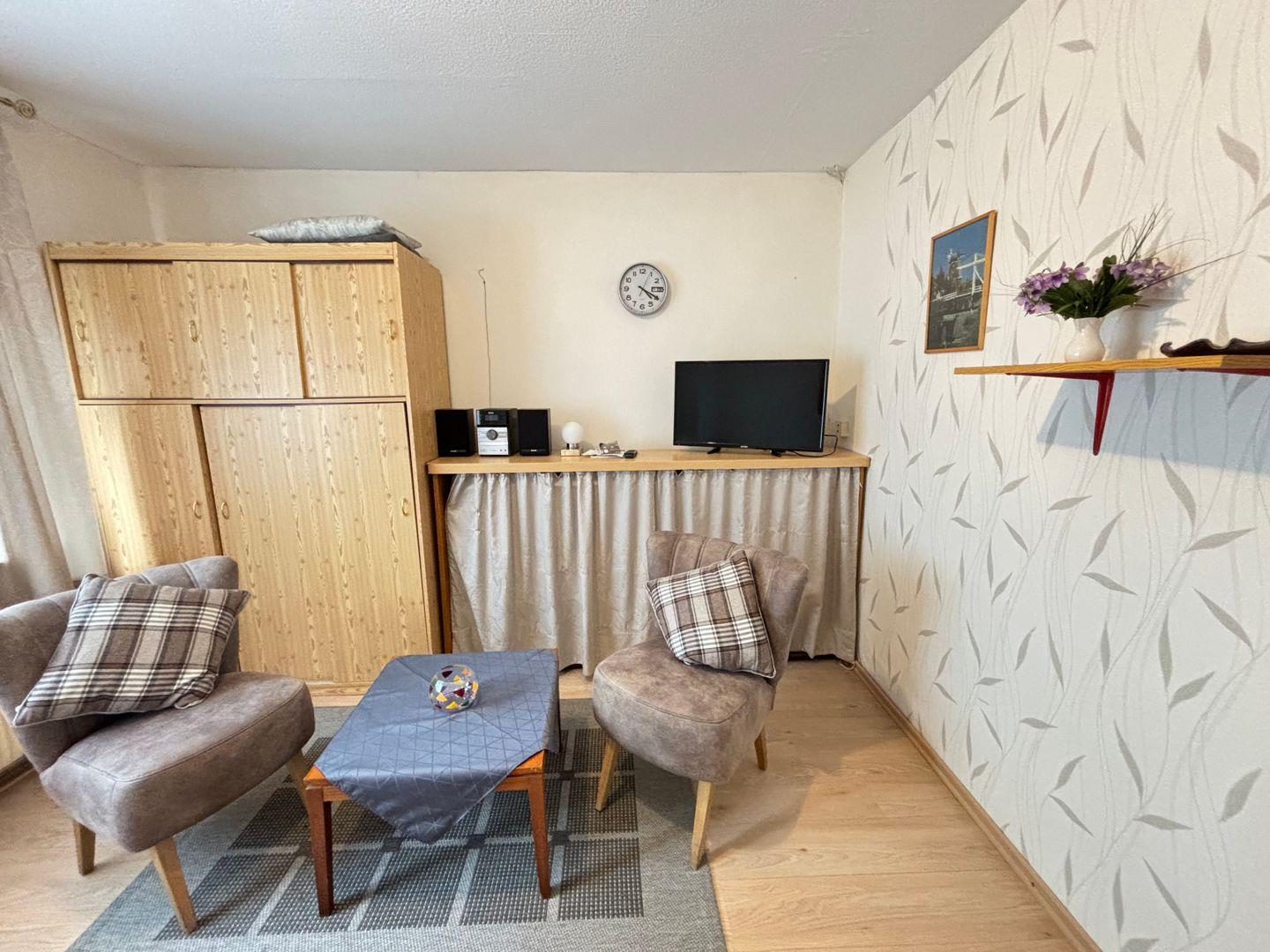 Die Wohnung hat eine Größe von 25m² und ist unterteilt in Wohn-/Schlafzimmer, Kochecke sowie einem Badezimmer. Sie ist für max. 1 Person ausgestattet. Das Bett im Schlafzimmer verfügt über 90x200cm Liegefläche. In der Küchenecke stehen Elektrogeräte wie z. B. Kaffeemaschine, Wasserkocher, Mikrowelle, Toaster sowie eine Kochgelegenheit (mit 2 Herdplatten) zur Verfügung. Selbstverständlich ist auch ein TV und ein Radio vorhanden. Es handelt sich hierbei um eine Nichtraucher-Unterkunft und Haustiere sind leider nicht erlaubt.