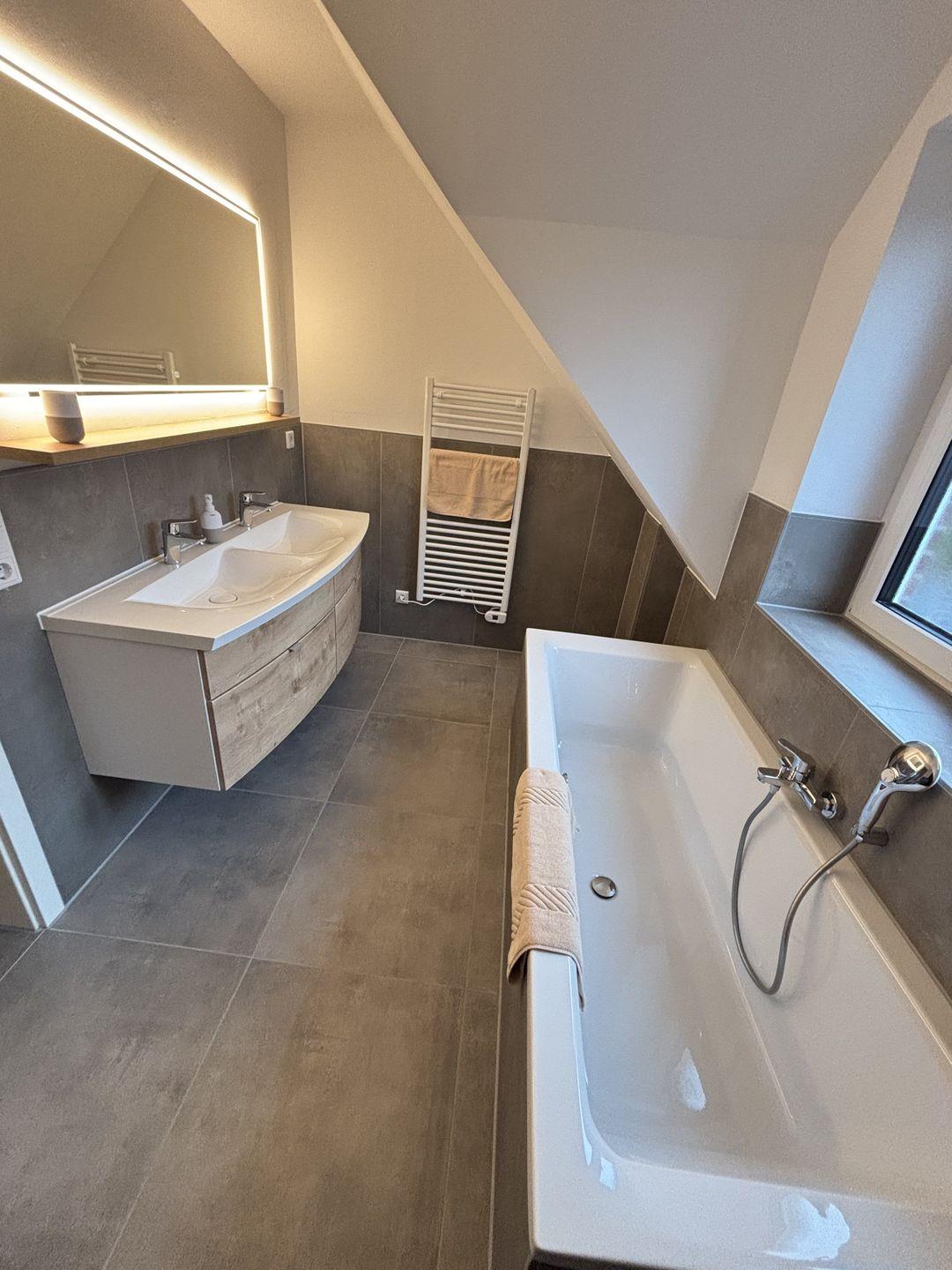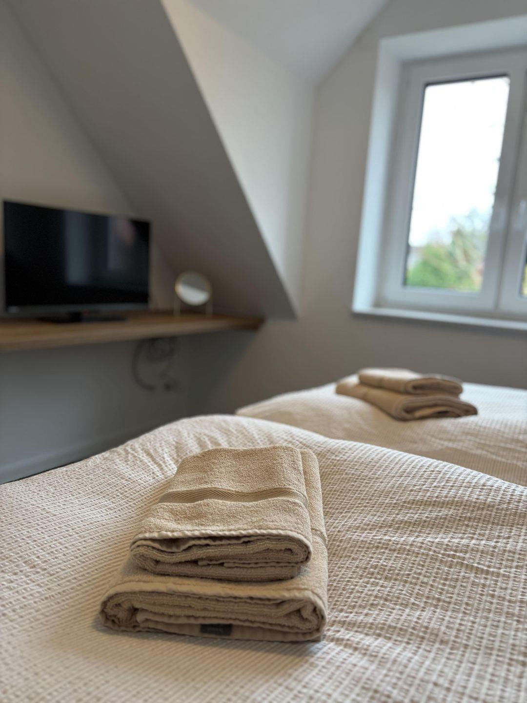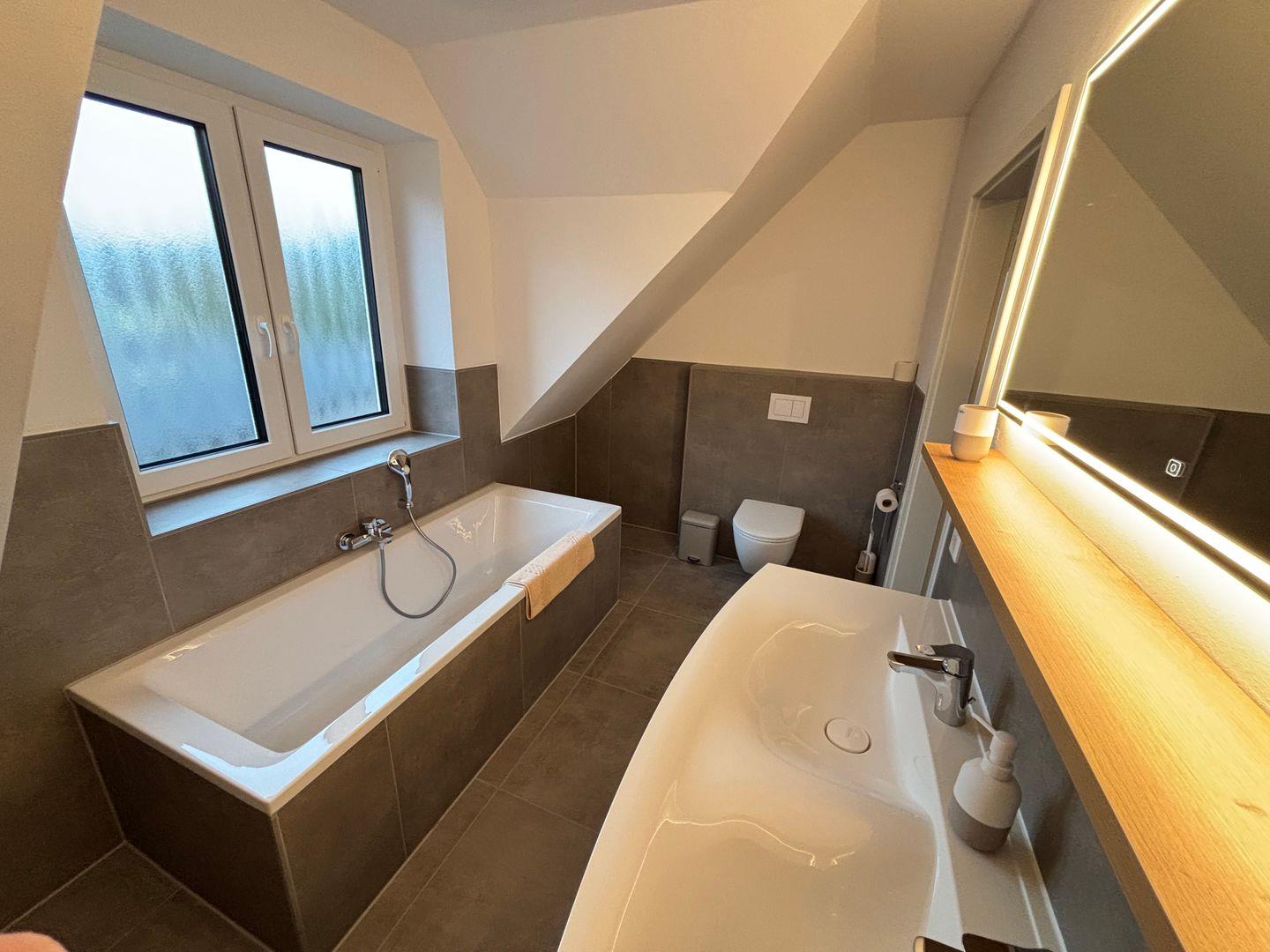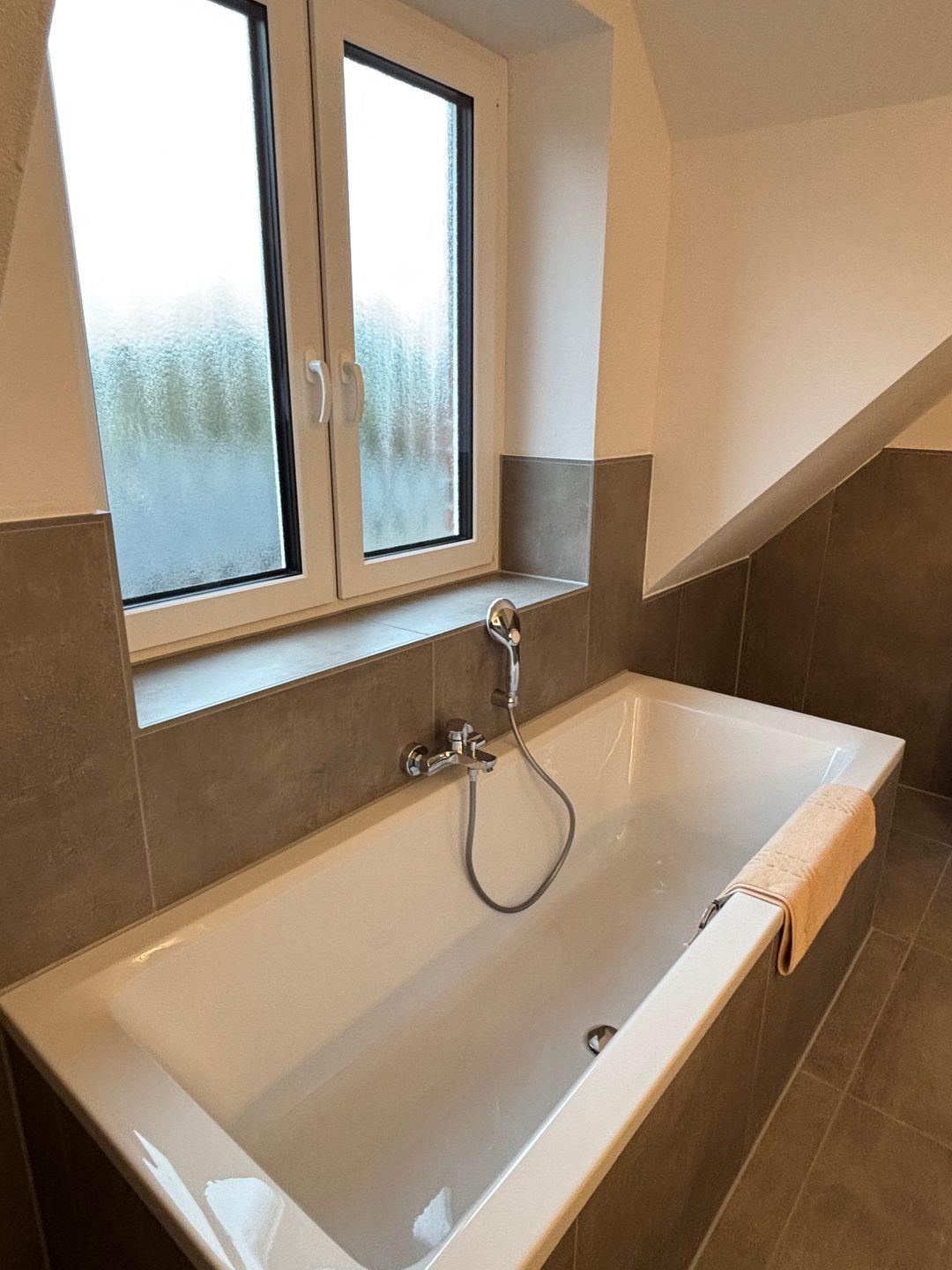 Zwei komfortabel ausgestattete Badezimmer bieten eine hochwertige Sanitärausstattung – darunter ein bodengleiches Duschbad und eine Badewanne im oberen Badezimmer. Haartrockner, Spiegel, Fenster und warmes Wasser runden das Angebot ab. Selbstverständlich stehen kostenfreie Bettwäsche, Handtücher und eine Erstausstattung in Küche und Bad bereit.