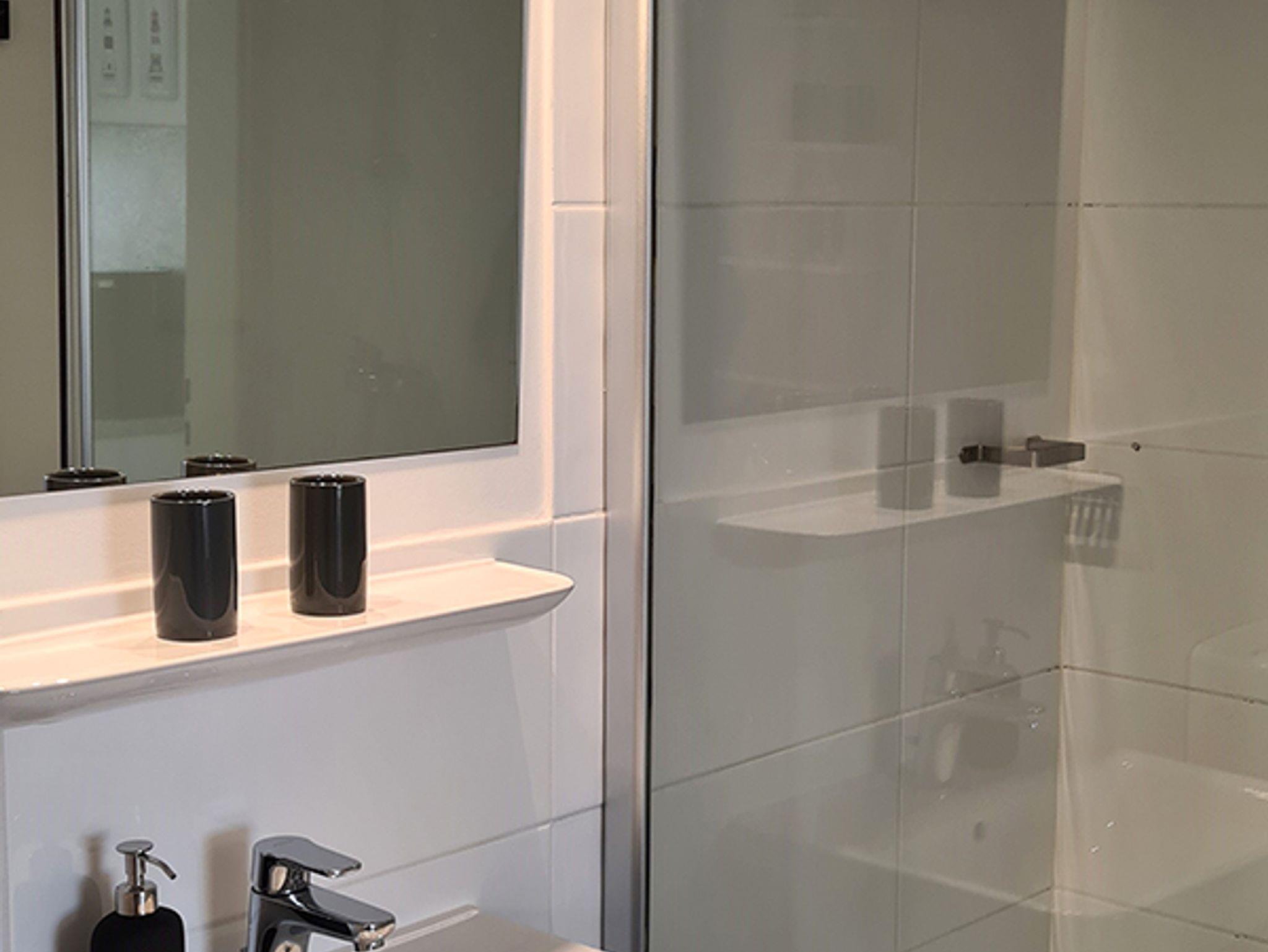 Das Badezimmer ist ausgestattet mit Dusche, Waschbecken, Spiegel, WC und einem Fön.
