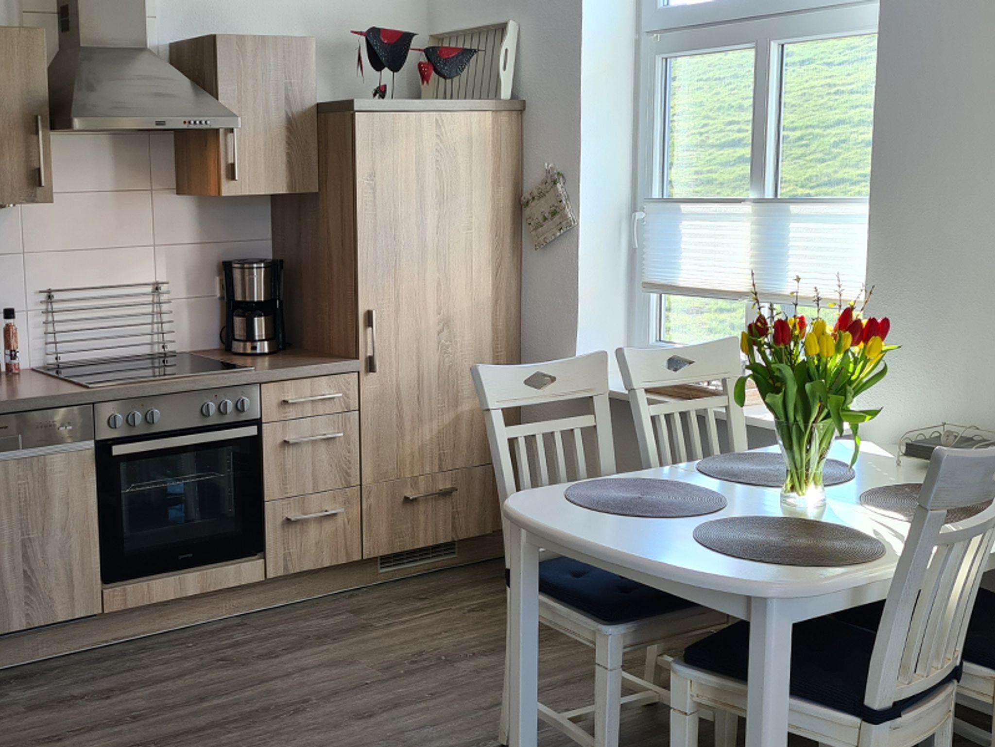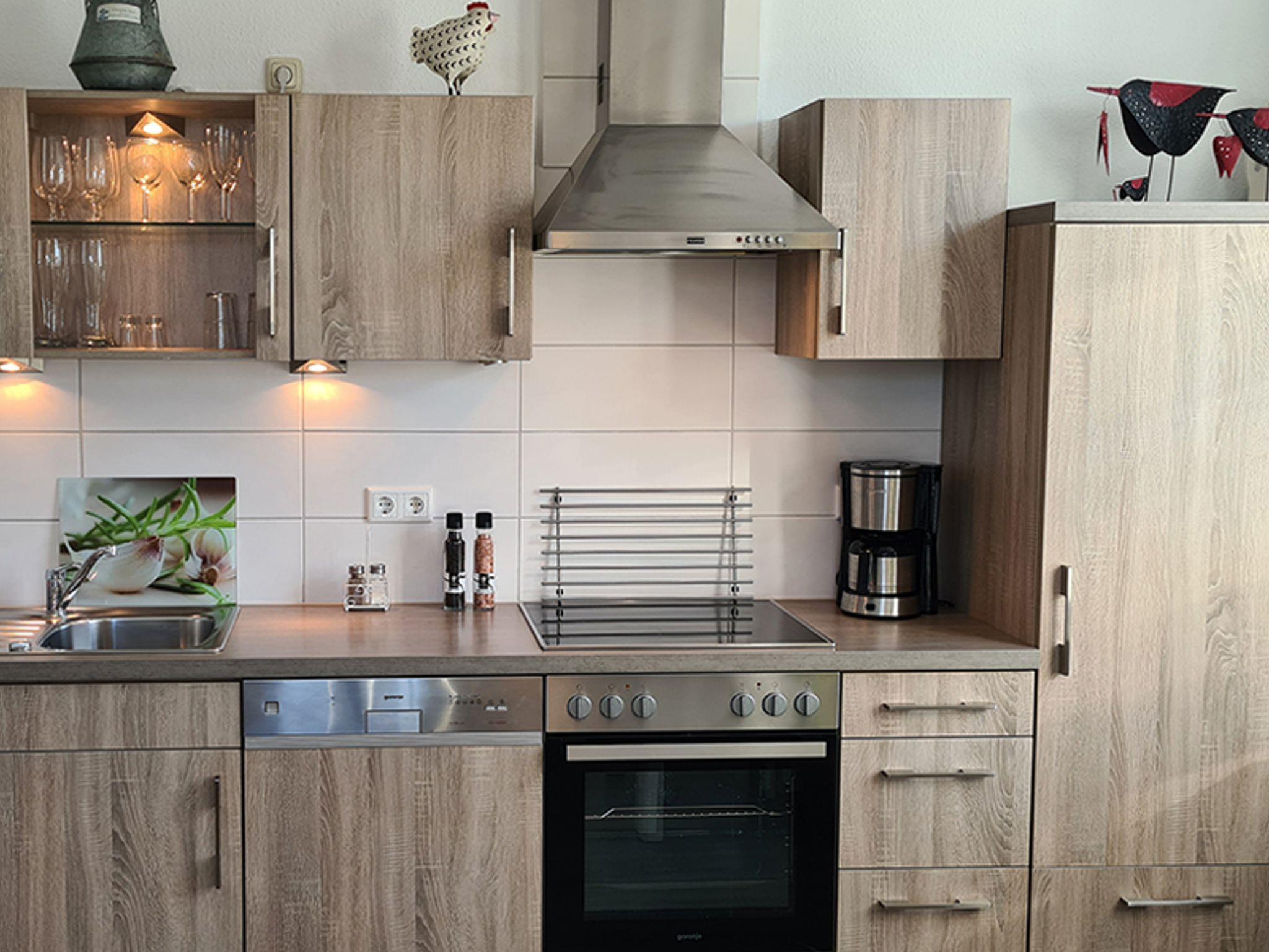 Zur Küchenausstattung gehören ein Cerankochfeld, Backofen, Mikrowelle,Kühlschrank mit Gefrierfach, Spülmaschine, Kaffeemaschine, Wasserkocher, Toaster und ein Handmixer. Außerdem gehört zur Wohnung ein Schlafzimmer mit Doppelbett und Kleiderschrank, sowie einem Flat-TV und Verdunkelungsrollo.