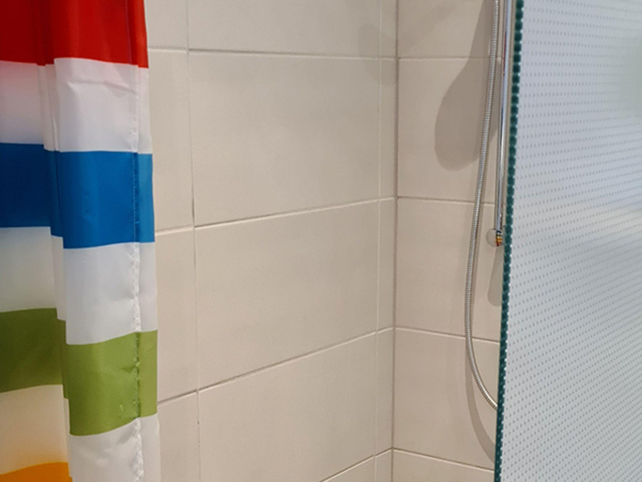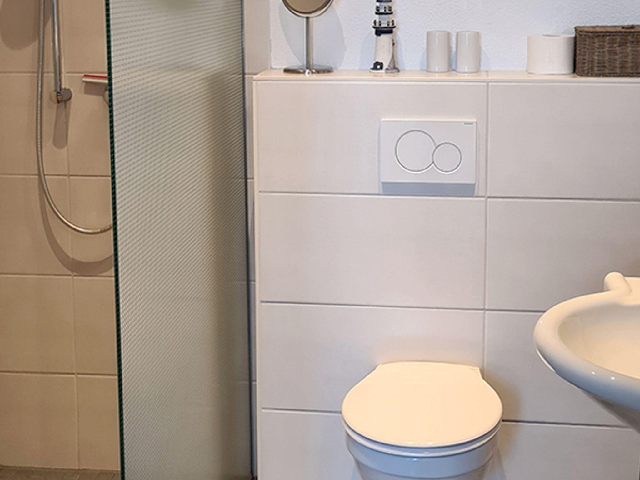 Das Badezimmer geht vom Schlafzimmer durch eine Milchglasschiebetür ab und verfügt über eine ebenerdige Duschkabine, Hänge-WC, Fön und Waschbecken. Die Wohnung ist mit Fliegengittern ausgestattet und sehr modern und hell und liebevoll gemütlich eingerichtet.